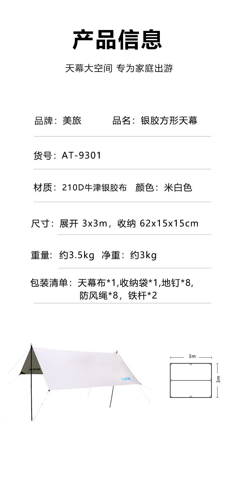 Auto Travel美旅 户外露营银胶3x3M方形天幕 AT-9301