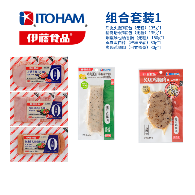 【下单后次周二起发货】(仅上海/北京地区)ITOHAM伊藤食品 后腿火腿3联包(无糖)&精肉培根3联包(无糖)&烟熏维也纳香肠(无糖)&鸡肉蛋白棒(柠檬罗勒)&炙烧鸡腿肉(日式照烧) 组合套装1