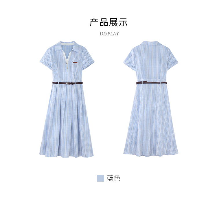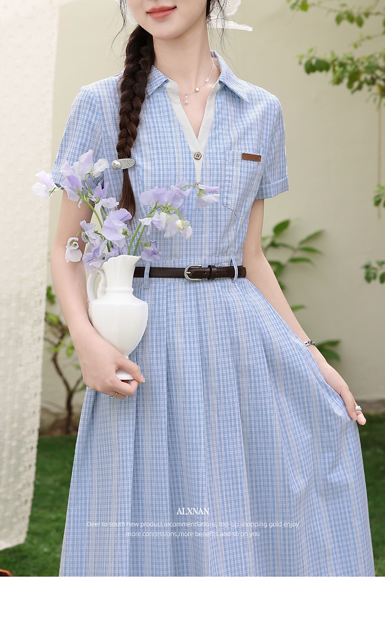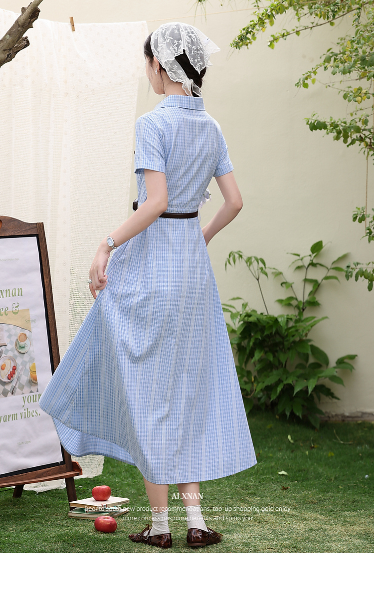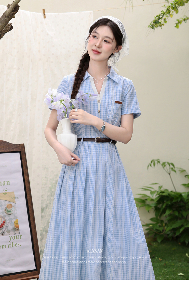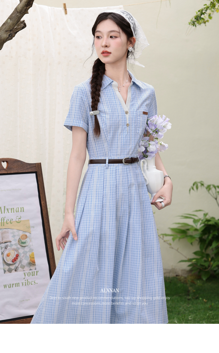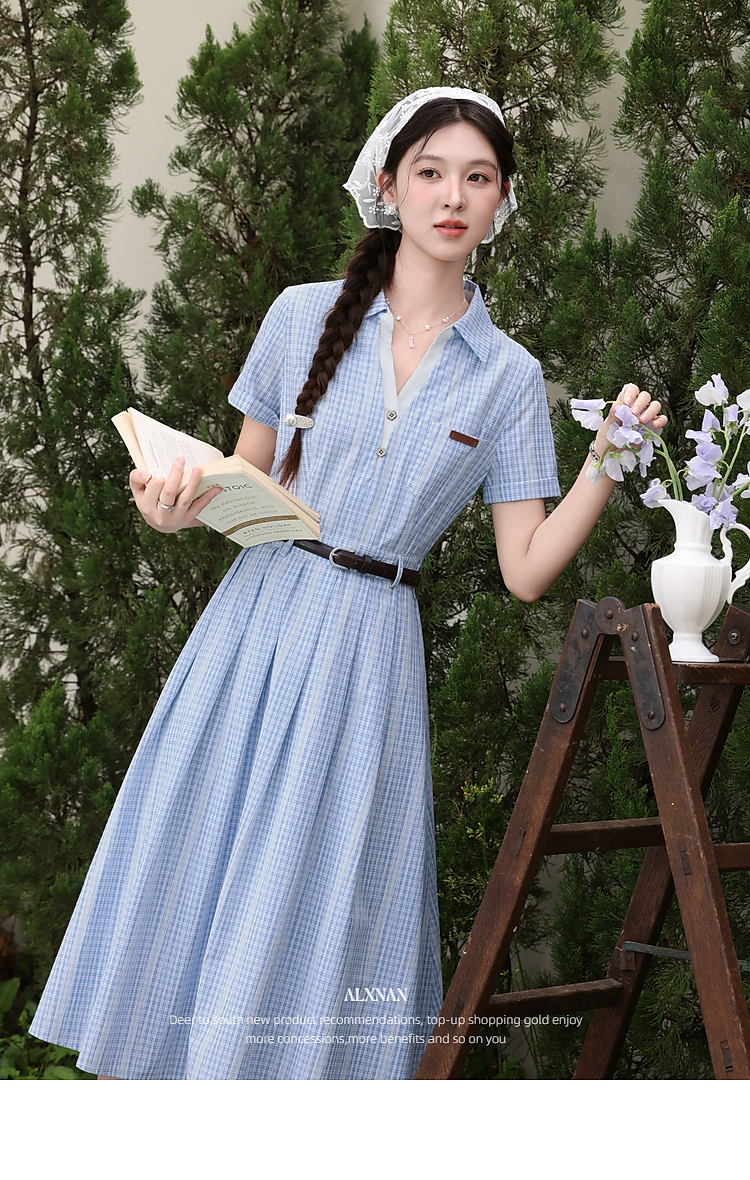 鹿向南「温柔格调」法式气质通勤蓝色设计感收腰格纹短袖连衣裙
