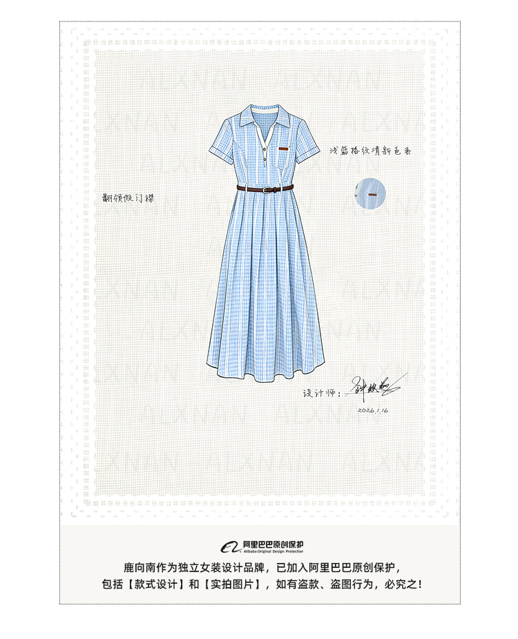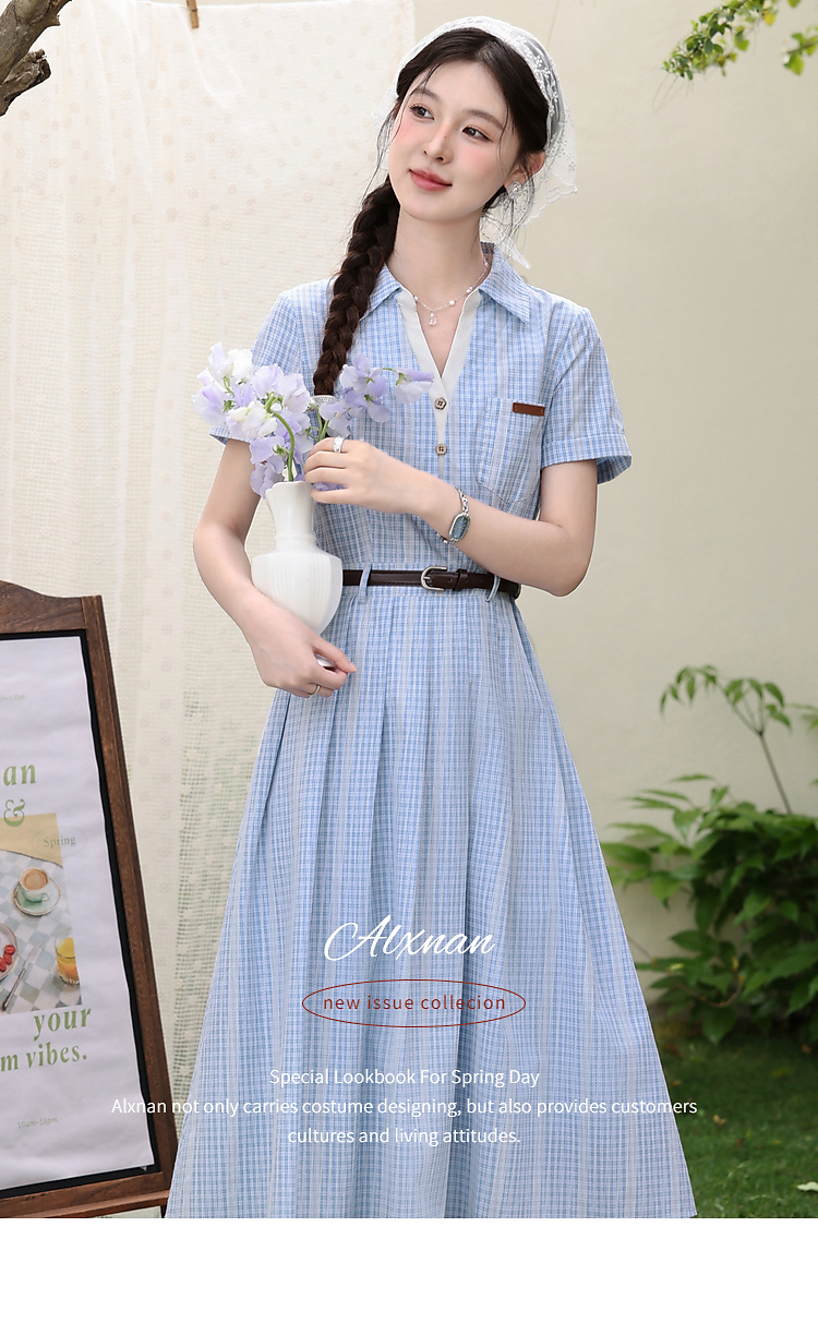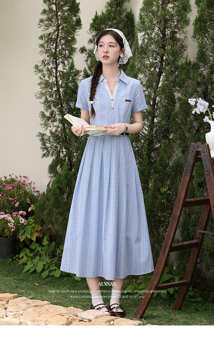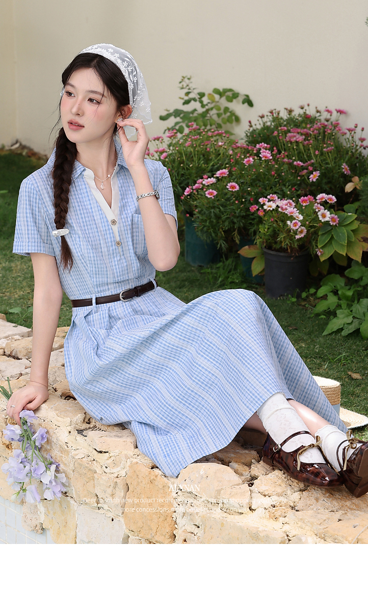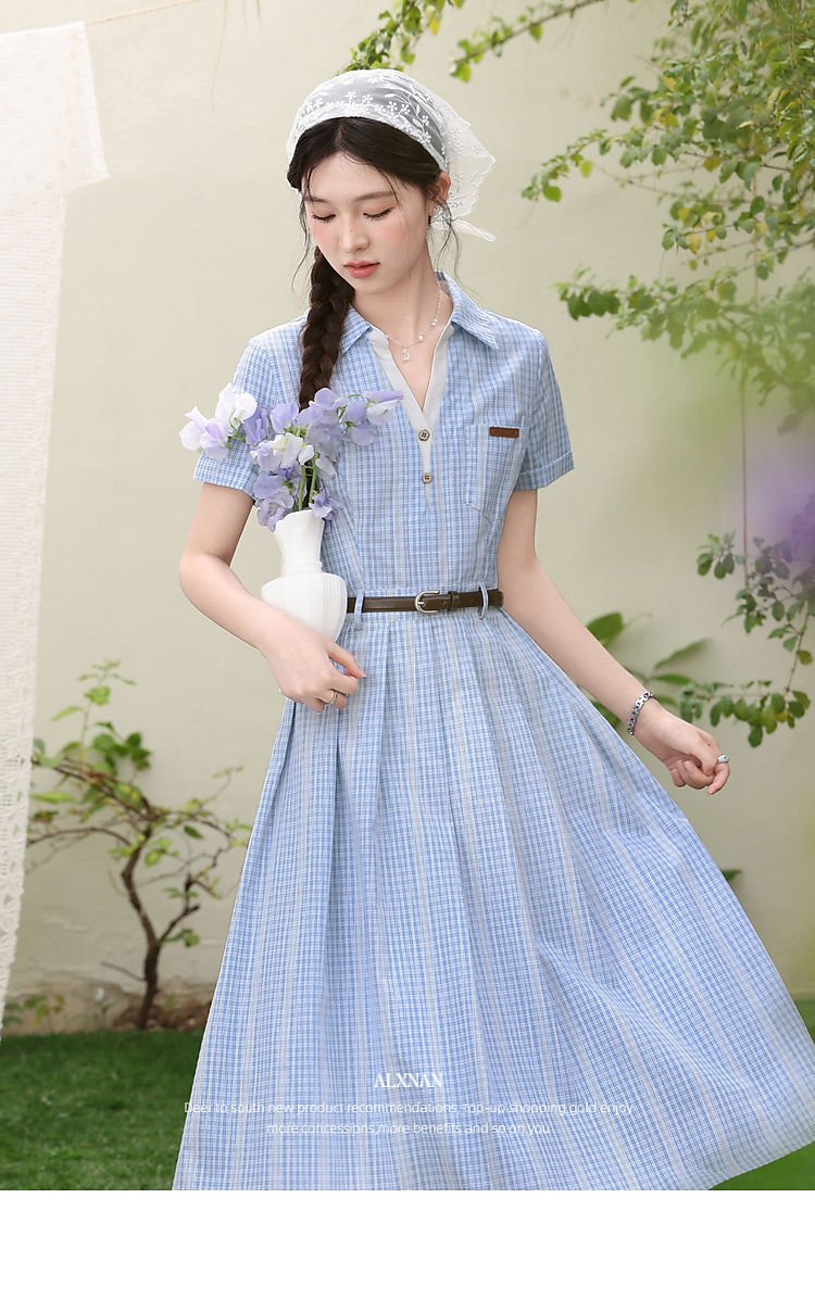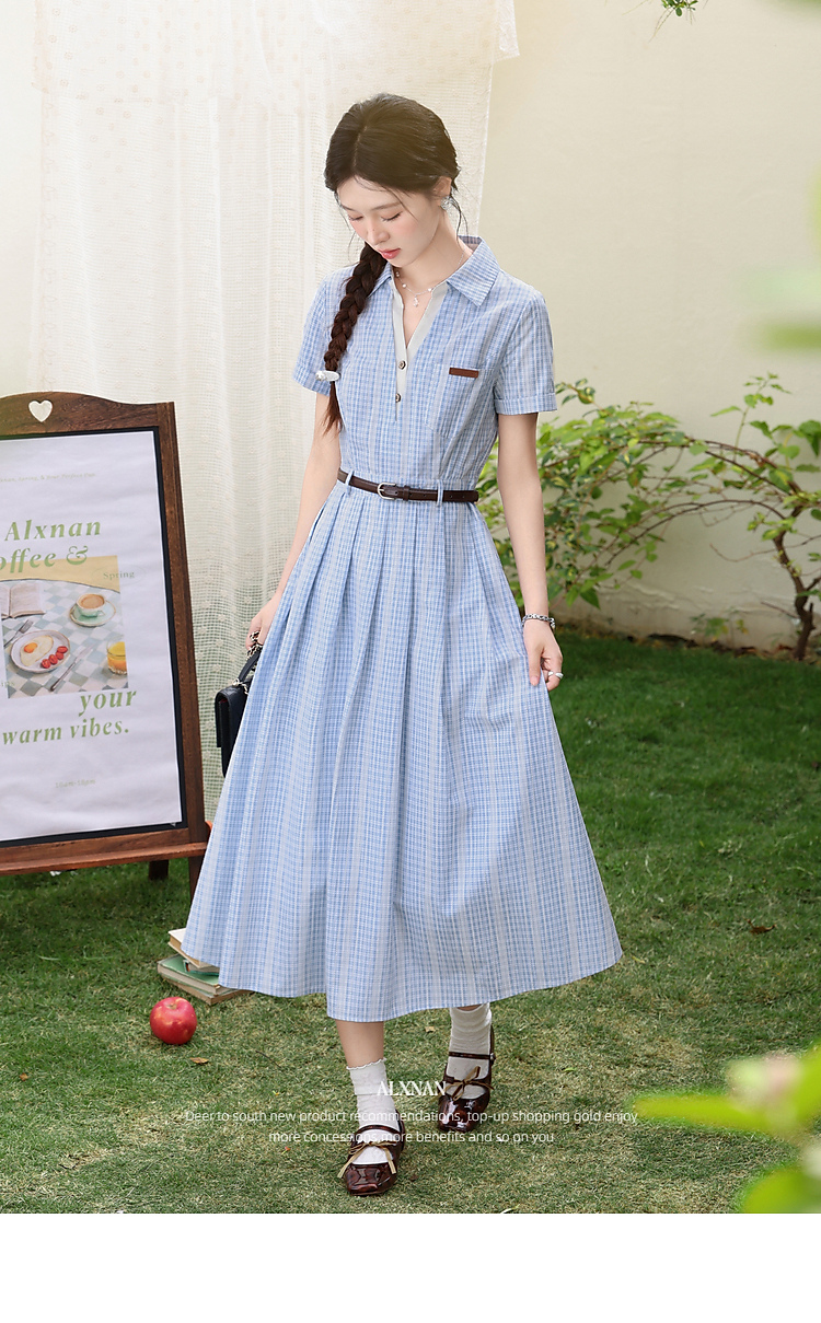 鹿向南「温柔格调」法式气质通勤蓝色设计感收腰格纹短袖连衣裙