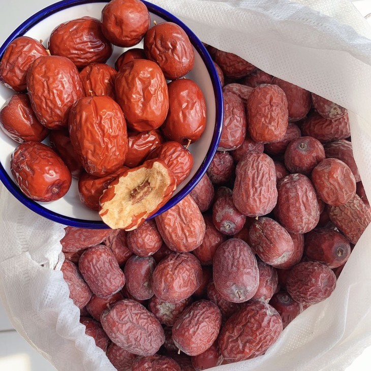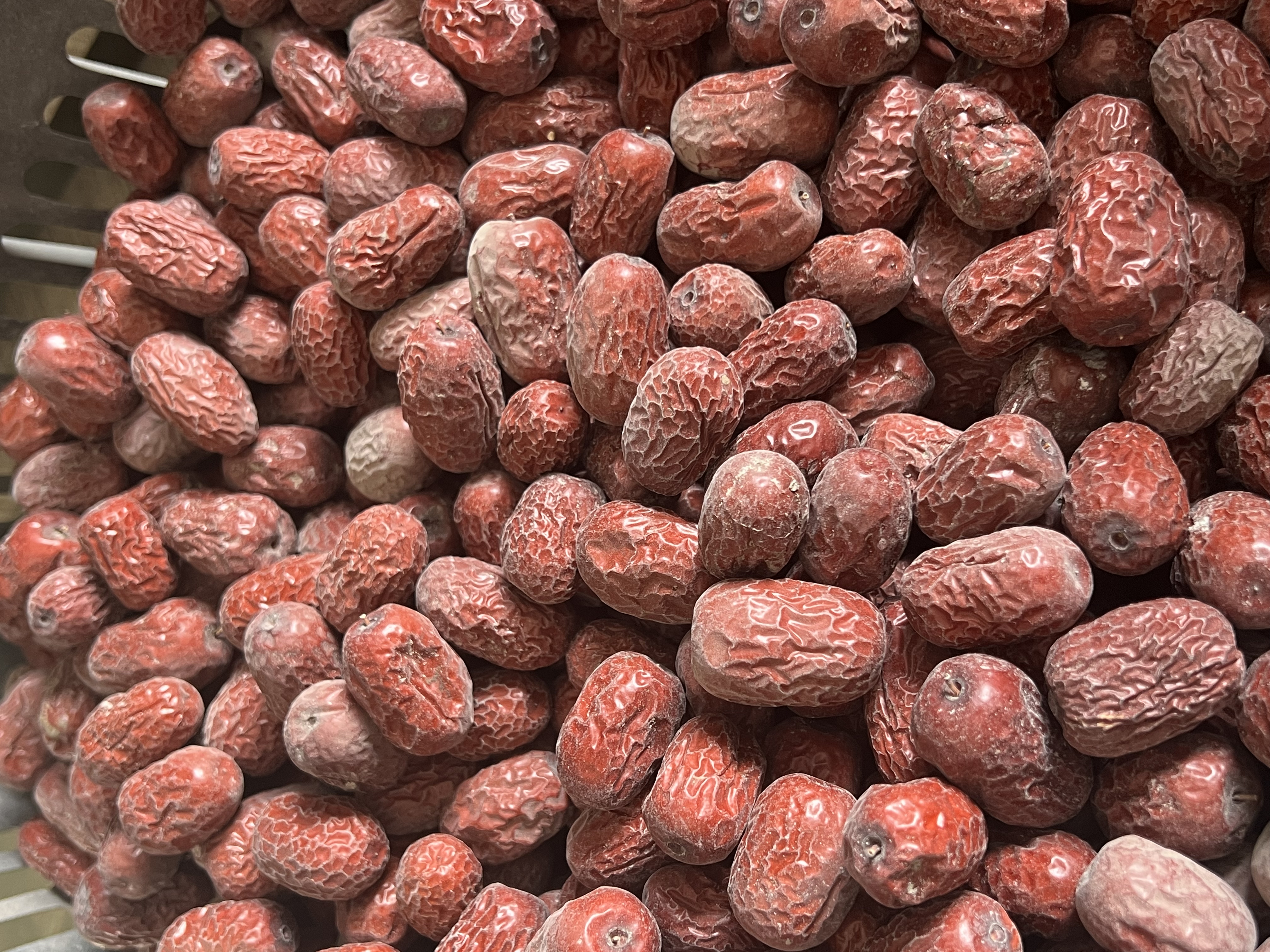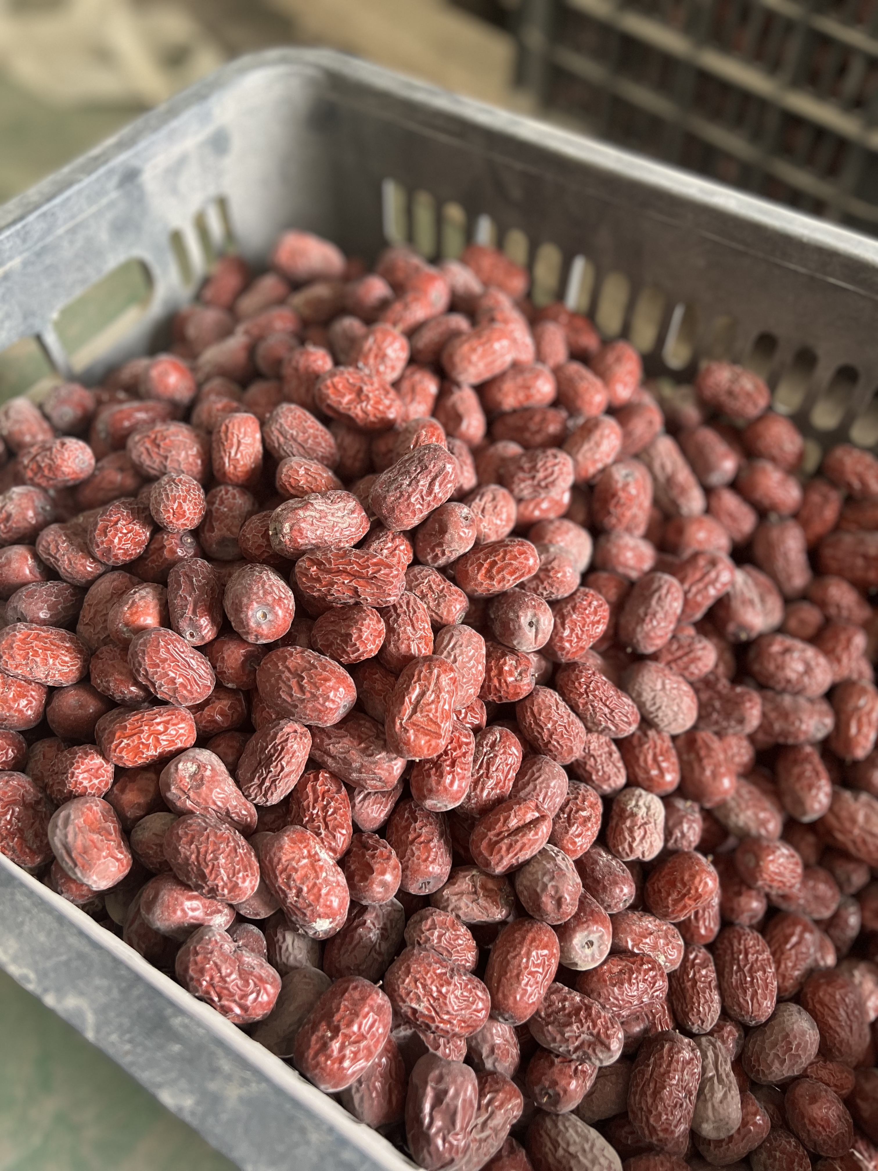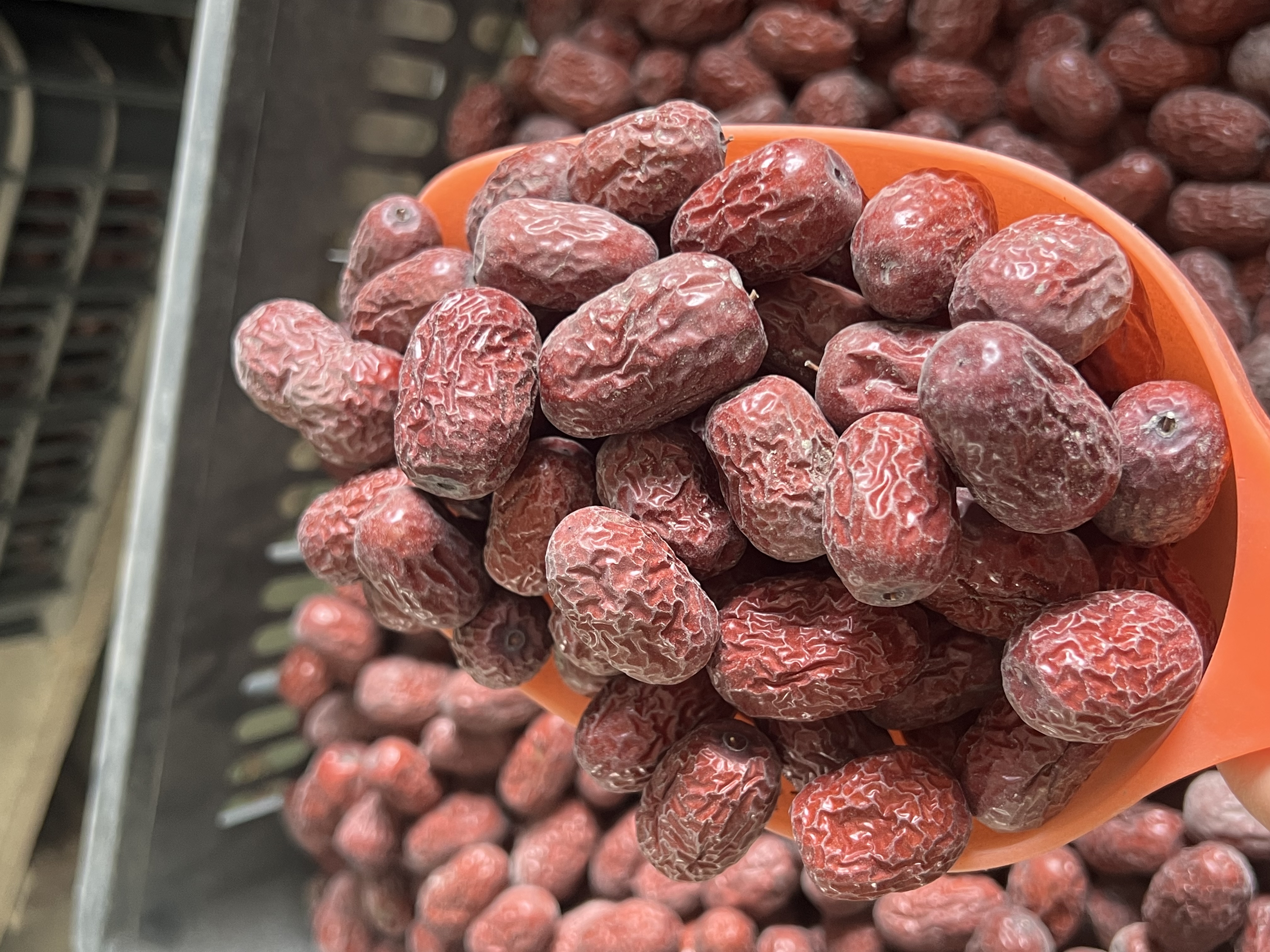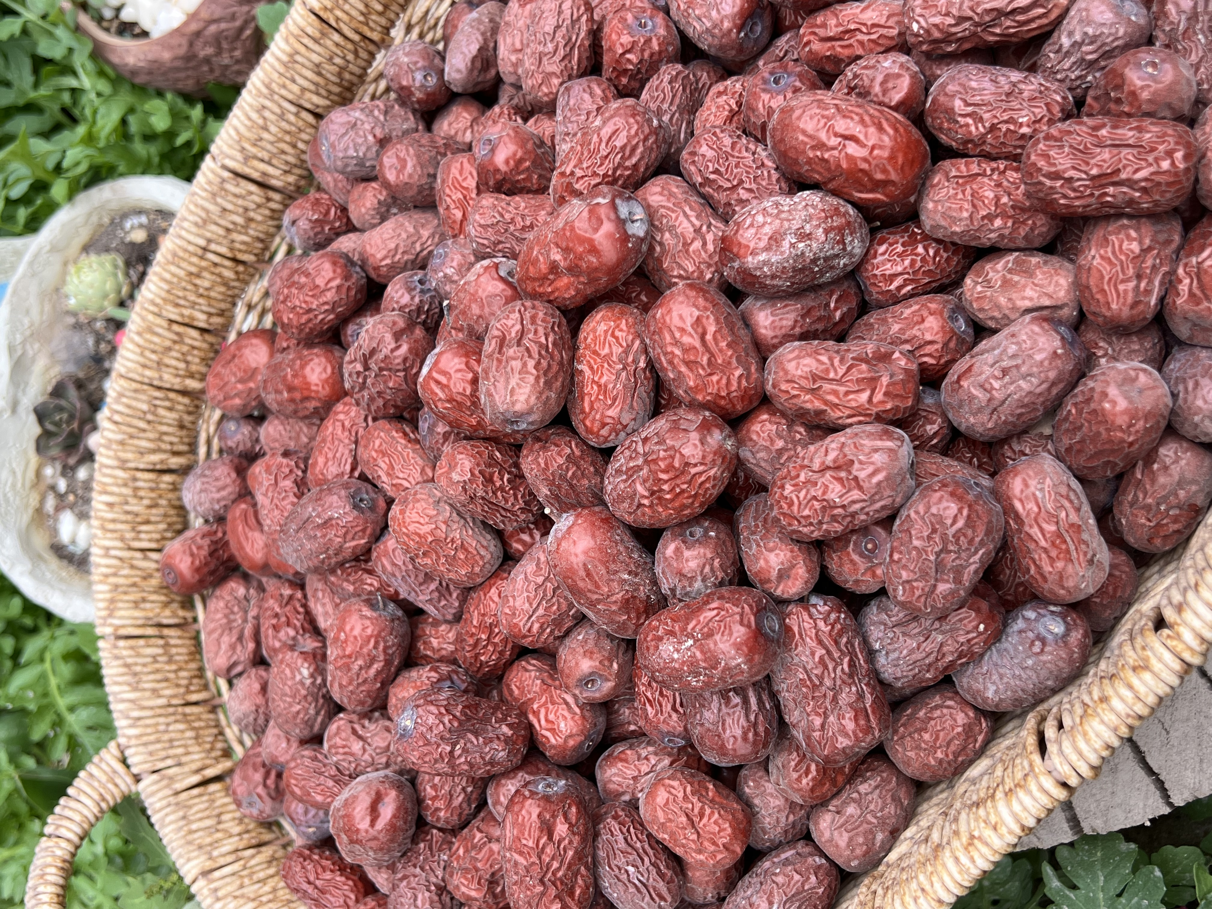 ❸12月下旬,枣子干度达9成以上,果皮皱褶在95%以上。此时果皮稍硬,香浓度达到顶峰,最适合作为食疗食材使用,直接泡水、煲汤、切片烘干均可。