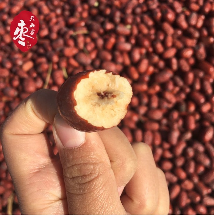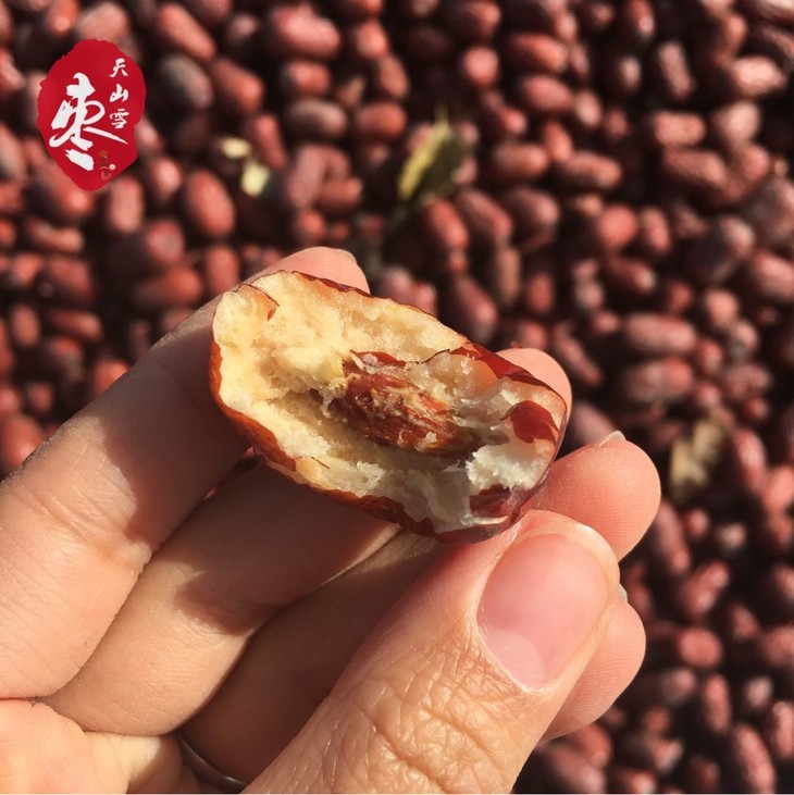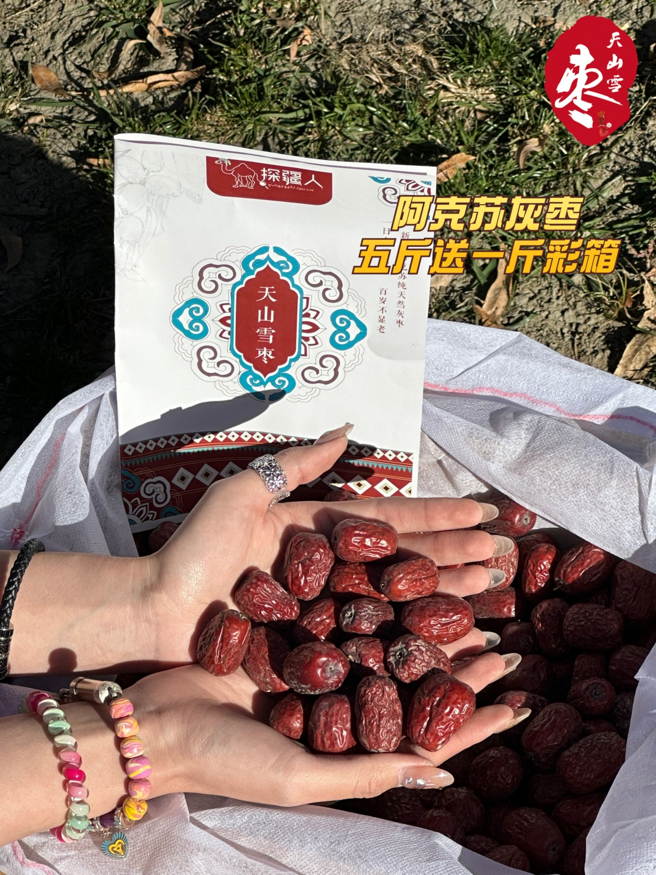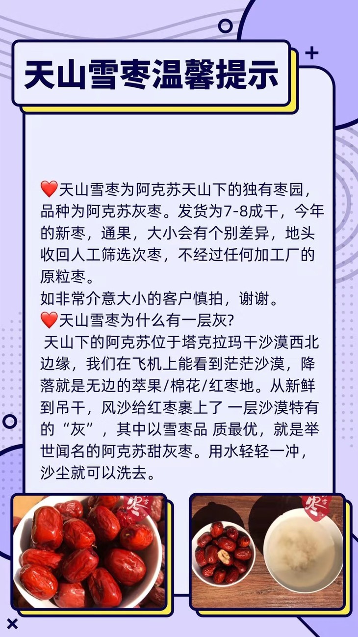 【温馨提示】 • 天山雪枣为天山下的独有枣园,品种为阿克苏灰枣、若羌灰枣。 • 天山雪枣所有的枣无论产区,都是不经过任何加工厂和添加的原粒枣。 • 天山雪枣为什么有一层灰? • 天山下的枣园位于塔克拉玛干沙漠西北边缘,我们在飞机上能看到茫茫沙漠,降落就是无边的萃果/棉花/红枣地。从新鲜到吊干,风沙给红枣裹上了一层沙漠特有的“灰”,其中以雪枣品 质最优,就是举世闻名的阿克苏甜灰枣。用水轻轻一冲沙尘就可以洗去。 【保存方法】干红枣保存最好的保存方法而且不破坏营养的:用塑料袋包装放冰箱里面冷藏:红枣怕风吹,怕高温和潮湿.受风后易干缩,皮色由红变黑,高温,潮湿易出浆,生虫发霉为防止发黑,尽量放冰箱保存。