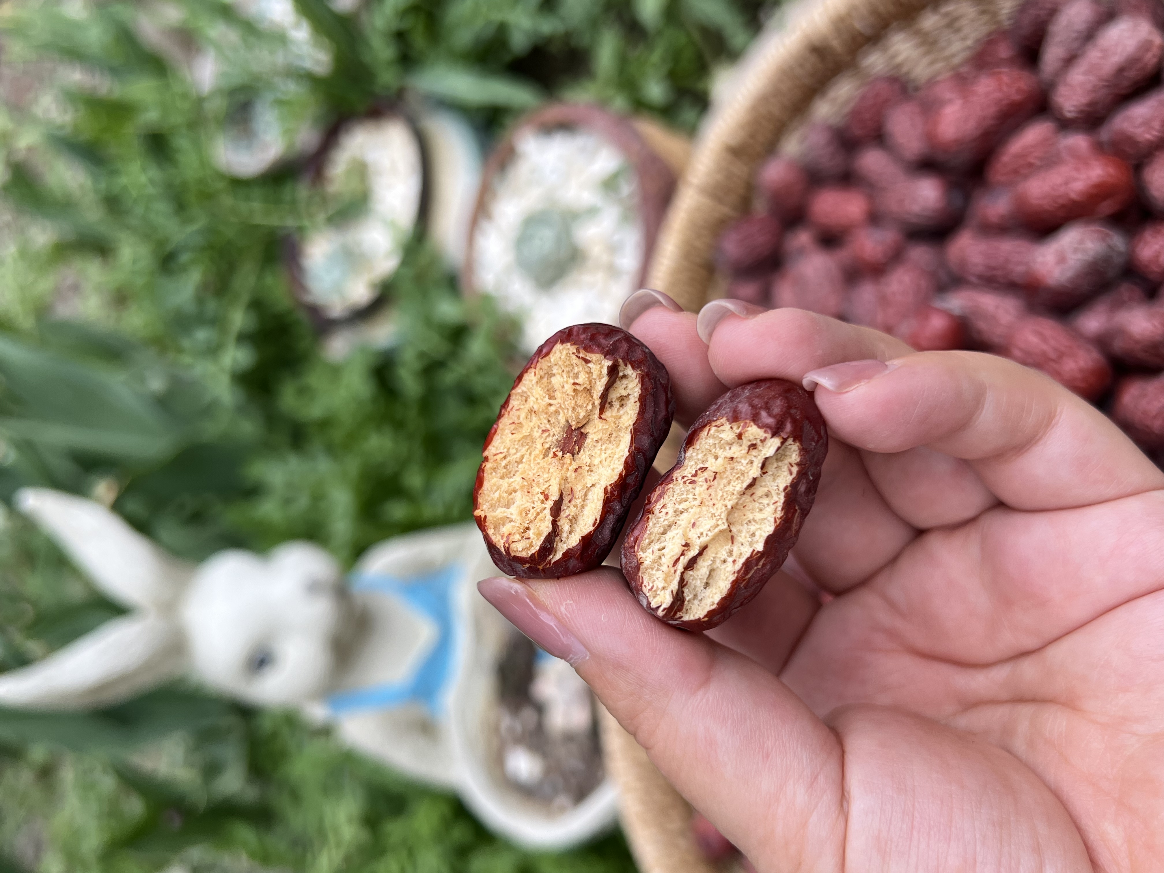 ❷12月初,枣子干度达8.5-9成,果皮皱褶在85%以上。口感厚实有嚼劲,焦香浓郁,回味余甜。此时当零食吃/煲汤均可。