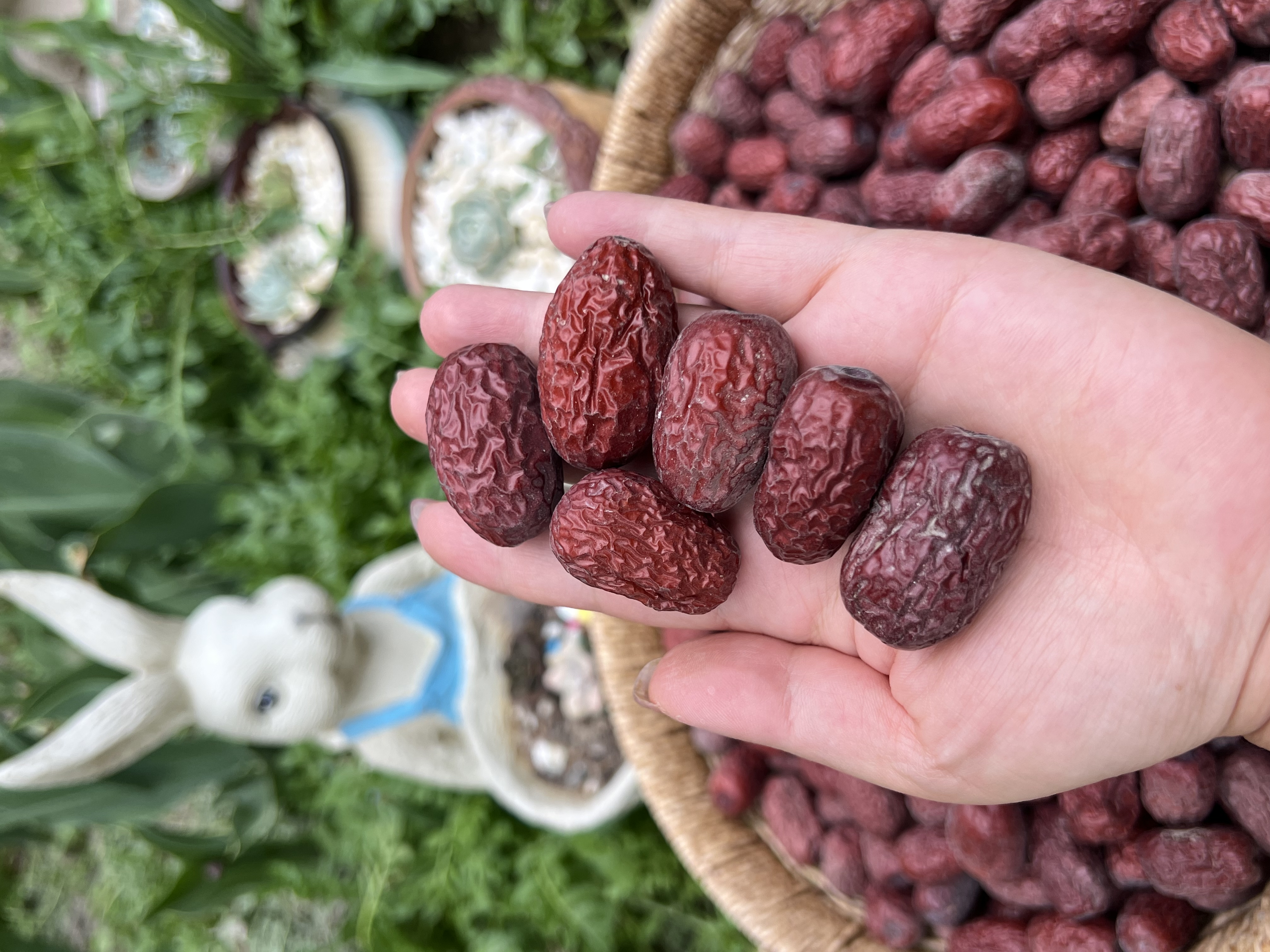 ❶11月中旬,干度在7.5-8成,含水量在15%-20%。果皮皱褶在70%以上,枣皮看似外观干燥不含湿气,实则咬下去中间果肉焦糖香,口感软糯,枣皮脆,边缘果肉湿润带鲜枣香,非常适合当口粮和儿童辅食,不噎口。