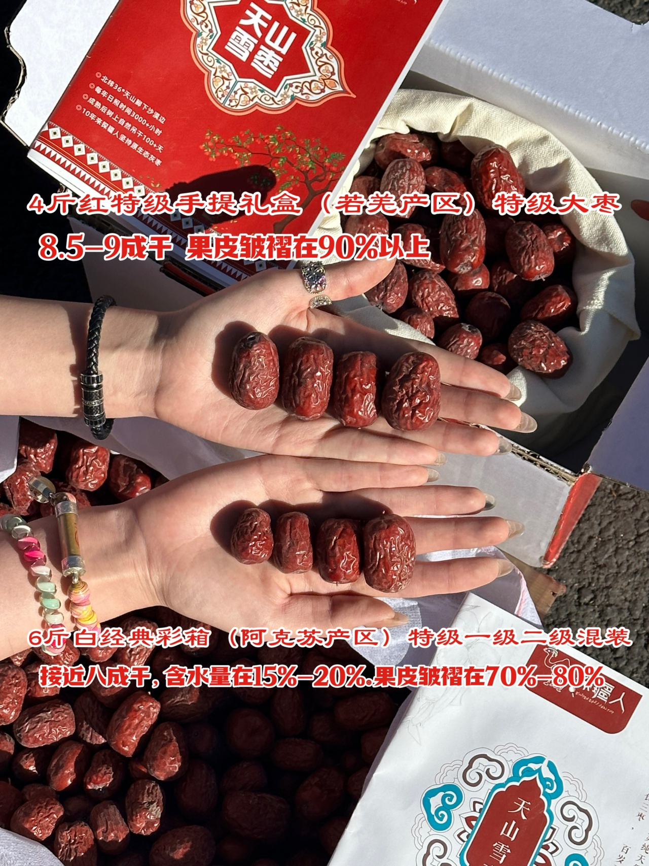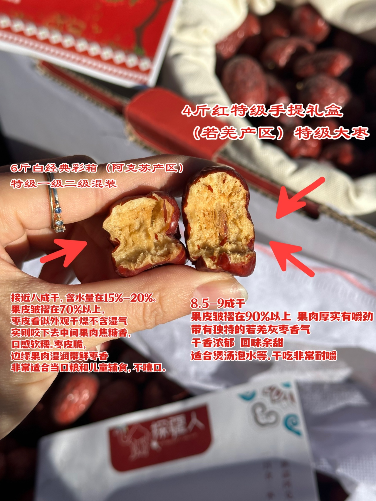 ❶阿克苏灰枣(含若羌、阿拉尔、且末三产区混发)含水量在15-20%左右。稍微爱吃带点鲜味的,红枣皮带一点嚼劲,肉质糯糯的带褐色焦糖心,果核小,果肉厚,要早下单~越往后的灰枣,晒得更干。 ❷若羌灰枣(仅若羌产区)早下树,且品质管理高,含水量在10%。九成干,完全是干度刚好合适的枣,爱吃香浓干糯的口感就拍这个。果核小,果肉厚,入口糯,有嚼劲,焦香浓郁,干香回味甘甜。回家不用再晒,直接常温保存,能放到来年这个时候。