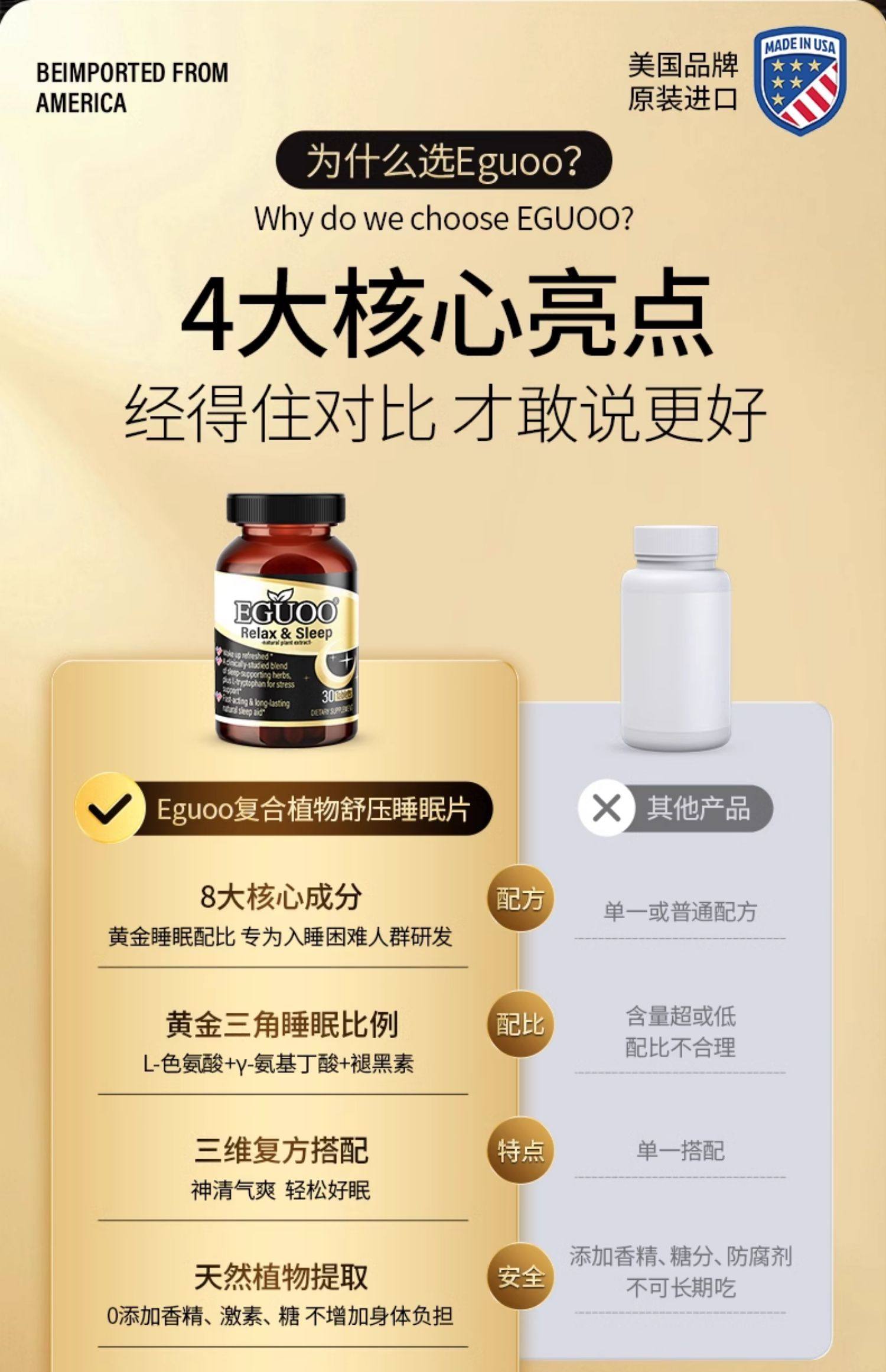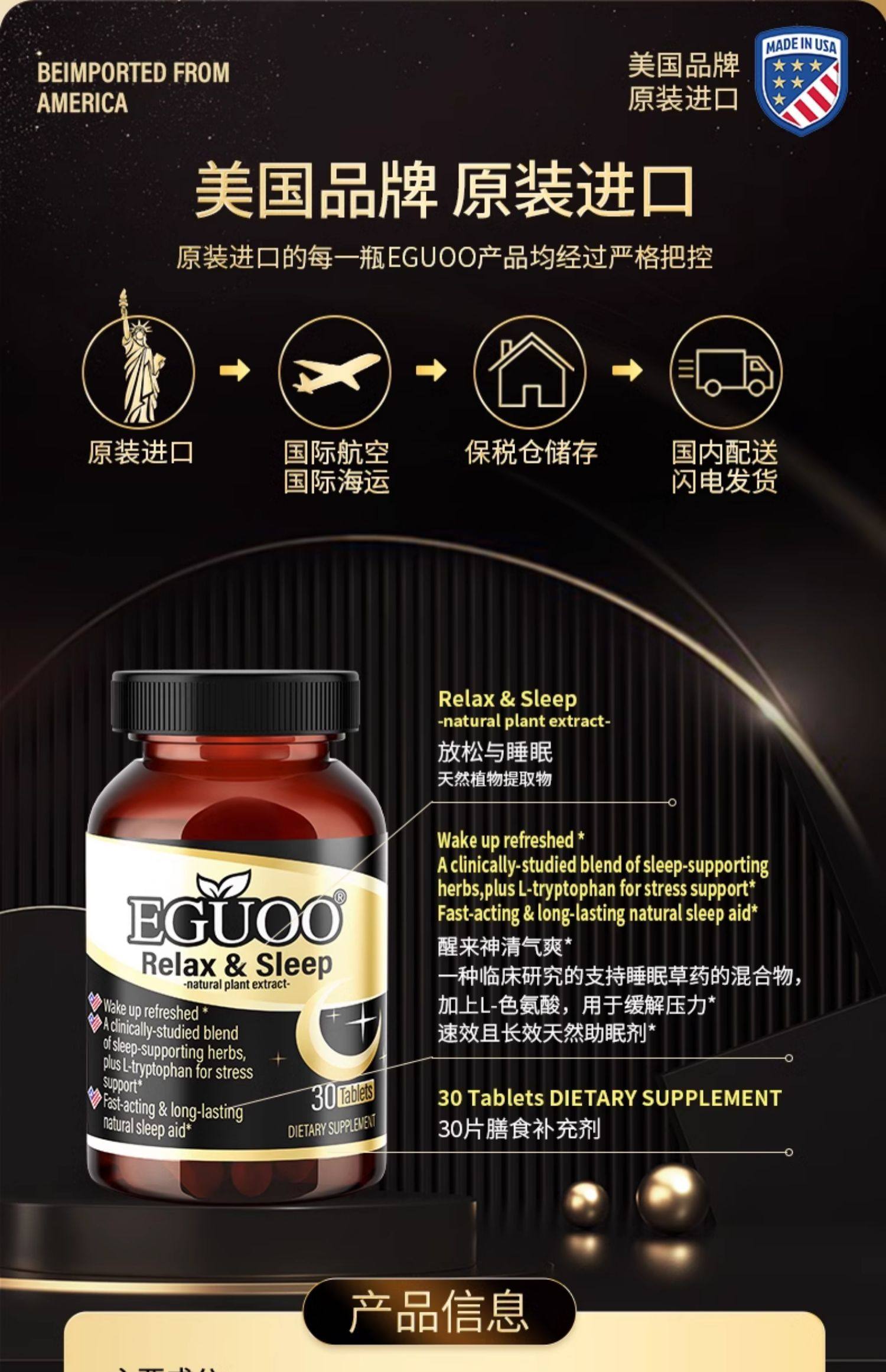 美国原装进口EGUOO复合植物睡眠片gaba退褪黑素改善睡眠助眠sleep