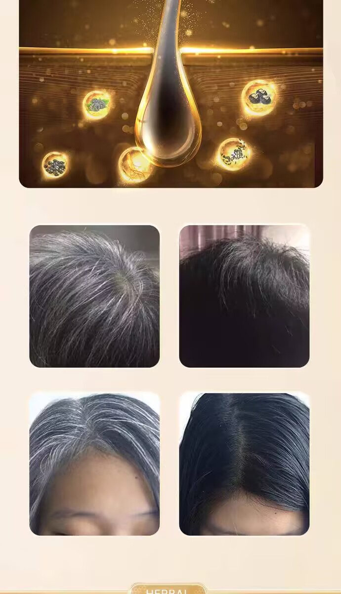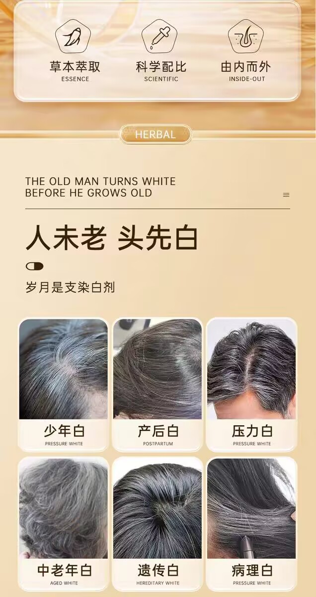 1.黑发:益乌生素可以产生黑发所需的营养,促进黑发的生长,从而更好的缓解白发的生长。发质:透明水晶质感,持久柔软,不掉色,巩固发根。