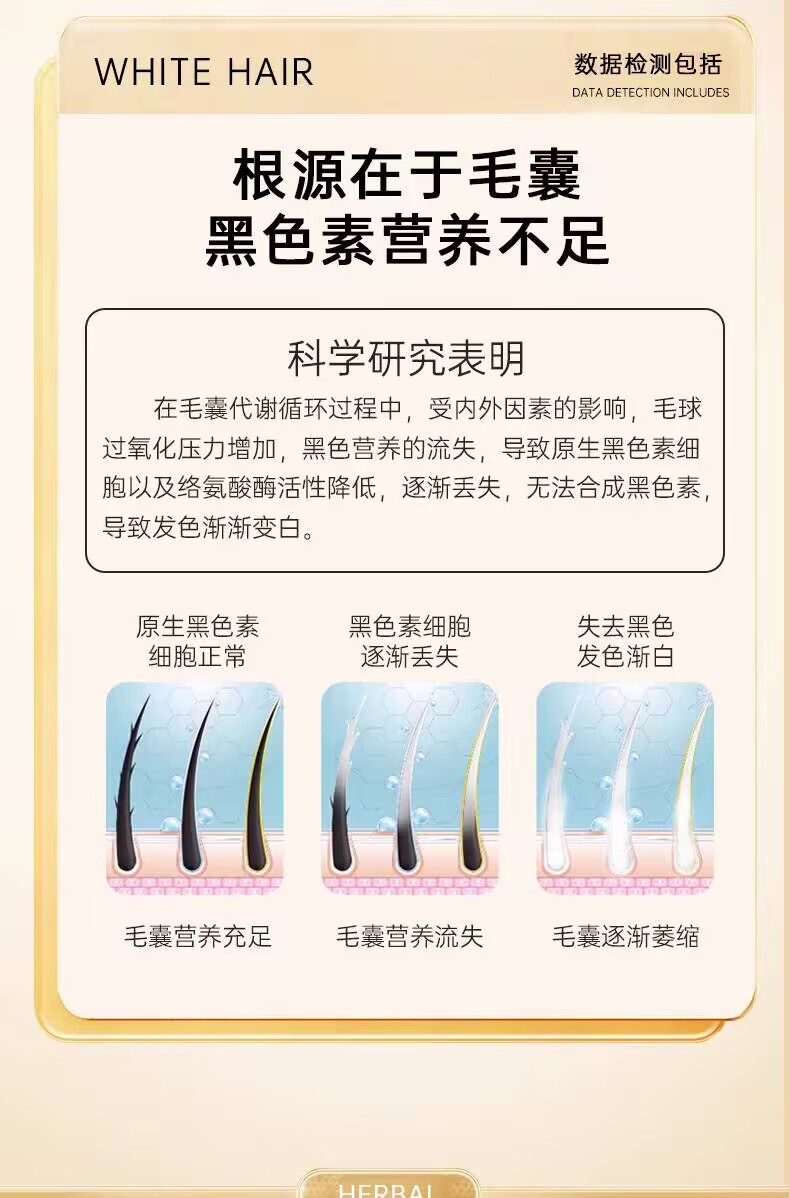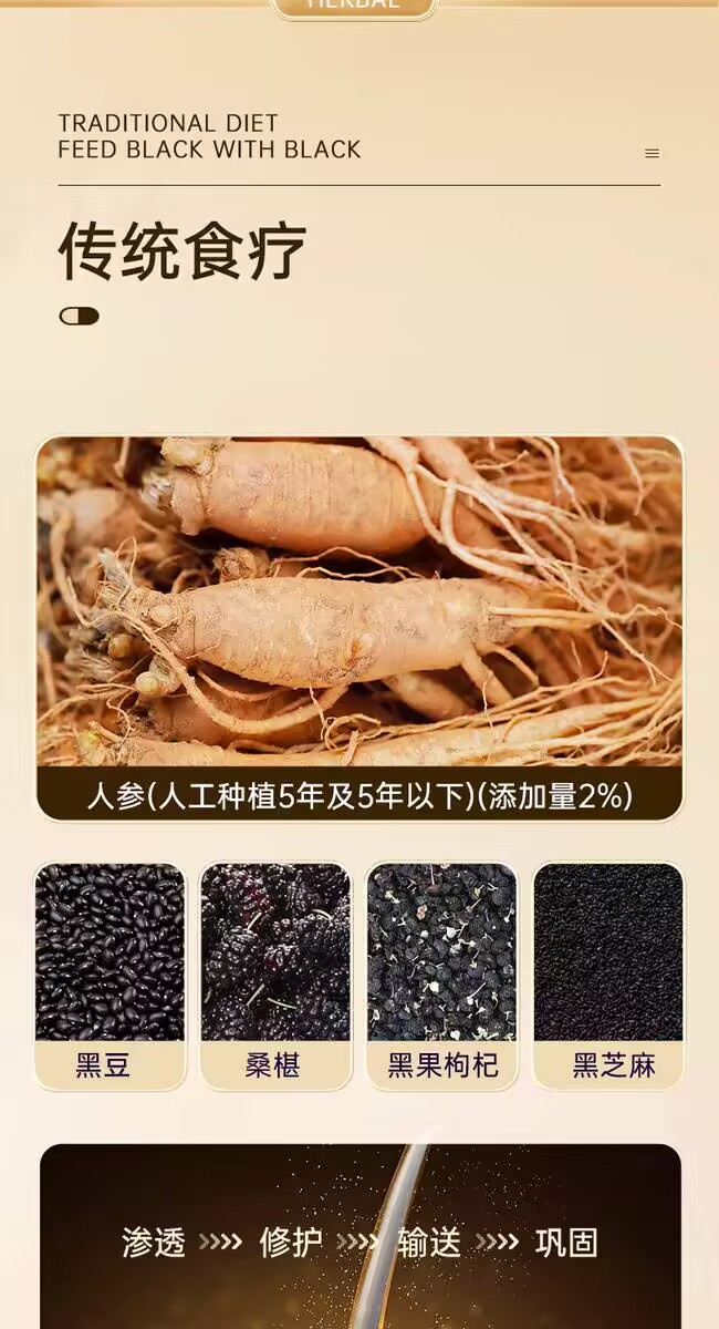 2.护发:植物黑发,天然黑发,黑发滋润发根,保护发质。