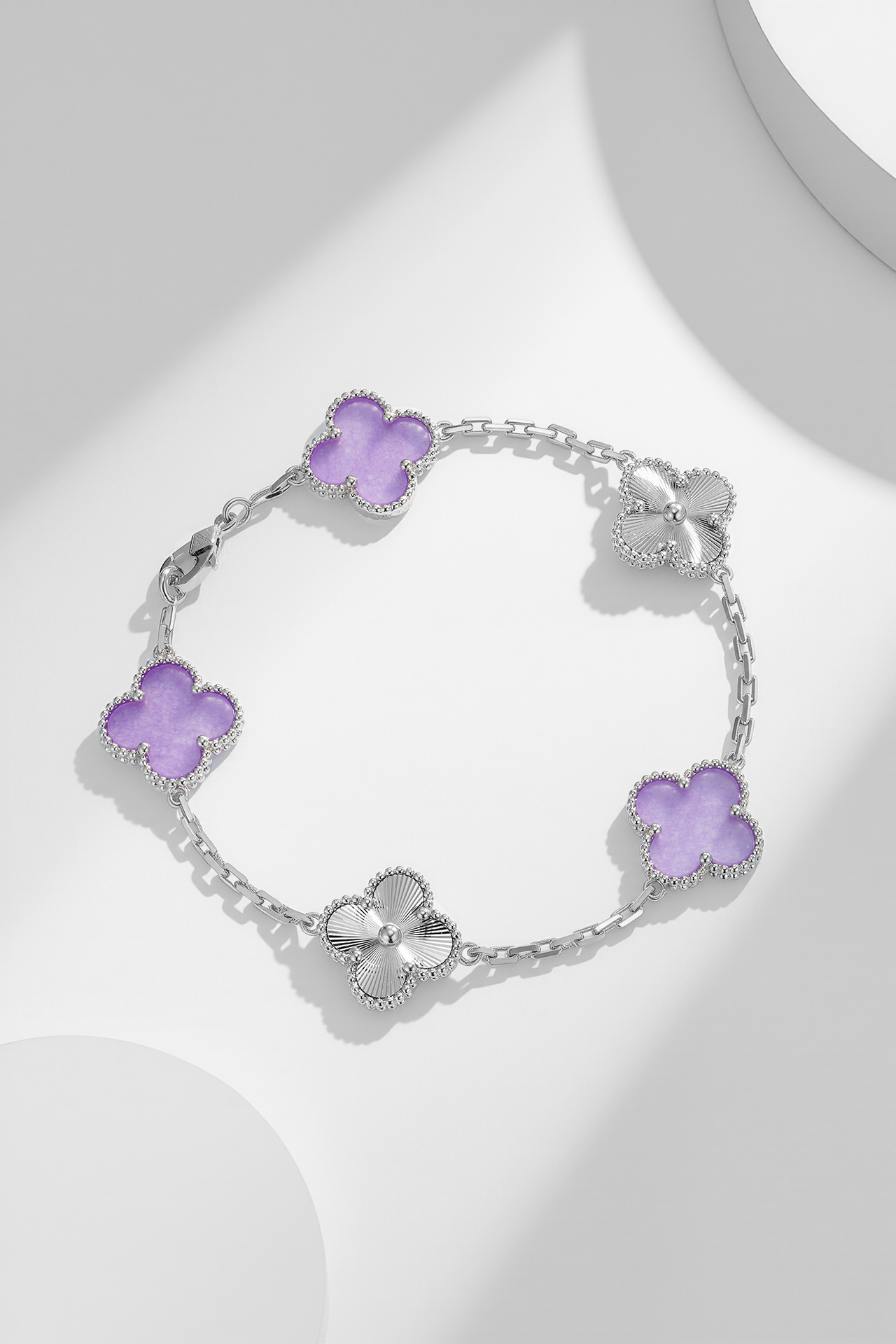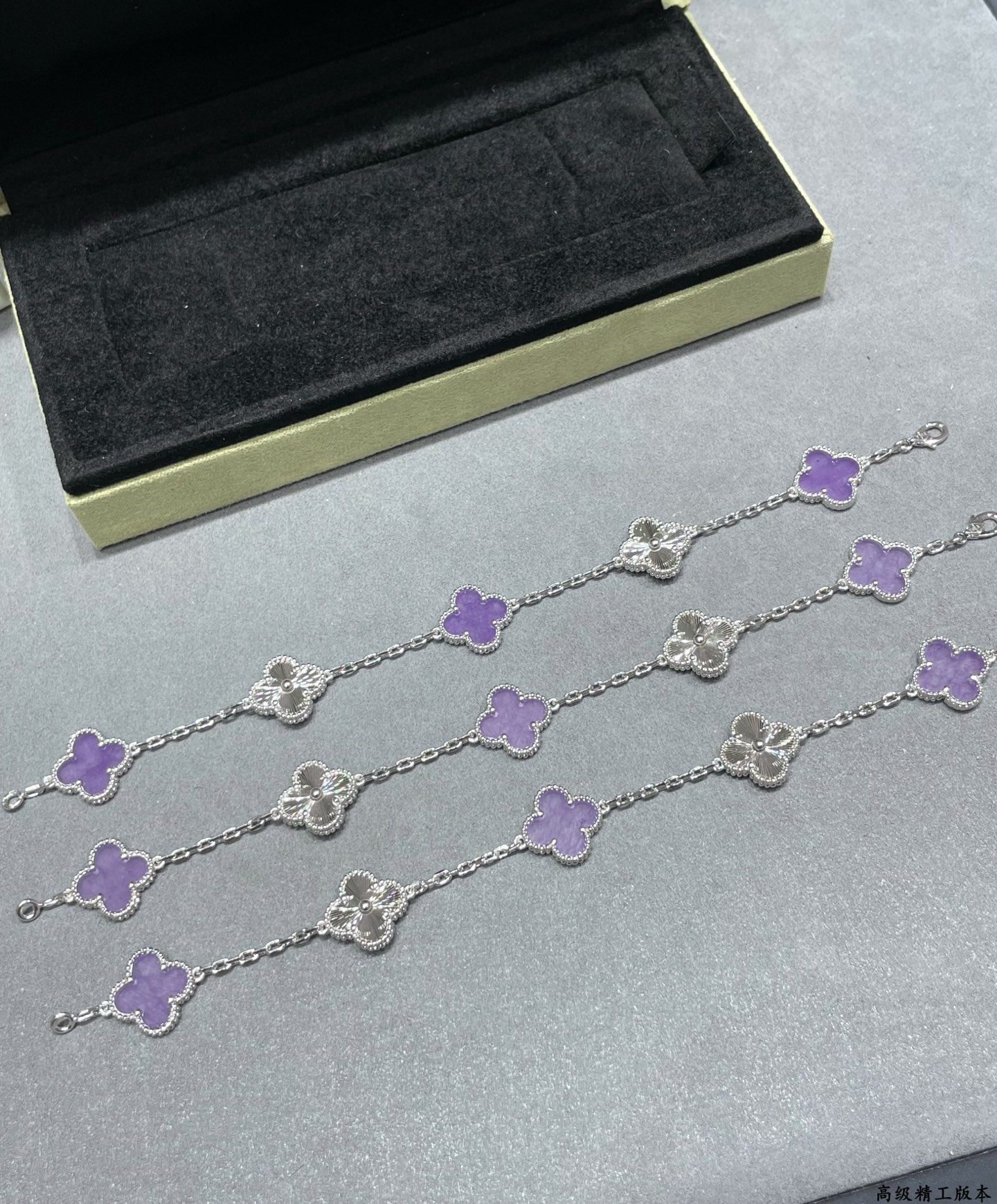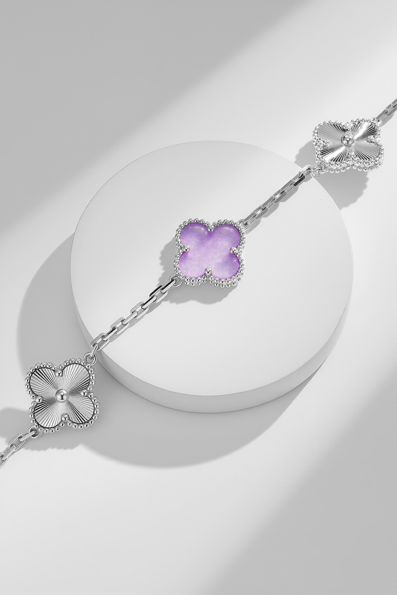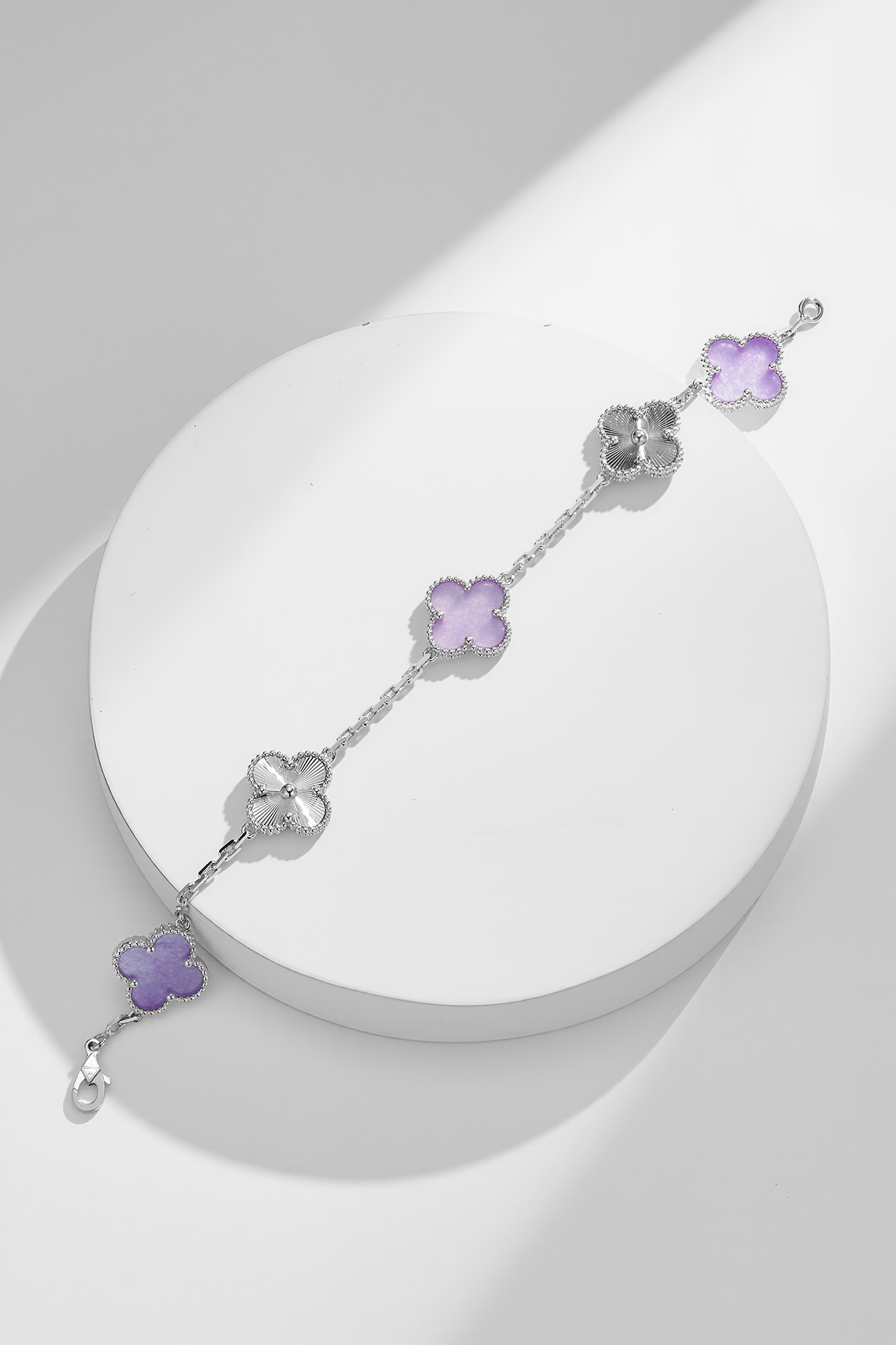 【紫罗兰镭射五花手链|戴上秒变人间富贵花!] 「当四叶草遇见紫罗兰镭射光」 一每一面都闪着梦幻极光,抬手瞬间美到窒息! 幸运加成:四叶草造型暗藏玄机,闺蜜说戴上后抽盲盒都能抽到隐藏款! 镭射黑科技:不同角度会变幻紫/蓝/粉光,阳光下像把银河绕在手腕上~ 叠戴神器:单独戴是仙女本仙,配小金表直接贵气翻倍!