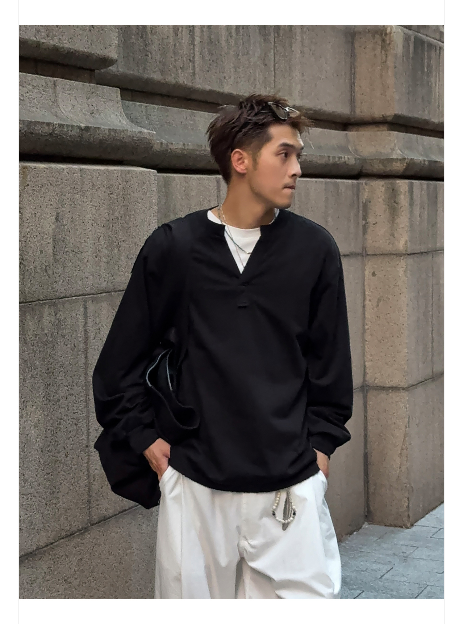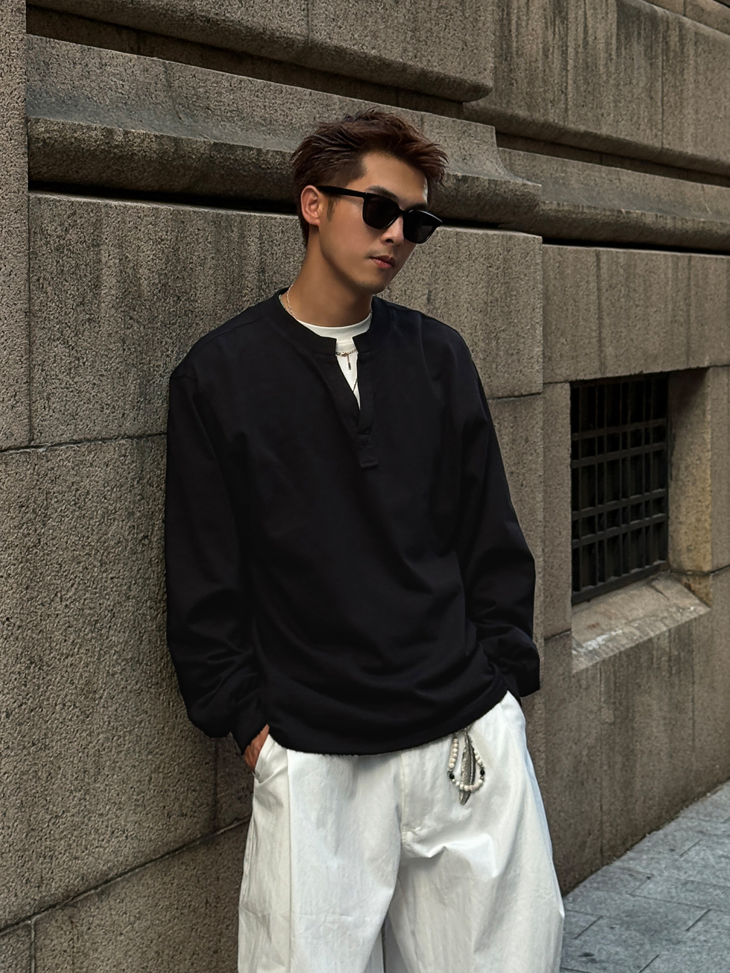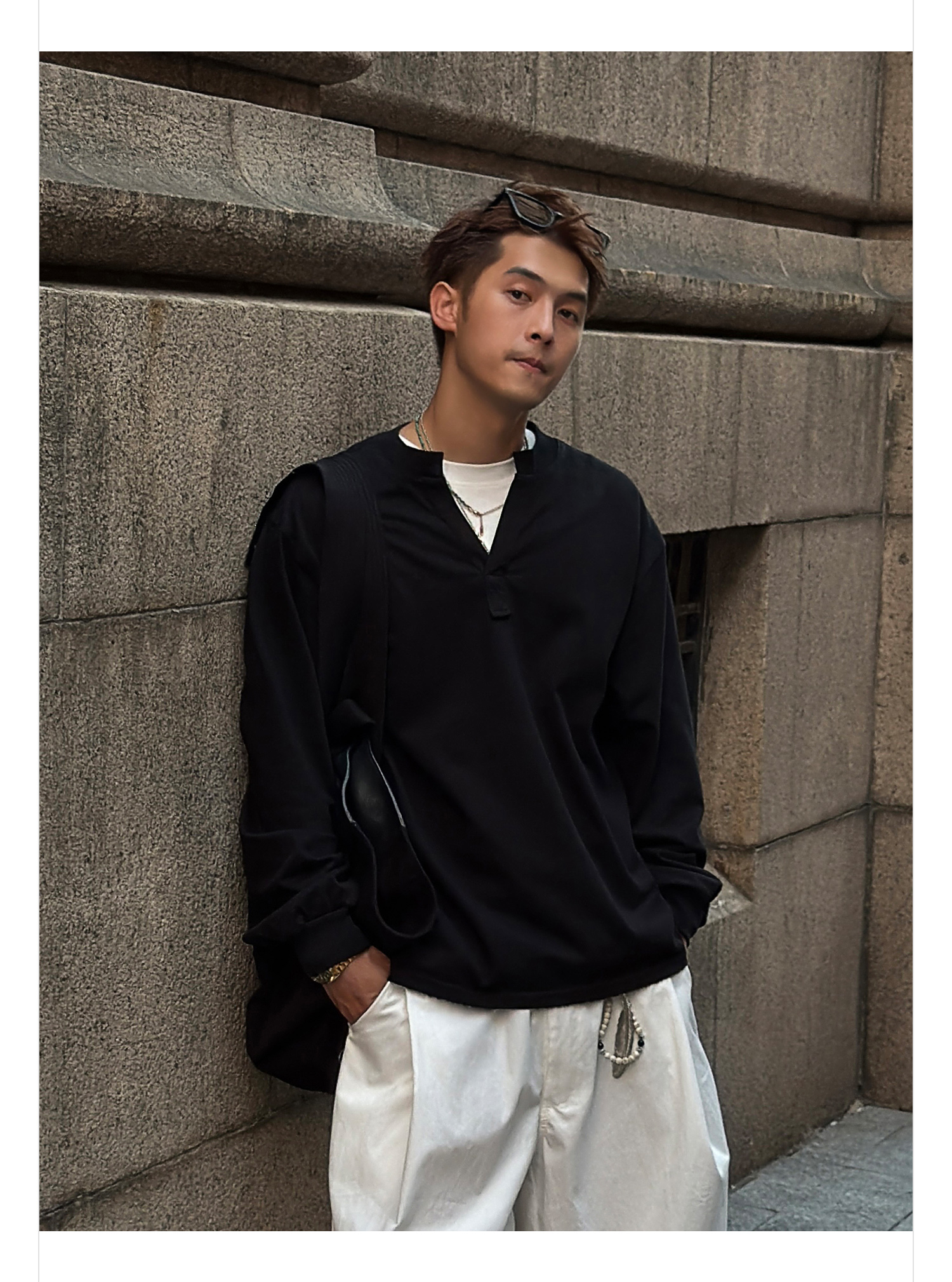 徐太浪【cleanfit 极简纯棉】黑色V领长袖T恤男春秋打底内搭上衣