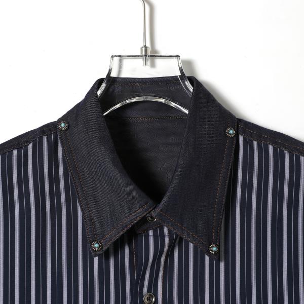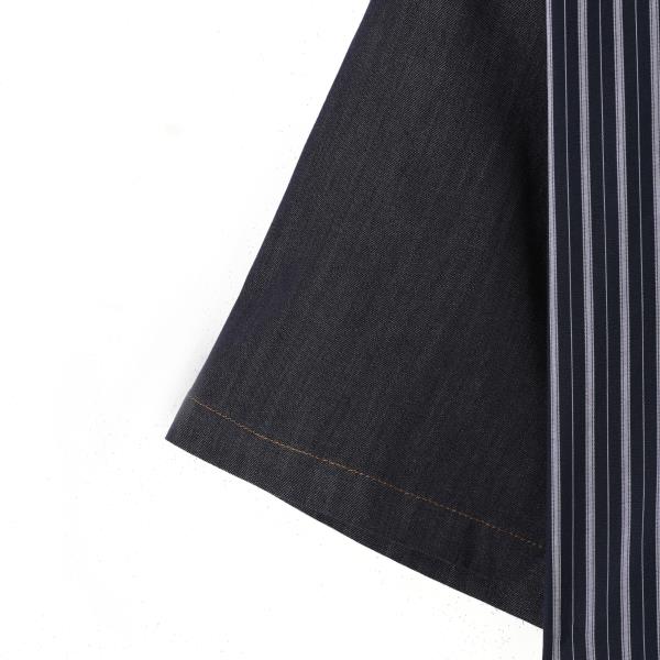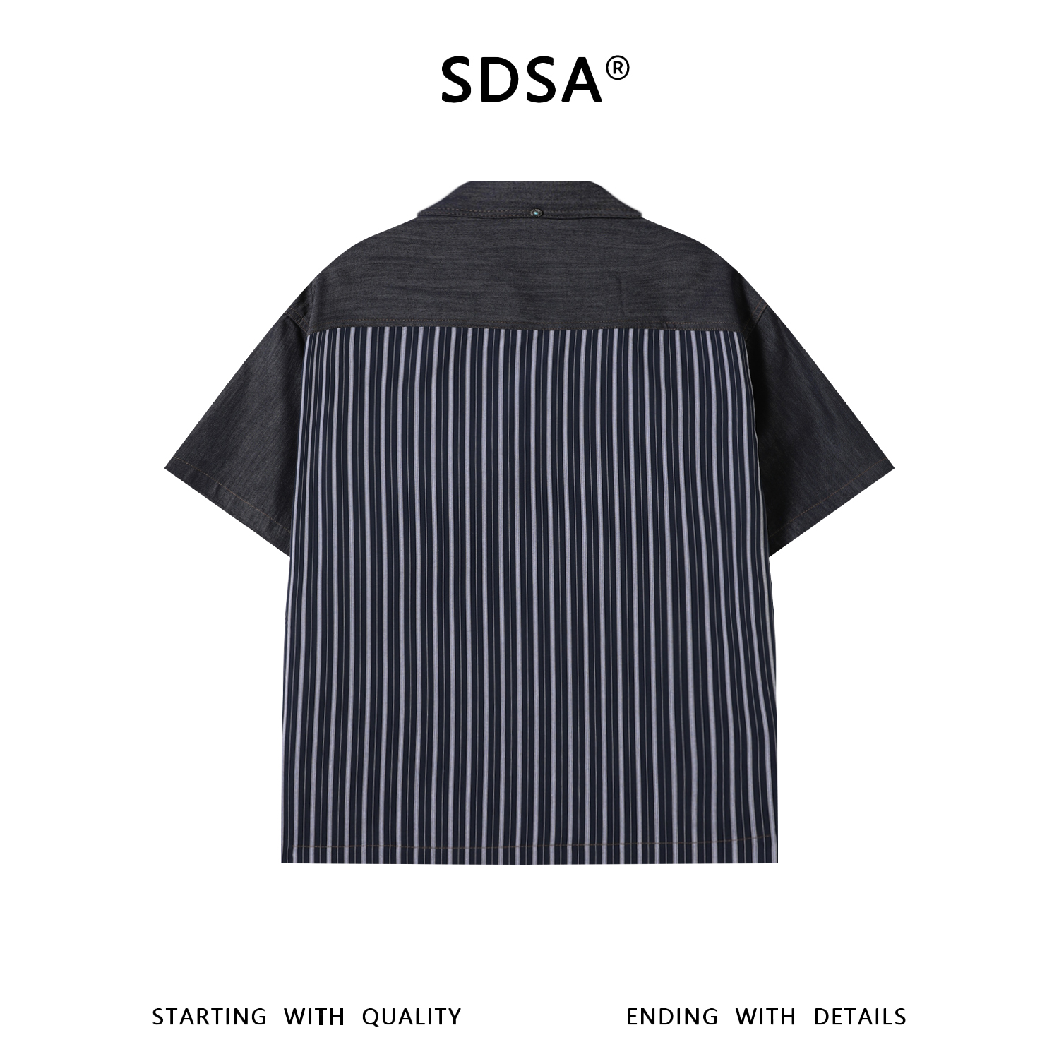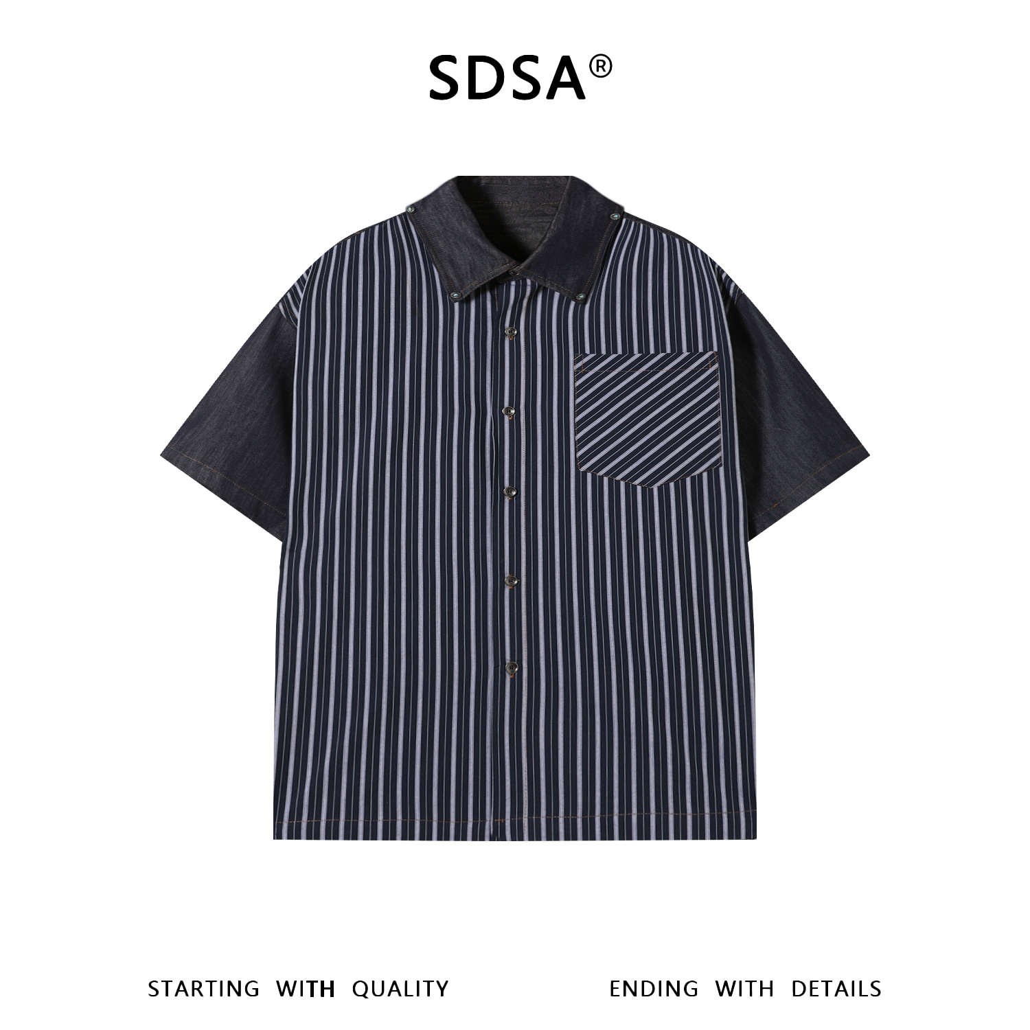 SDSA男装2026新款高贵轻奢牛仔拼接条纹短袖衬衫美式复古宽松衬衣