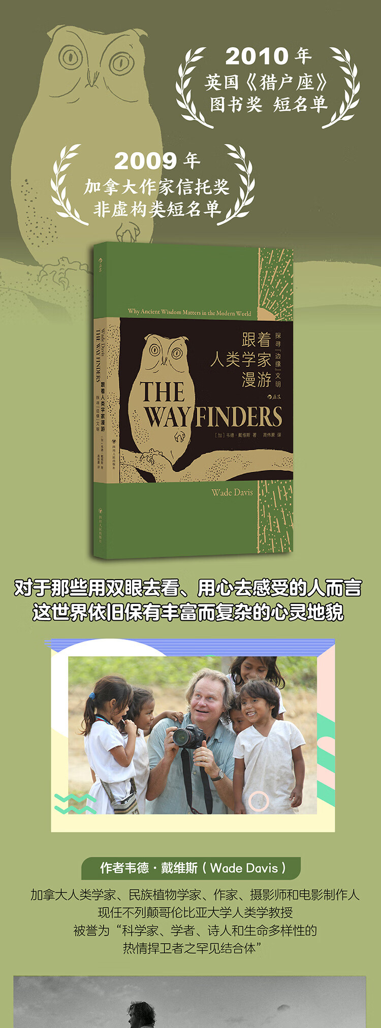韦德·戴维斯(Wade Davis),加拿大人类学家、民族植物学家、作家、摄影师和电影制作人。现任不列颠哥伦比亚大学人类学教授,2000年至2013年担任美国国家地理学会常驻探险家,被加拿大皇家地理学会任命为荣誉副会长。美国国家地理学会将他评选为“千年探险家”之一,加拿大遗传学家、环保活动家大卫·铃木(David Suzuki)形容他为“科学家、学者、诗人和生命多样性的热情捍卫者之罕见结合体”。戴维斯著述丰硕,截至本中文版付印之时,已撰写375篇科学论文和通俗文章,出版23本著作,包括《巨蟒与彩虹》《走进寂静》《马格达莱纳河》等。其中,《走进寂静》获得了2012年塞缪尔·约翰逊奖,这是英国最重要的非虚构文学奖之一。他的著作已被翻译成20余种语言,全球销量约达100万册。
