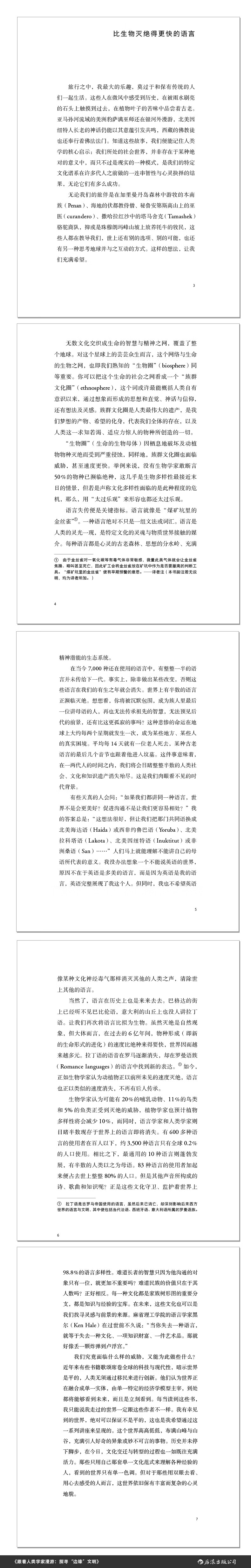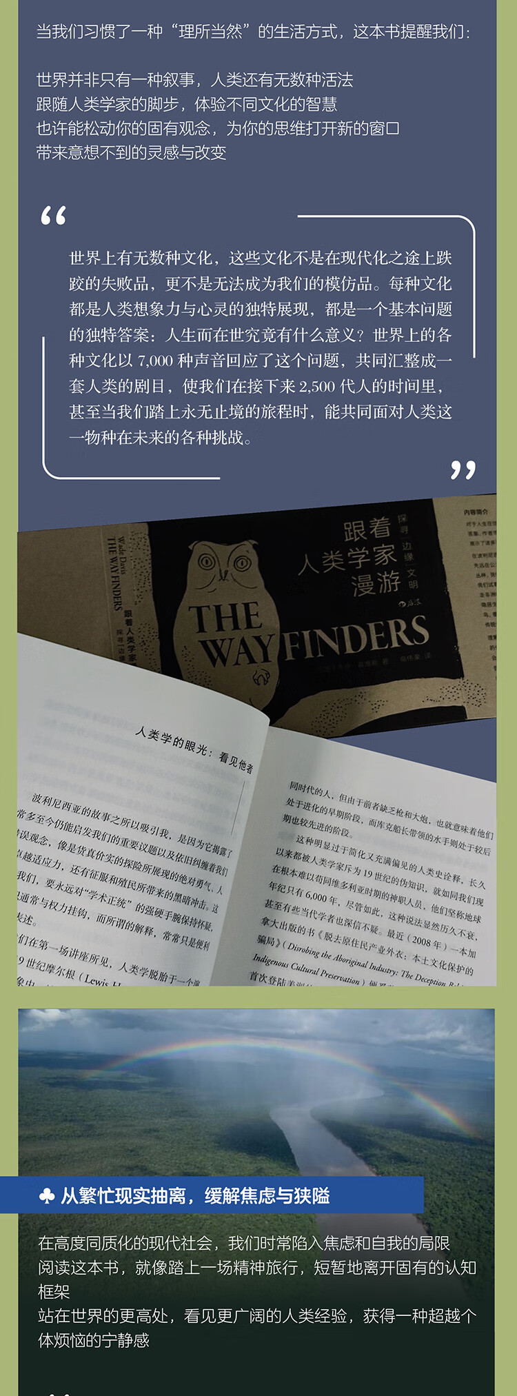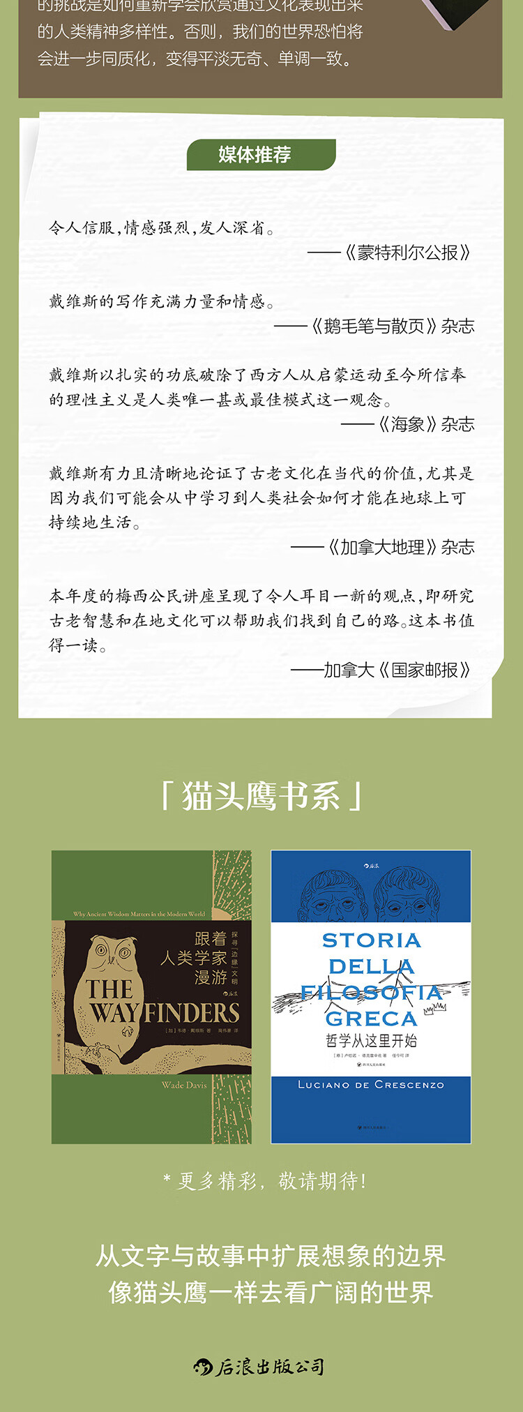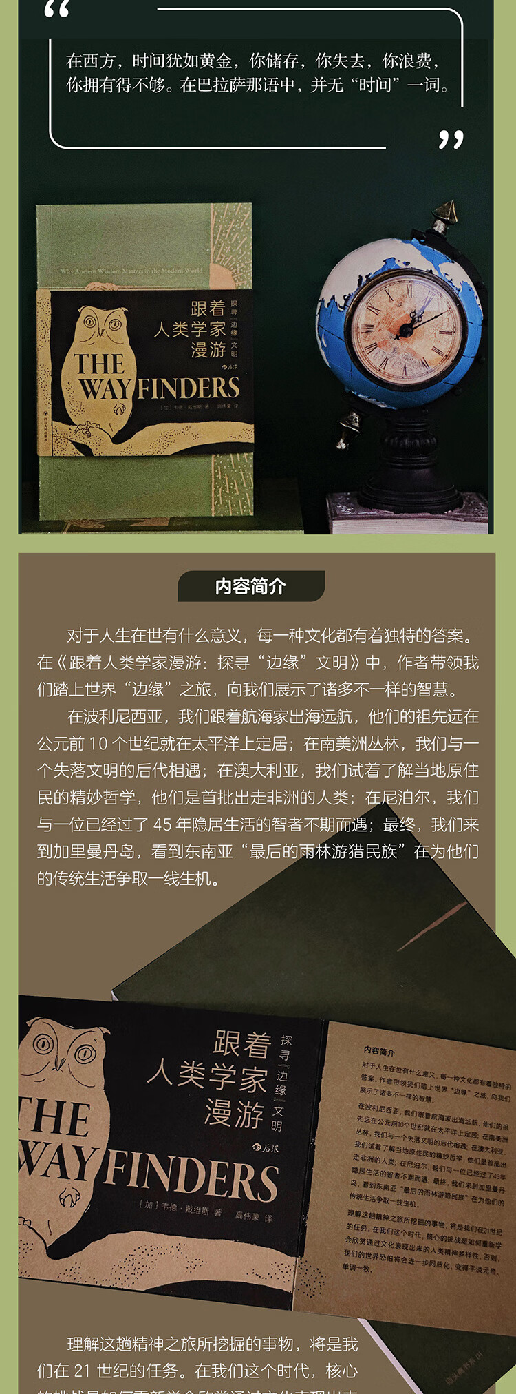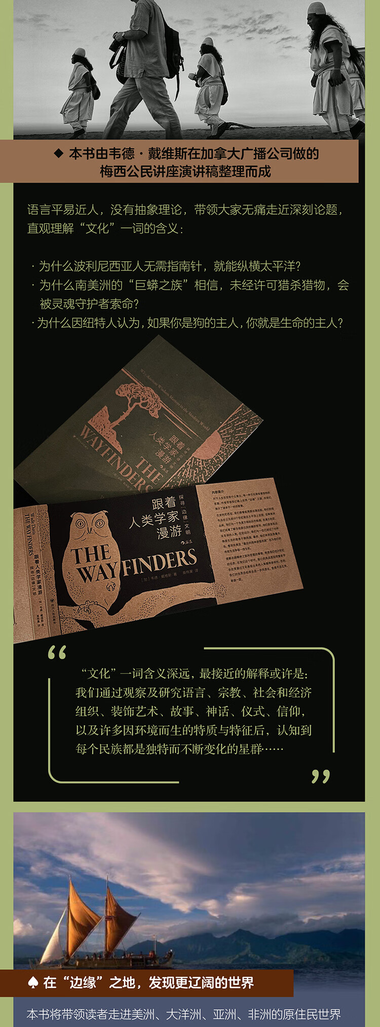 对于人生在世有什么意义,每一种文化都有着独特的答案。在《跟着人类学家漫游:探寻“边缘”文明》中,作者带领我们踏上世界“边缘”之旅,向我们展示了诸多不一样的智慧。在波利尼西亚,我们跟着航海家出海远航,他们的祖先远在公元前10个世纪就在太平洋上定居;在南美洲丛林,我们与一个失落文明的后代相遇;在澳大利亚,我们试着了解当地原住民的精妙哲学,他们是首批出走非洲的人类;在尼泊尔,我们与一位已经过了45年隐居生活的智者不期而遇;最终,我们来到加里曼丹岛,看到东南亚“最后的雨林游猎民族”在为他们的传统生活争取一线生机。理解这趟精神之旅所挖掘的事物,将是我们在21世纪的任务。在我们这个时代,核心的挑战是如何重新学会欣赏通过文化表现出来的人类精神多样性。否则,我们的世界恐怕将会进一步同质化,变得平淡无奇、单调一致。