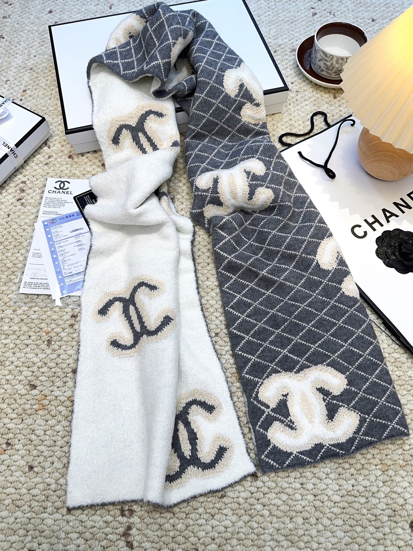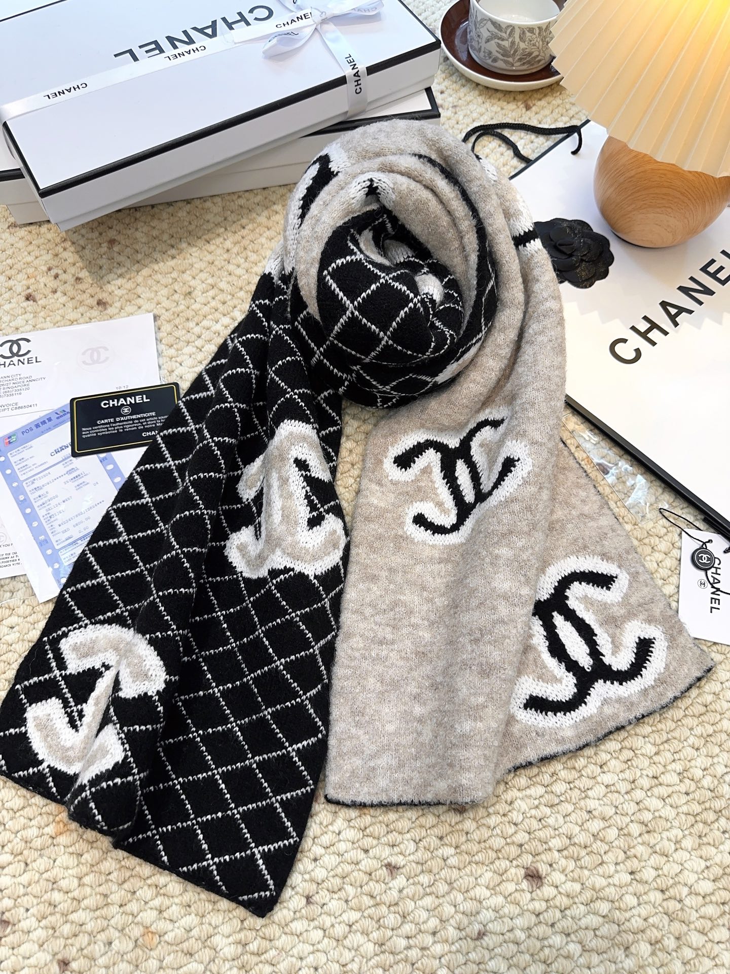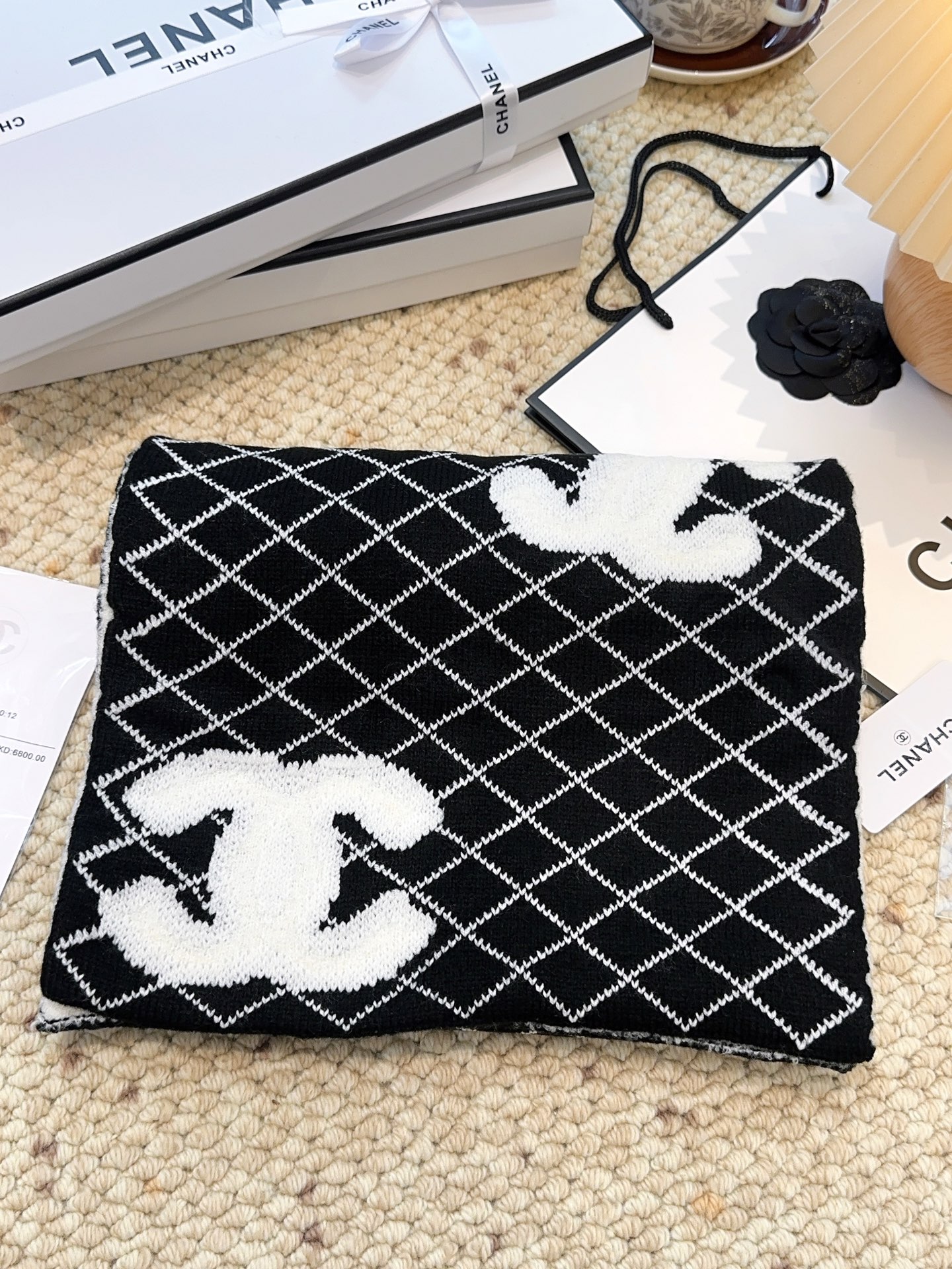 CHANEL(香奈儿)🆕菱格纹羊毛围巾 高级定制面料 一比一还原 软软糯糯棉花糖一样的手感 厚实又保暖 加上双面黑白混搭配色的设计 高级感满满的 小香家这款菱格纹羊毛围巾真的是经典中的经典!规格35:190!材质90%羊毛 10%羊绒
