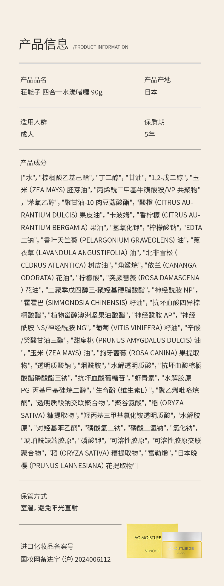 【下单前100名赠送保湿面膜1片】SONOKO荘能子 四合一水漾啫喱90g/瓶 | 日本进口 保湿抗皱 简单护肤 通透明亮