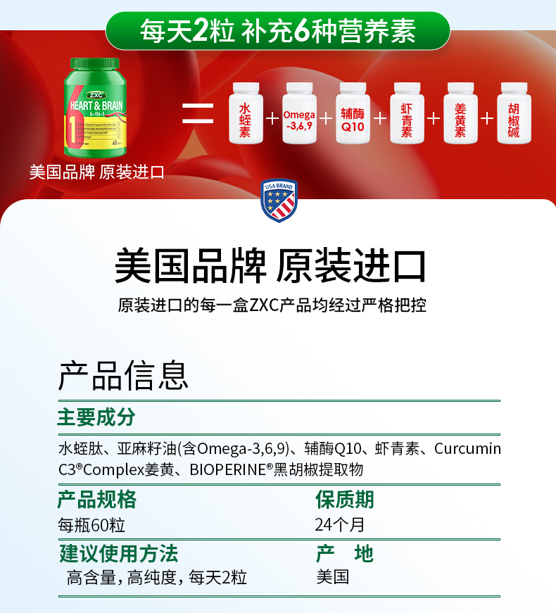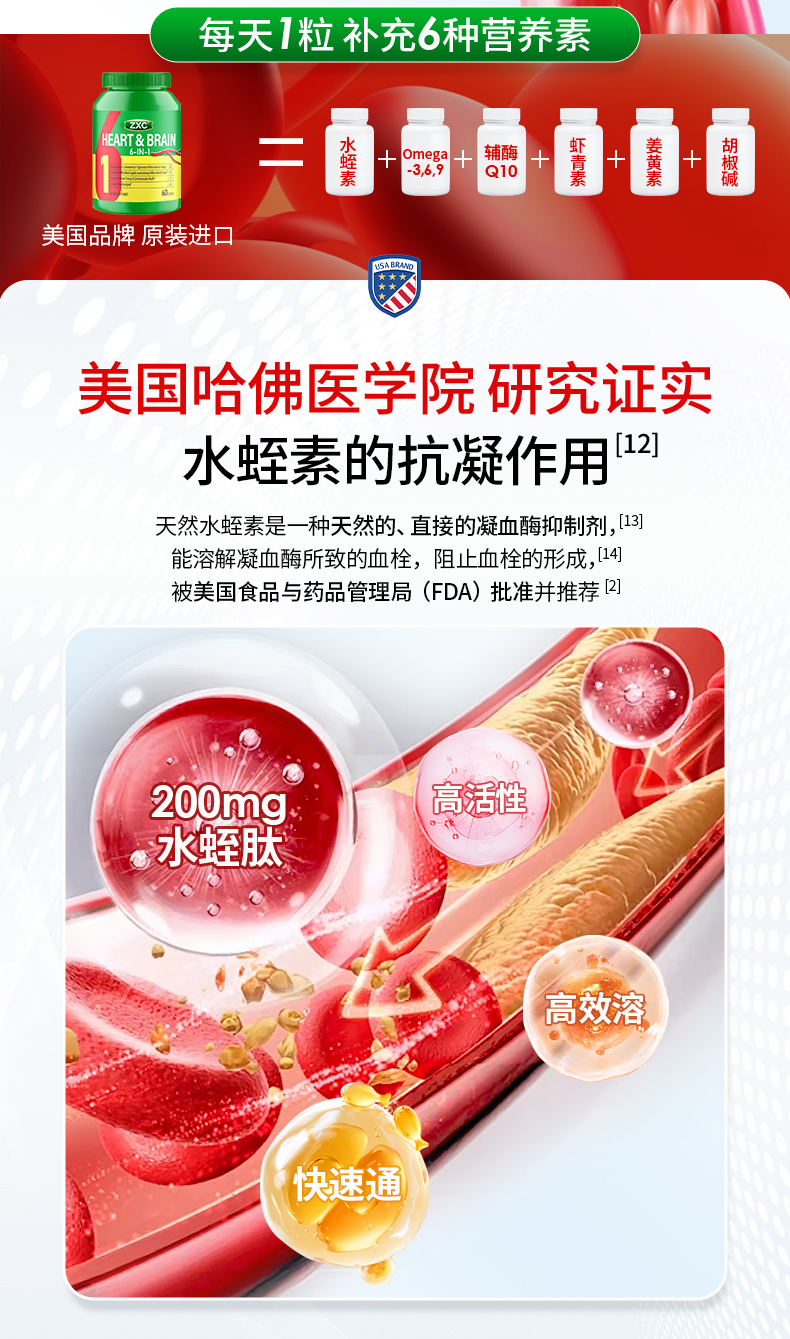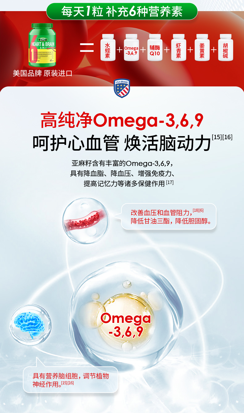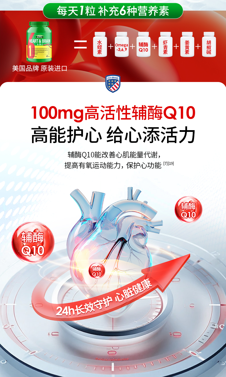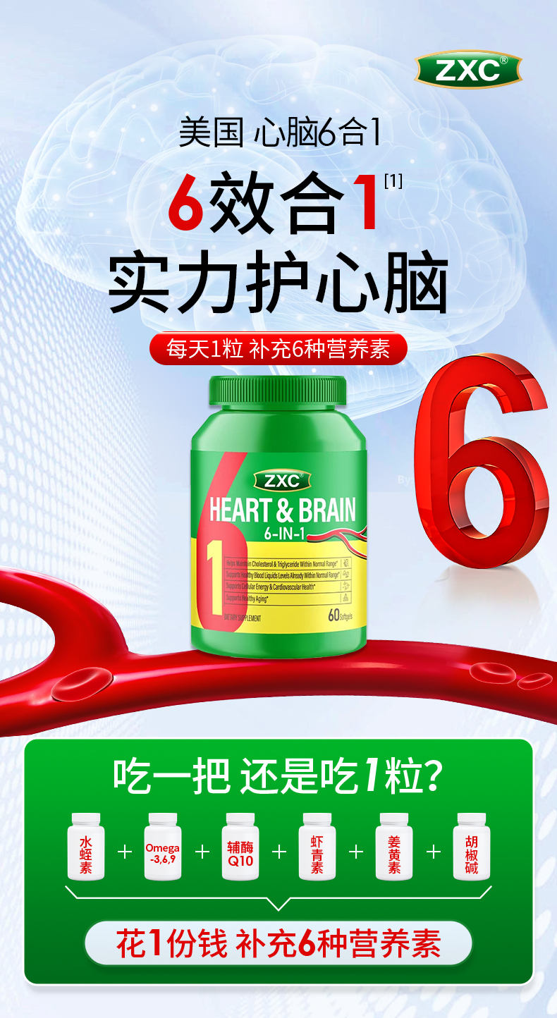 ZXC心脑6合1瓶装美国进口辅酶Q10omega3水蛭肽中老年心脑血管疏通