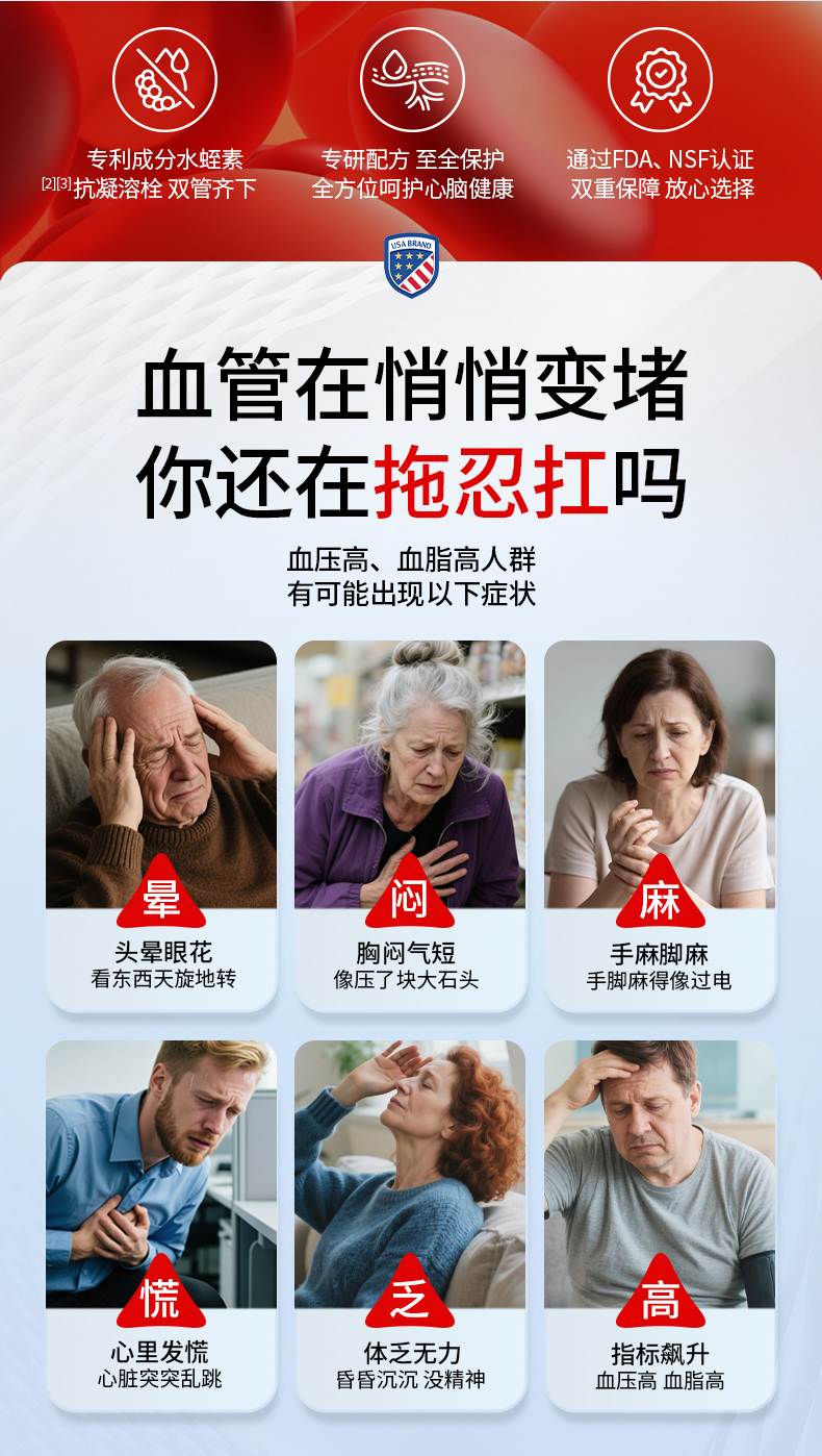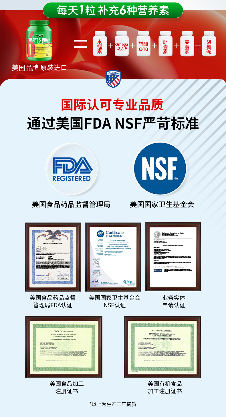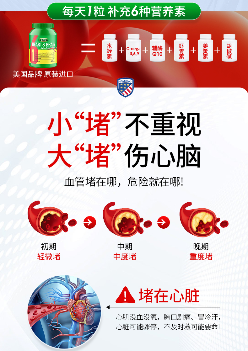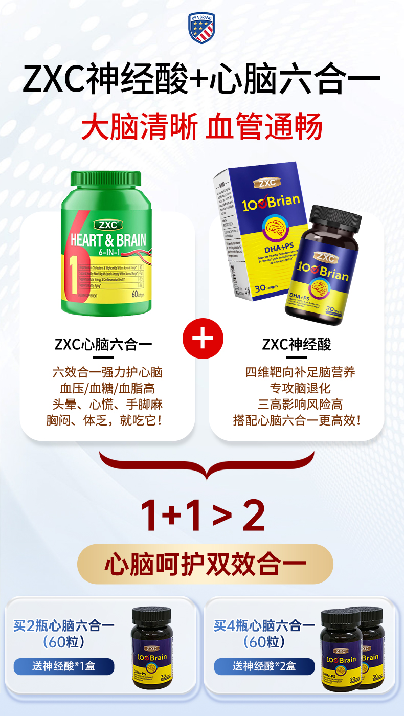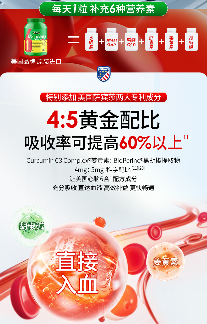 ZXC心脑6合1瓶装美国进口辅酶Q10omega3水蛭肽中老年心脑血管疏通