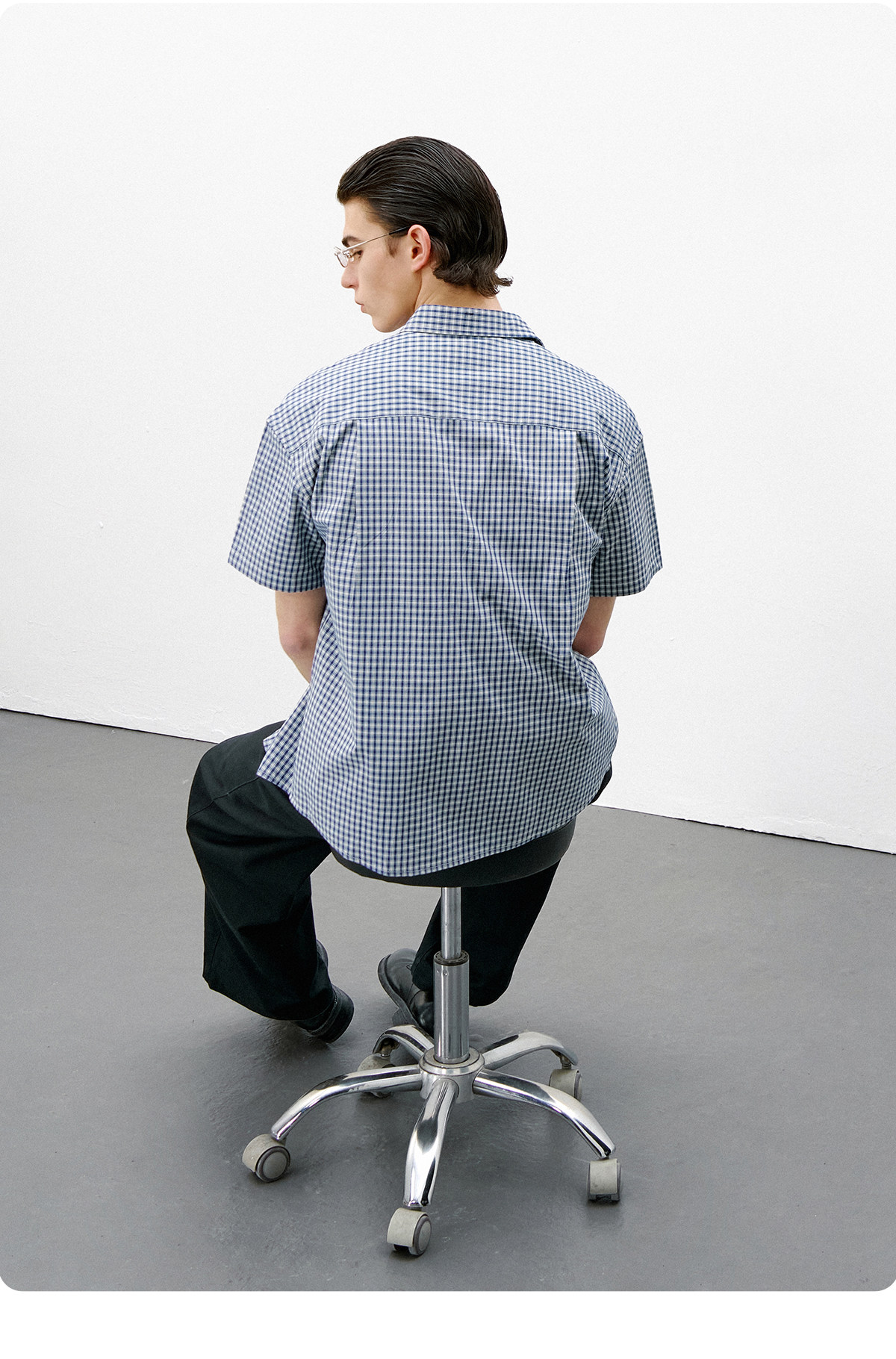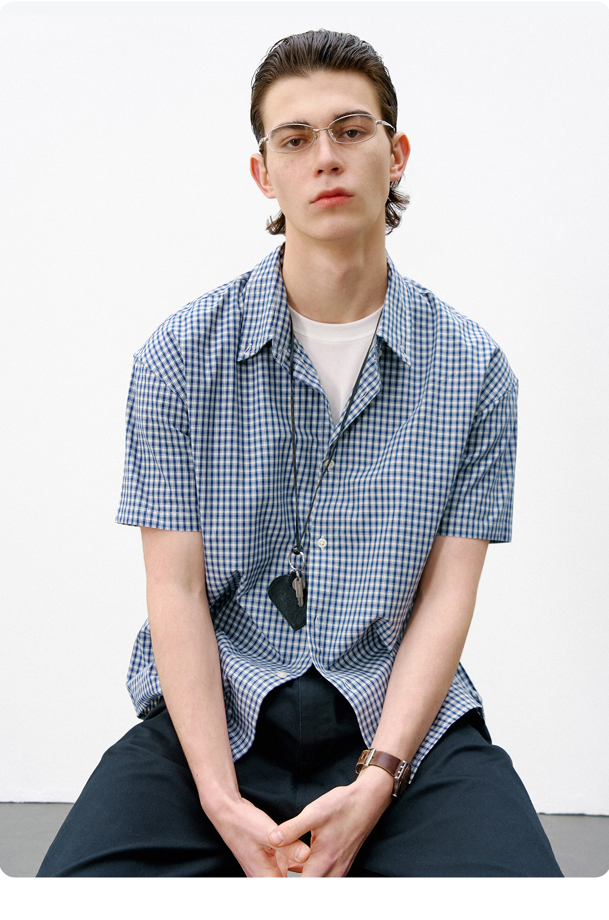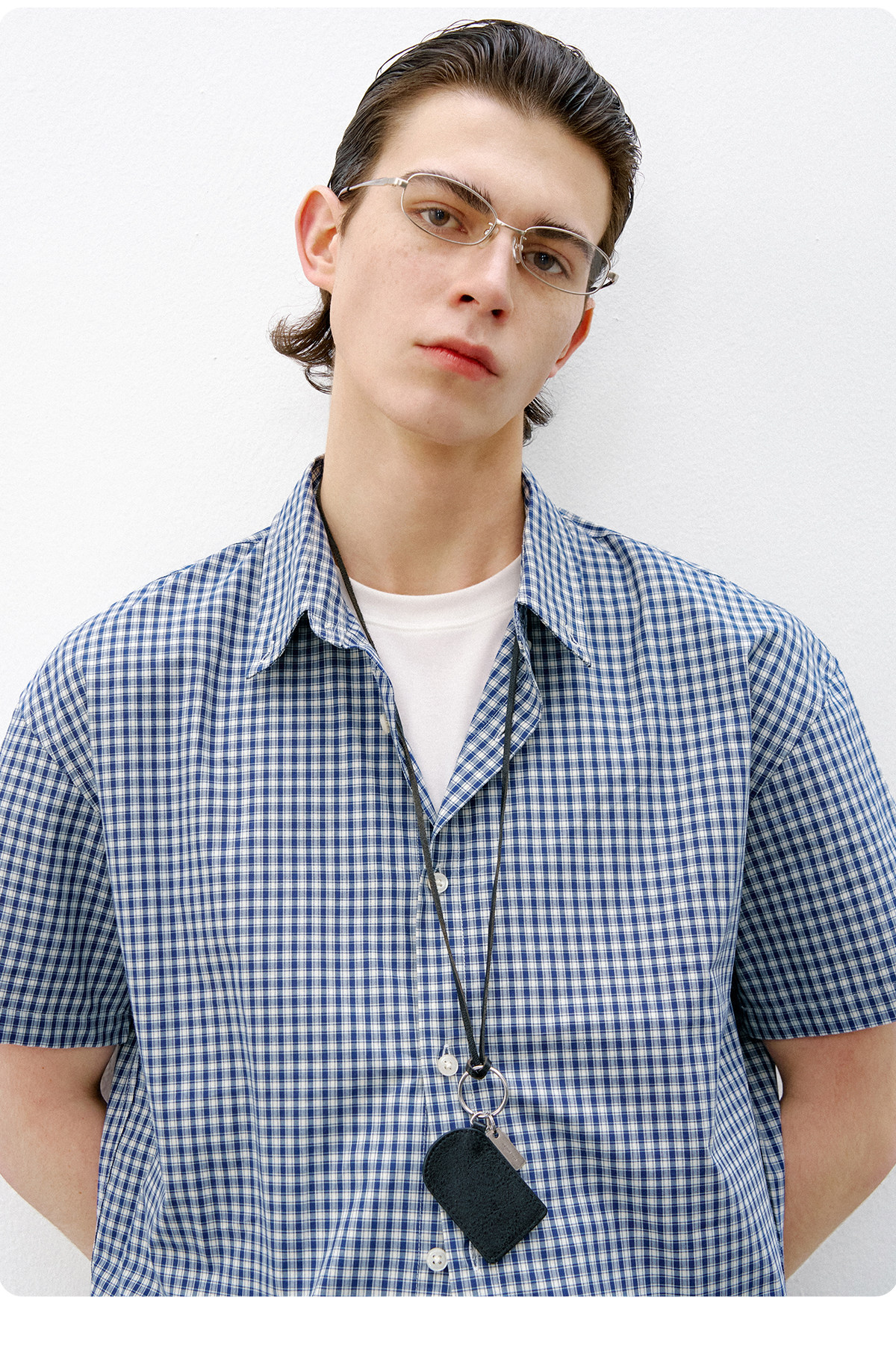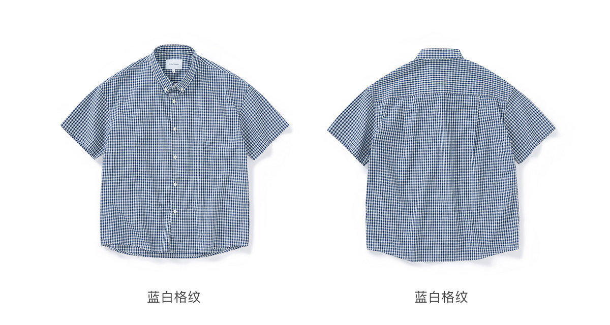 714street休闲宽松纯棉蓝色格子短袖衬衫男2026夏季miu系穿搭衬衣