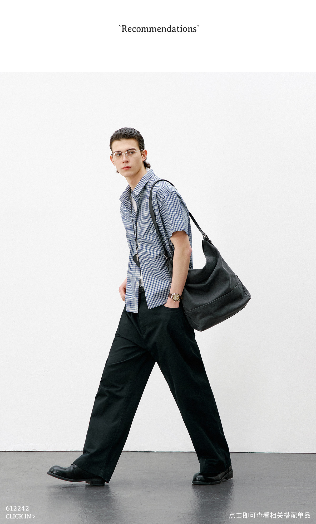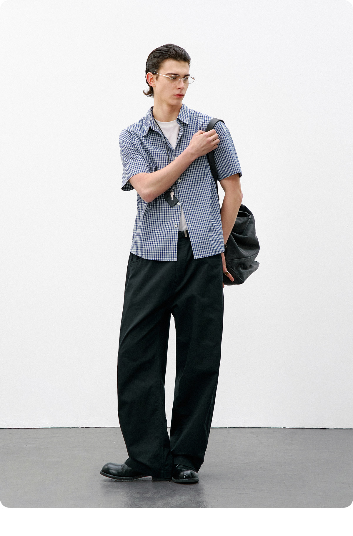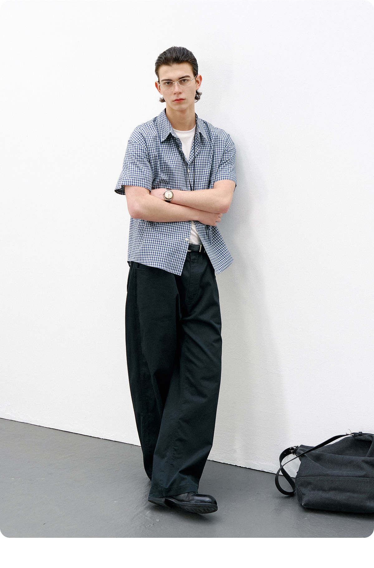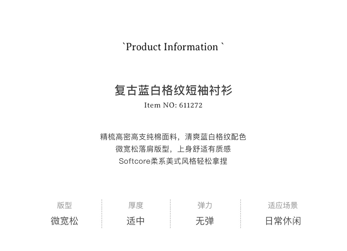 714street休闲宽松纯棉蓝色格子短袖衬衫男2026夏季miu系穿搭衬衣