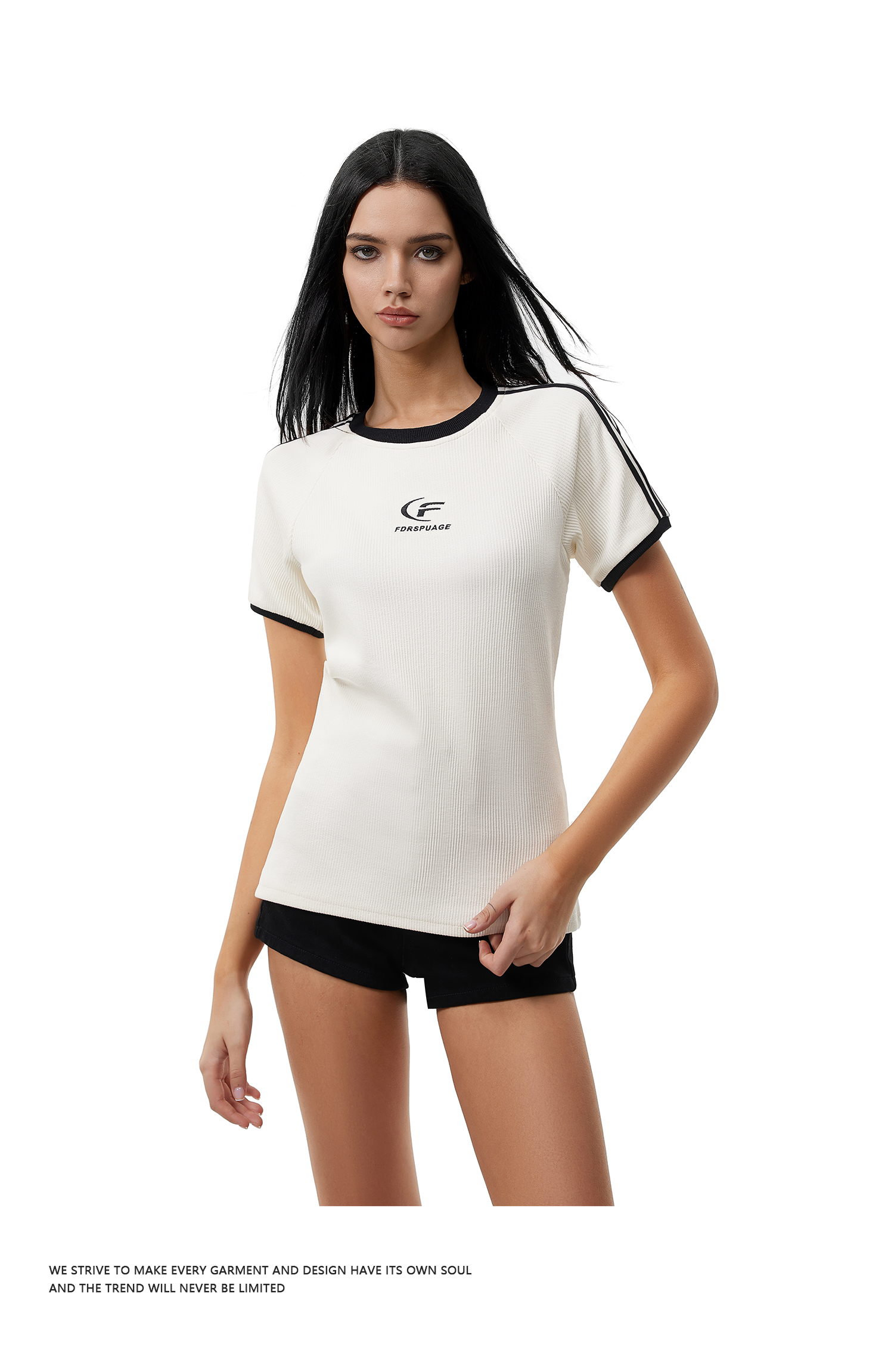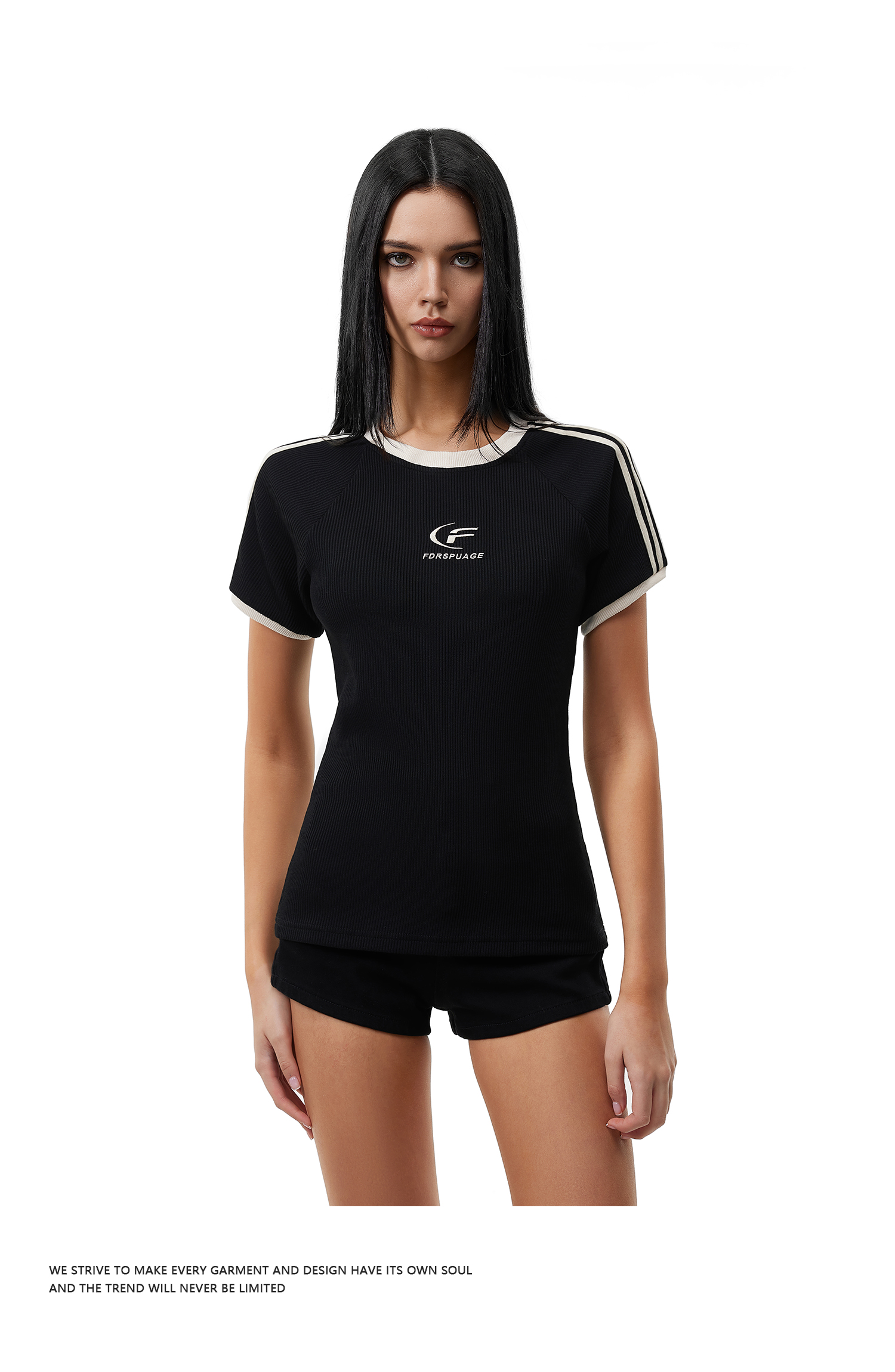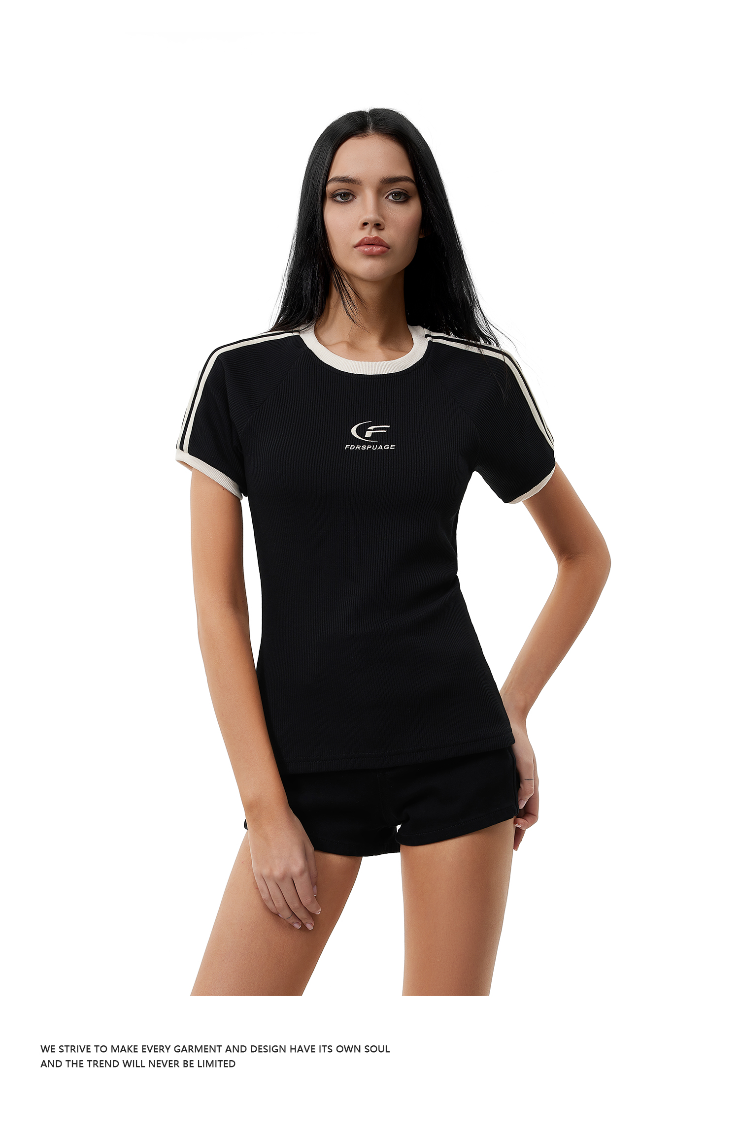FDR官方店 拼接织带月牙印花辣妹短袖t恤女夏季修身显瘦体恤上衣