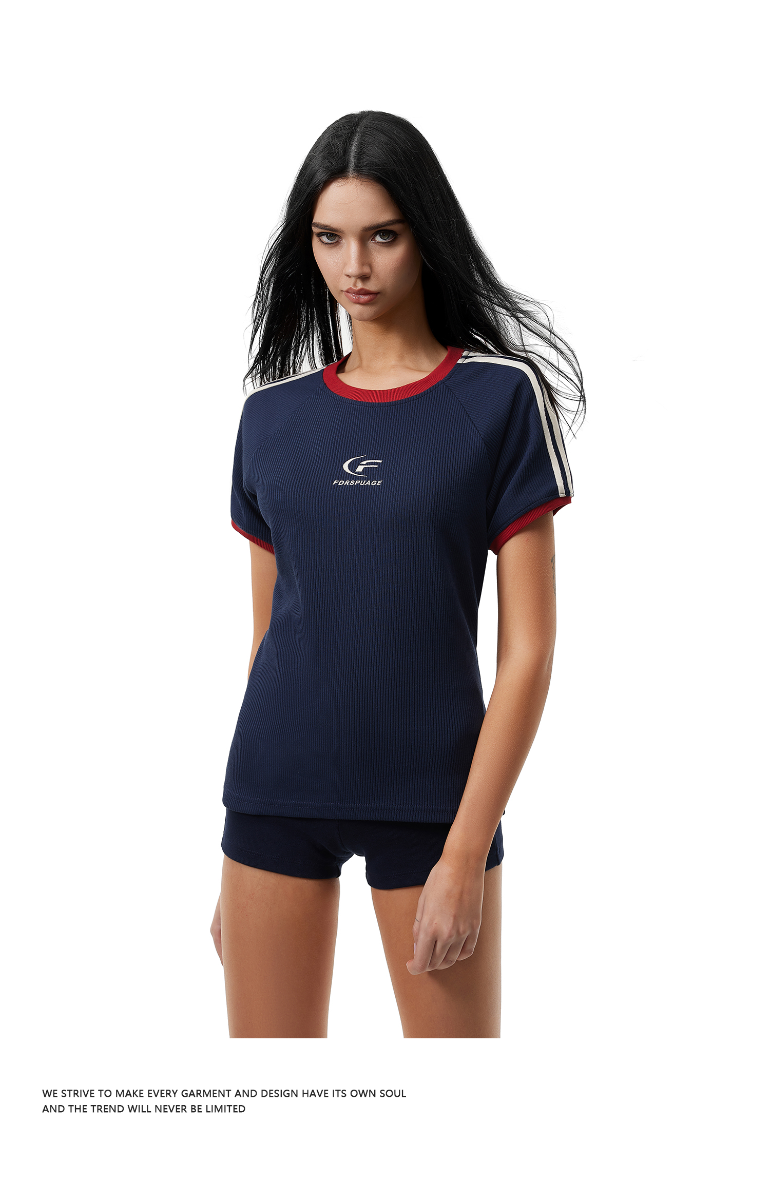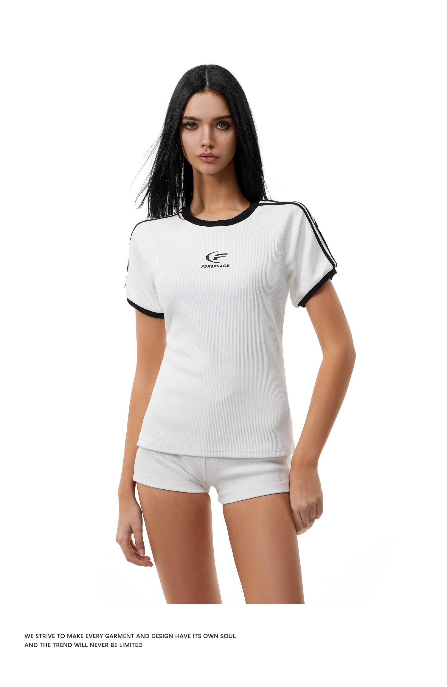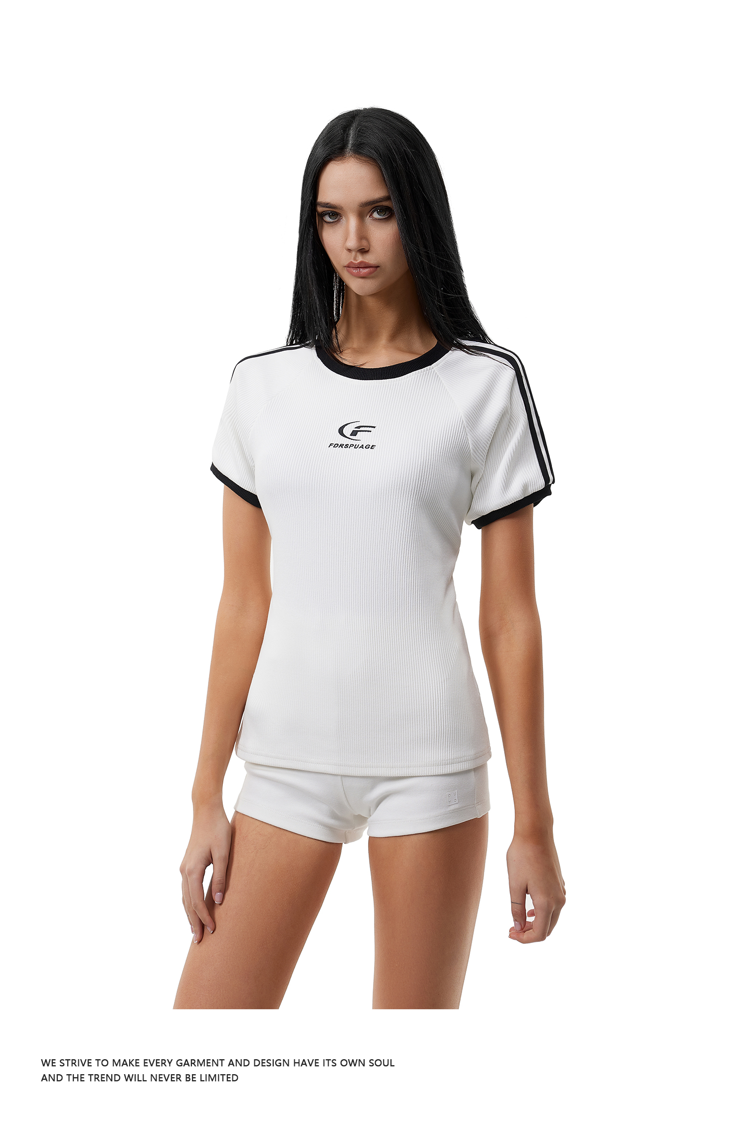 FDR官方店 拼接织带月牙印花辣妹短袖t恤女夏季修身显瘦体恤上衣