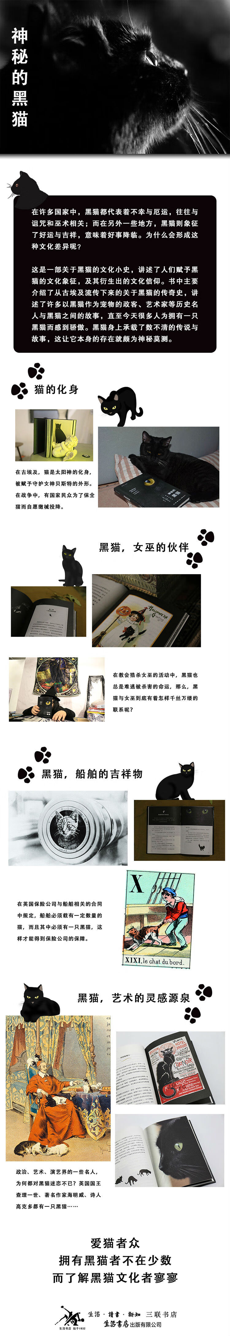 本书介绍了从古埃及流传下来的关于黑猫的传奇历史,以及演变到现代之后黑猫身份的转变,直至今天,很多人为拥有一只黑猫而感到骄傲。本书还讲述了许多以黑猫作为宠物的政客、艺术家等历史名人与黑猫之间的故事,这与地狱恶魔没有任何关系。比如19世纪末,巴黎蒙马特高地的一家夜总会以一只黑猫作为广告标志,这里很快就成为巴黎人的必去之地!总之,无论哪个国家、哪个时代,无论象征着不幸还是吉祥,黑猫身上都有着数不清的传说与故事,这也让它成为了猫族中特别的存在。