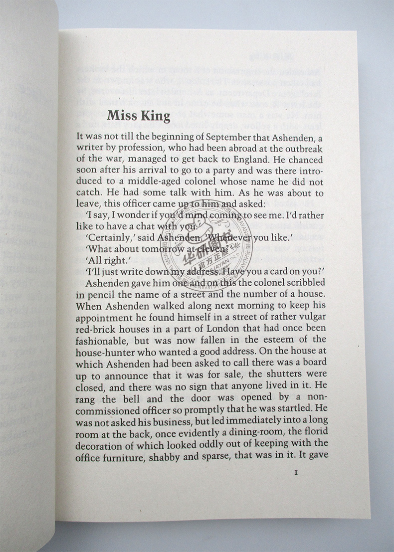 It was not till thebeginning of September that Ashenden, a writer by profession, who had been abroad at the outbreak of the war, managed to get back to England. He chanced soon after his arrival to go to a party and was there introduced to a middle-aged colonel whose name he did not leave, this officer came up to him and asked: