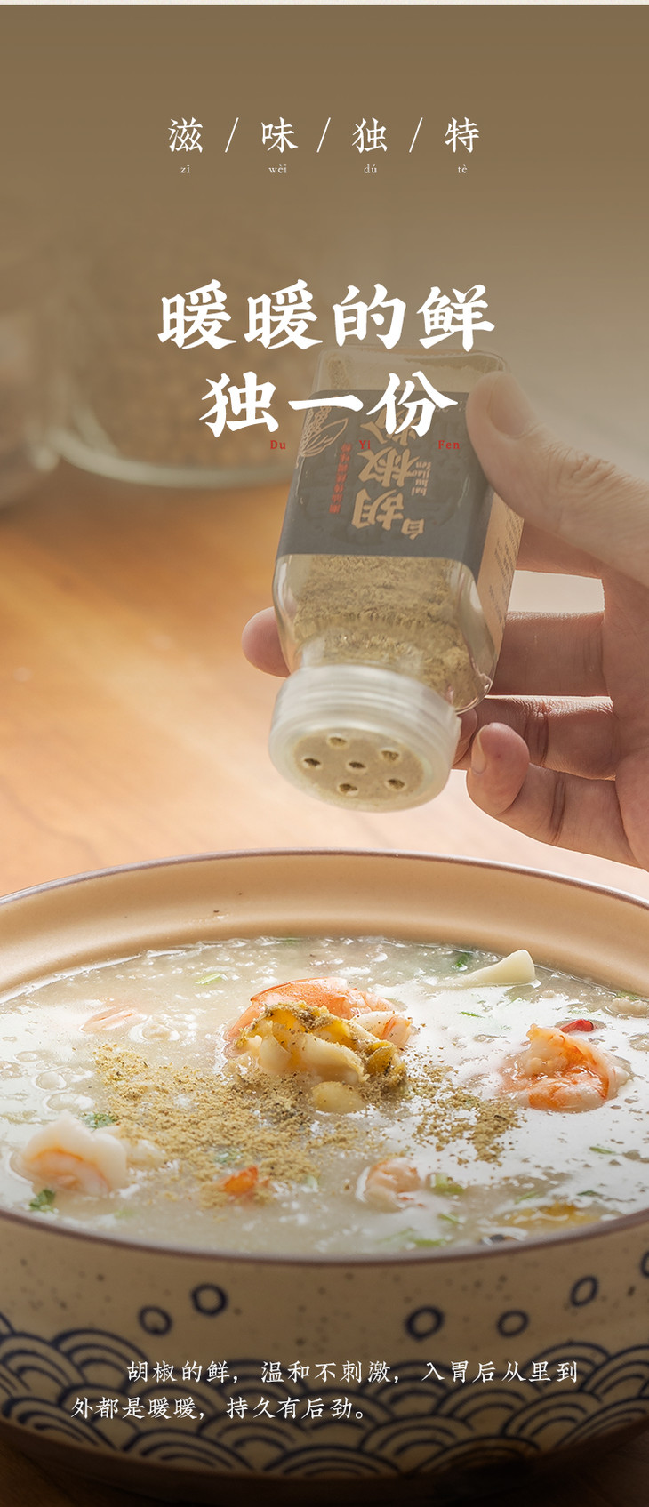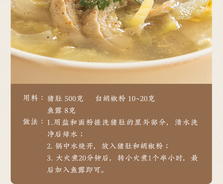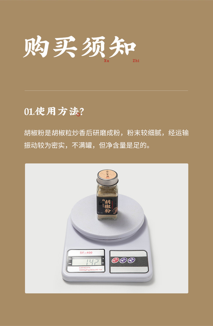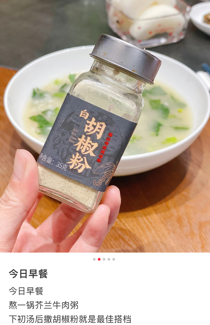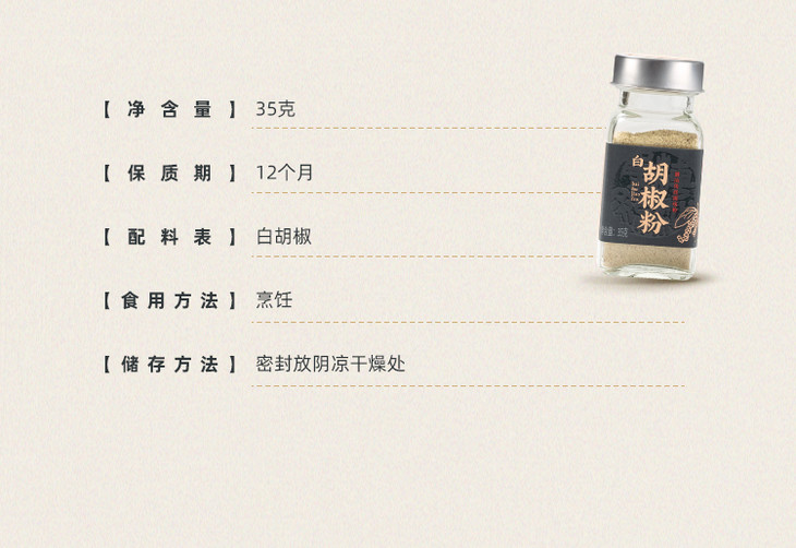 白胡椒粉采用简约实用的玻璃瓶包装,密封性好,能够有效保护胡椒粉的新鲜度和风味。食用方法就看个人喜好啦,我是各种都要加一点的,尤其是做汤面,必放,热气腾腾一碗,呼噜下去,感冒都能好!平时煮肉肉时,也可以加些,去腥增香,也更有层次感,做海鲜也非常需要,绝对是潮汕海鲜砂锅粥和潮汕蚝烙的灵魂调味品哦,还有煲汤煮面,更是不可缺哦,就算是蔬菜沙拉,撒上少许也能够增添一抹辛辣的风味,好吃度up!