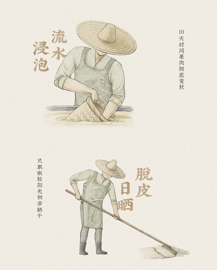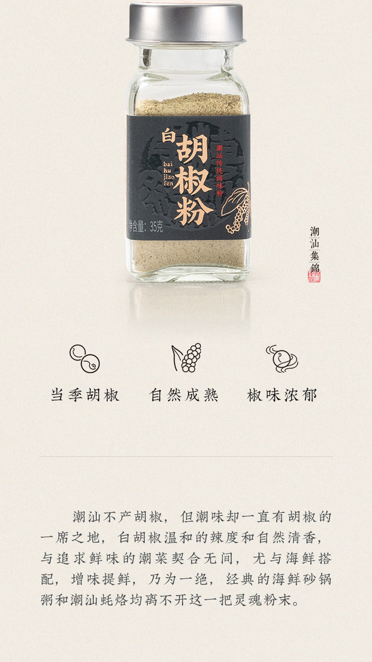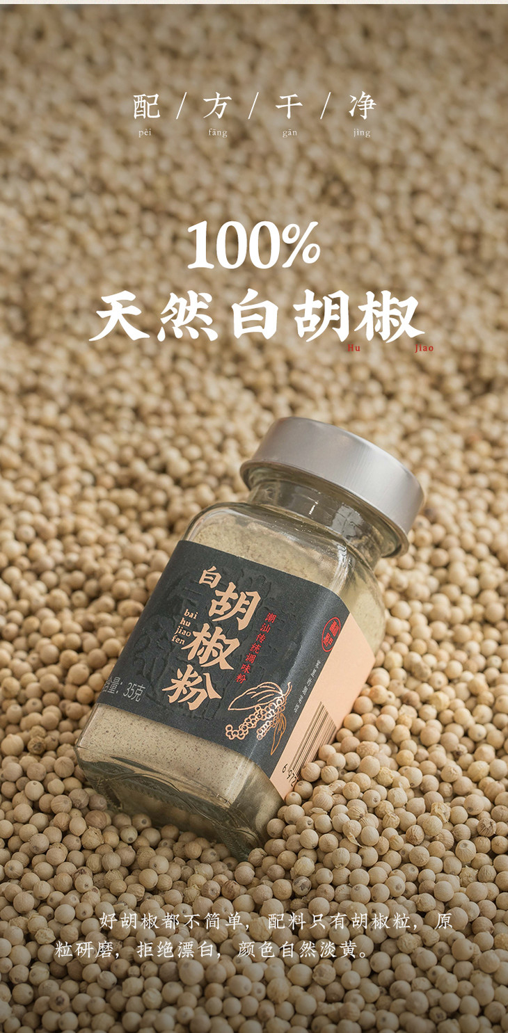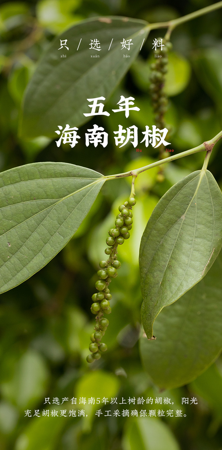 潮汕虽然不产白胡椒,但白胡椒粉在潮汕菜中却是有着重要的一席之地。品牌选用海南五年以上树龄的胡椒,自然成熟的胡椒,保留天然香气,温和的辣度和自然清香与潮汕菜的鲜味也是完美契合。工人们手工采摘胡椒后,需要将胡椒粒放入流水中浸泡10天,确保果肉彻底变软,为后续加工打下基础。然后,只取椒粒,阳光初晒后炒制,含水率也被严格控制在12%以内,干净细腻,香气浓郁。最后,原粒研磨,拒绝漂白,颜色也是自然淡黄,保留胡椒的天然风味!白胡椒粉的原料只有天然的胡椒粒,拒绝任何添加剂、香精、色素和防腐剂。