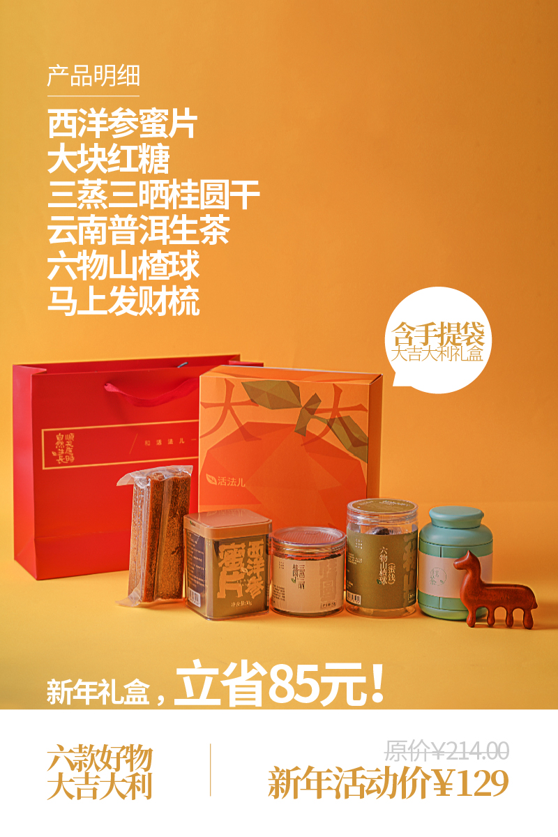 2026新年大吉大利礼盒。原价214新年活动价129立省85.六款好物另含礼袋。内含大块红糖1块,西洋参蜜片,三蒸三晒桂圆干,六物山楂球,云南普洱生茶,马上发财梳子。