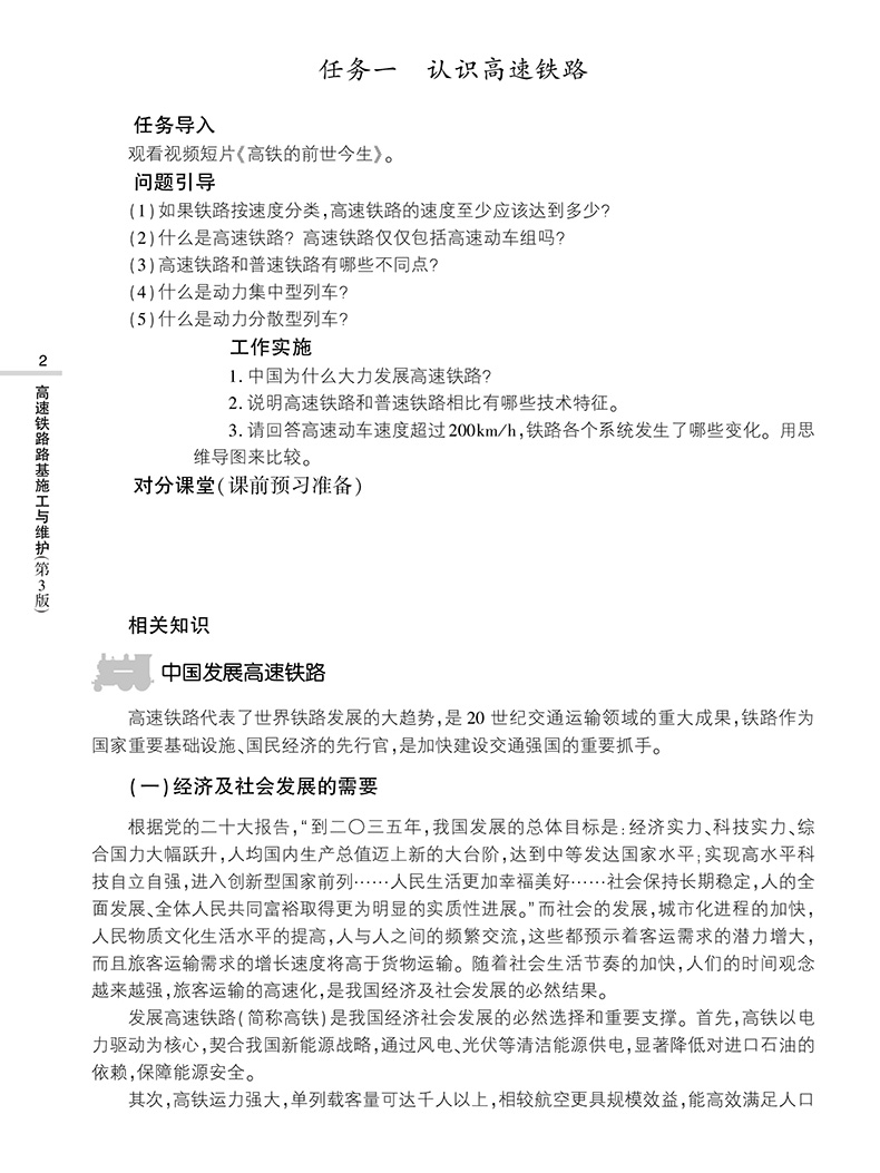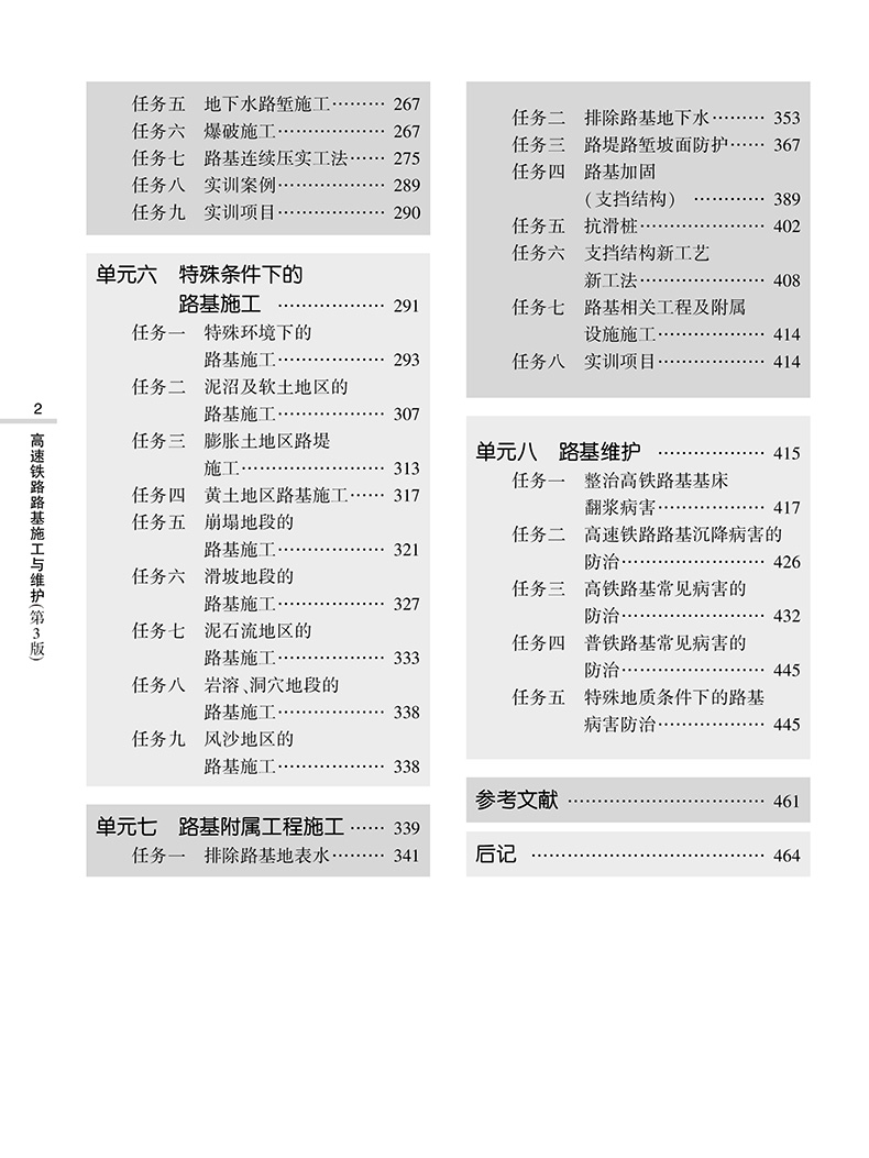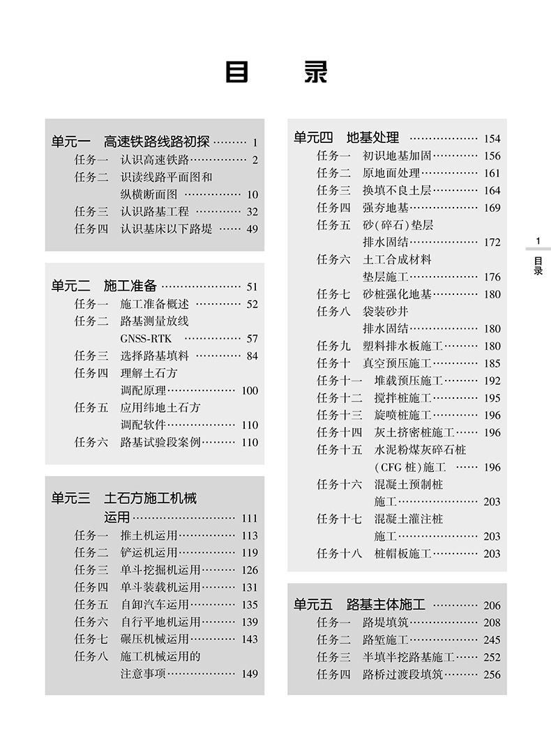 本教材按照路基施工的基本工序来安排内容,全书共八个单元:单元一介绍高速铁路线路的技术特点及路基设计基本要素;单元二介绍施工准备,包括测量放线和土石方调配;单元三介绍土石方施工机械的运用等;单元四介绍地基处理技术;单元五介绍路基主体施工;单元六介绍特殊条件下的路基施工;单元七介绍路基附属工程施工,包括排水与防护加固工程施工;单元八介绍路基维护。针对高速铁路路基施工所采用的新技术、新工艺、新设备和新材料,教材中配套了相关视频,学生扫描书中二维码即可直接在线观看。本教材适用于高职高专高速铁路施工与维护、铁道工程技术、城市轨道交通工程技术等专业的课程教导,也可供相关工程技术人员培训或自学使用。