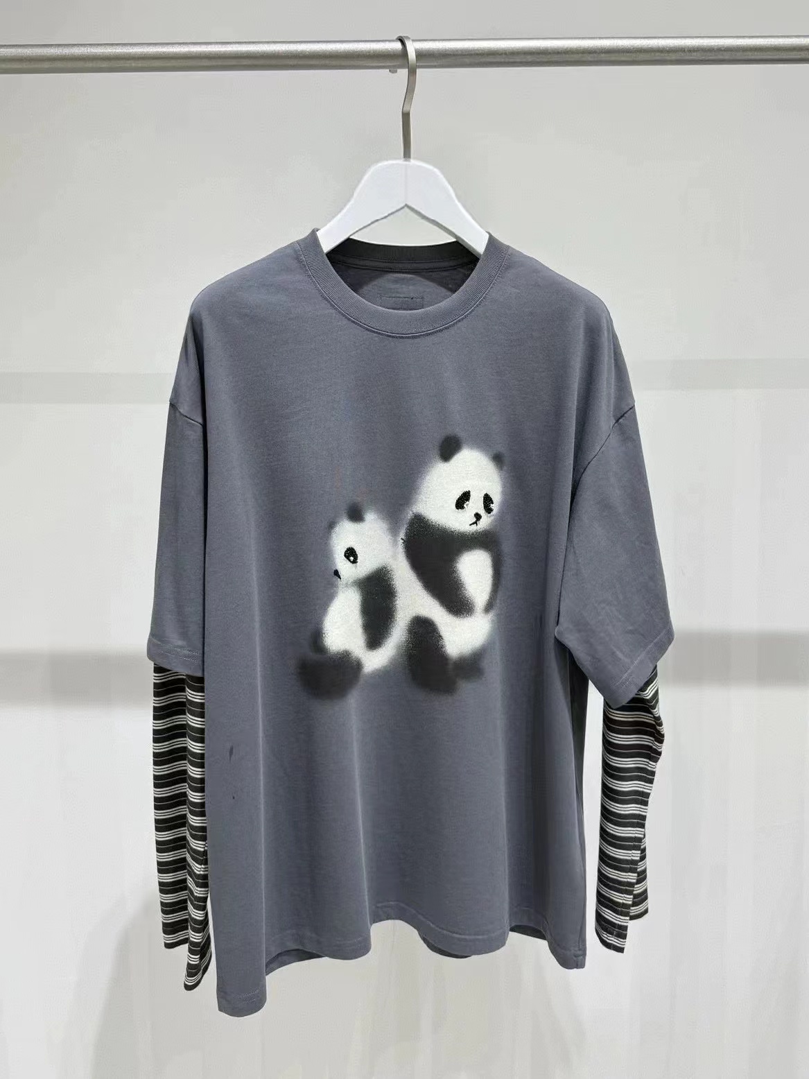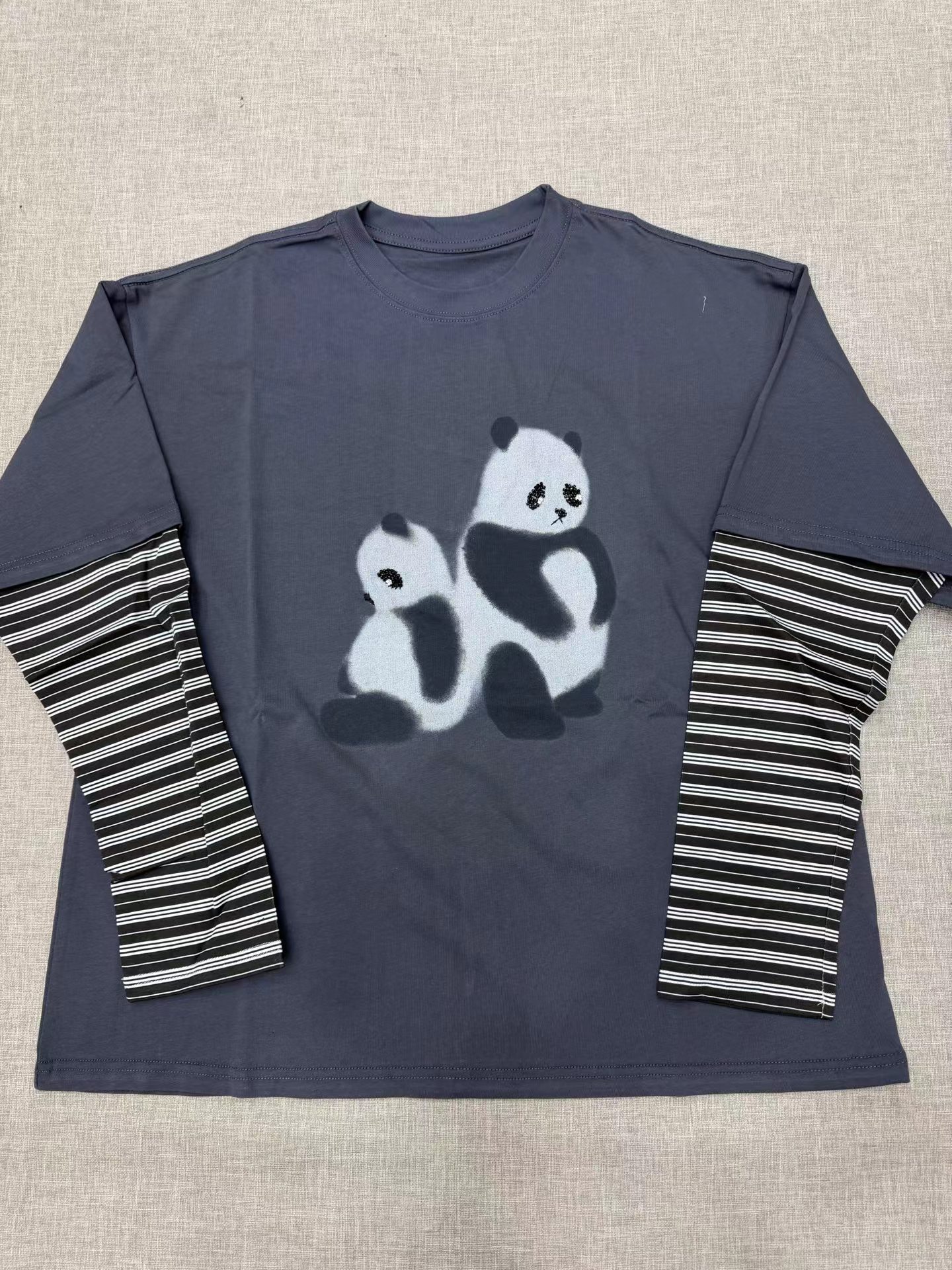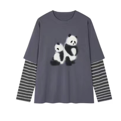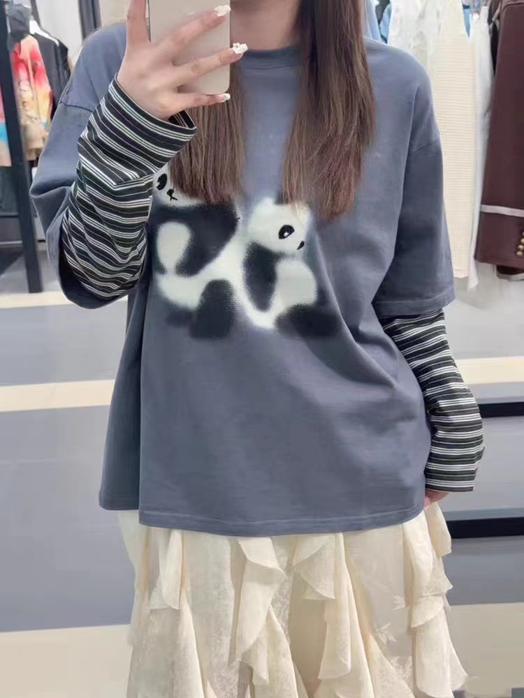 2026新款「伤心小熊」条纹假两件套 T恤卡通图案