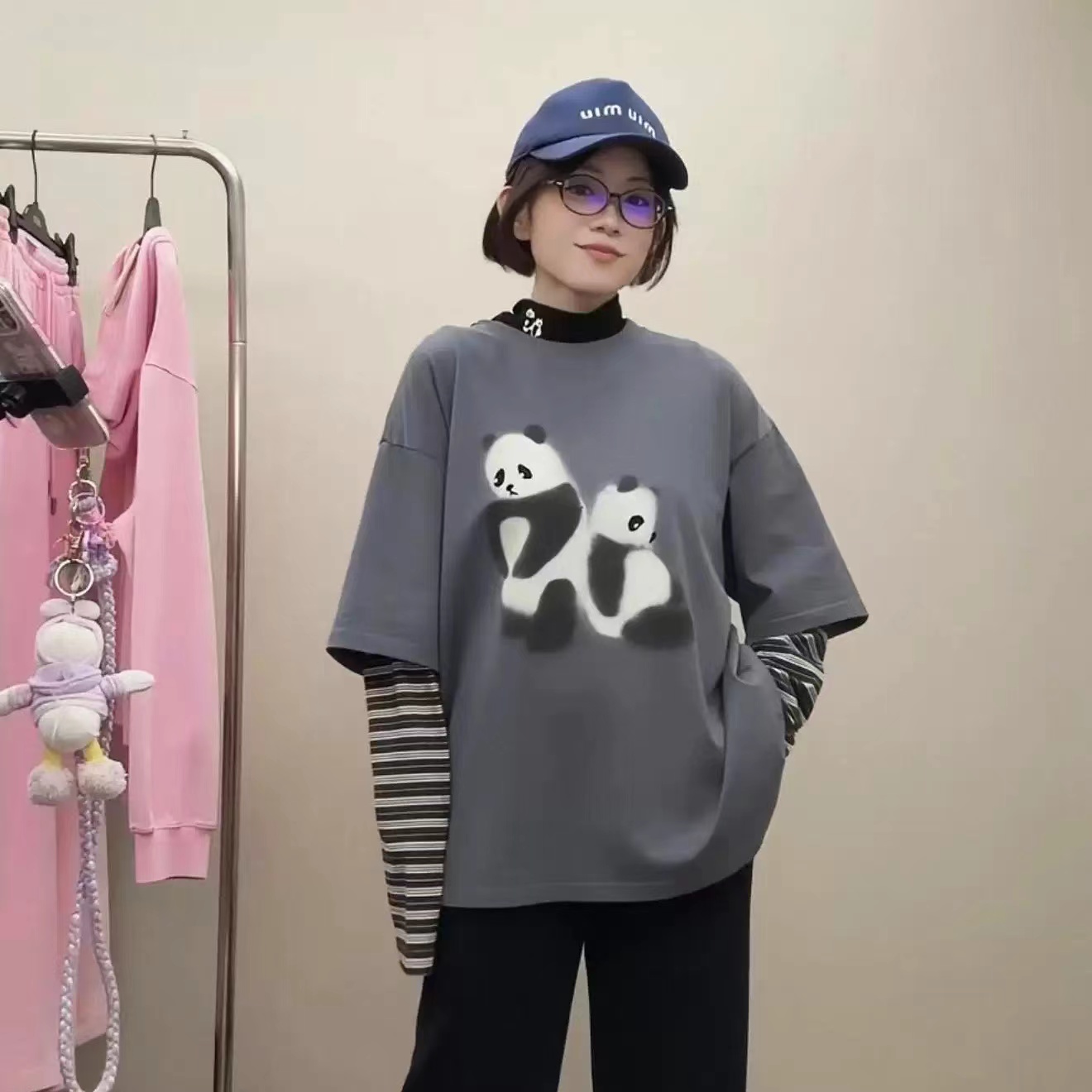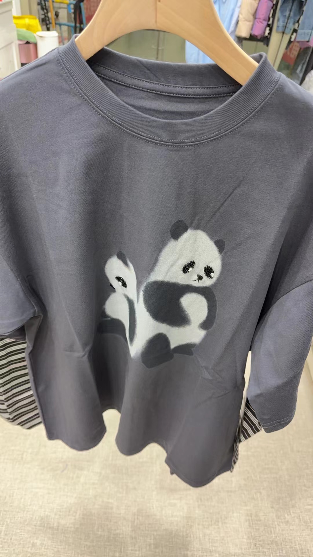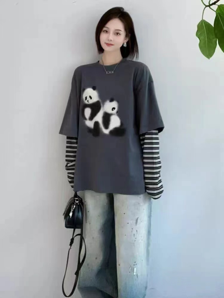 2026新款「伤心小熊」条纹假两件套 T恤卡通图案