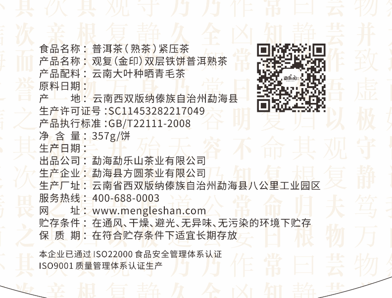 勐乐山盛世典藏(金印)双层铁饼熟茶357g