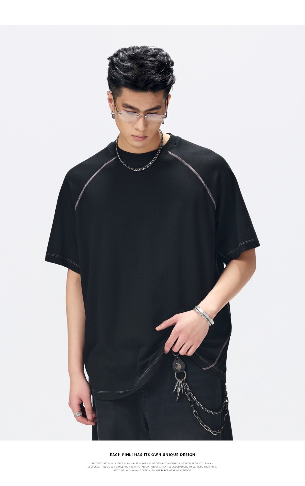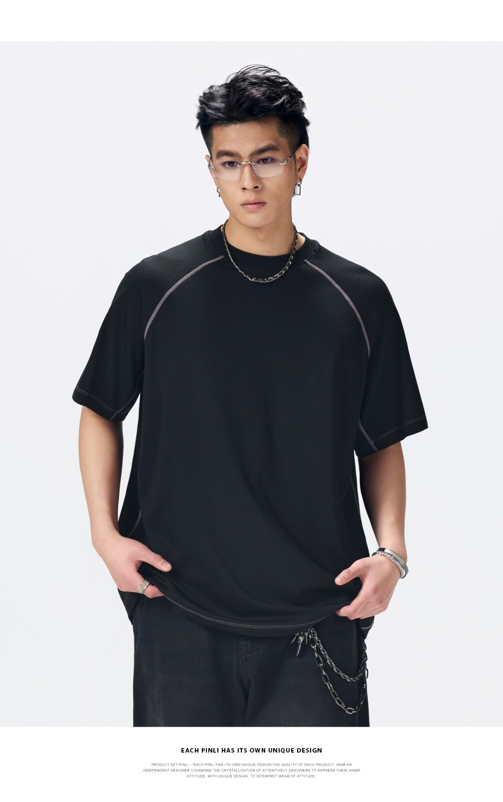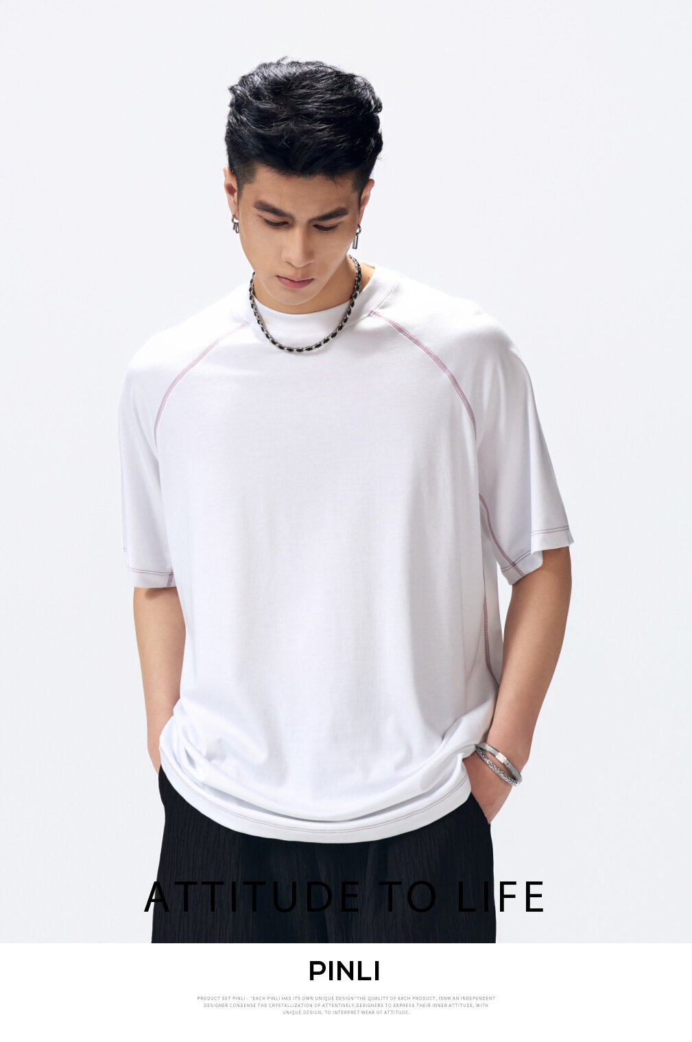 PINLI品立2026夏季新款男线条纯色打底上衣宽松圆领连肩袖短袖T恤GD262111027