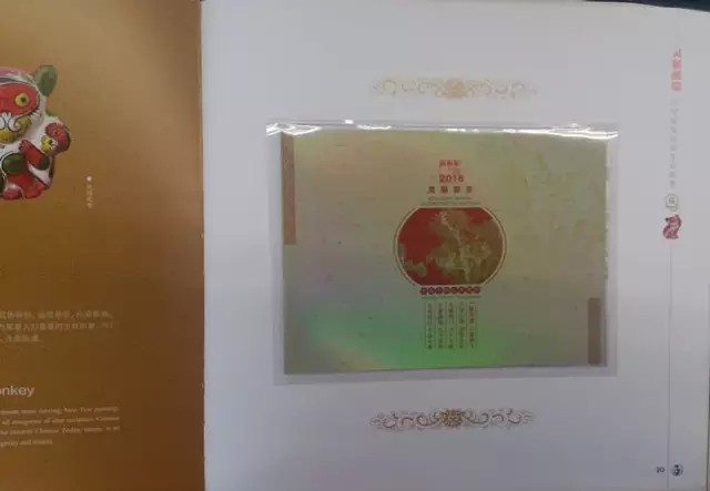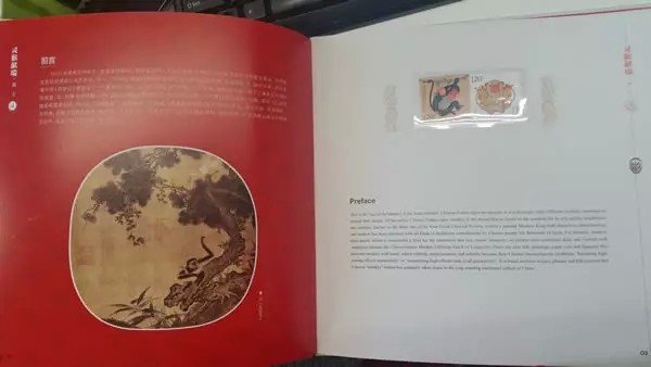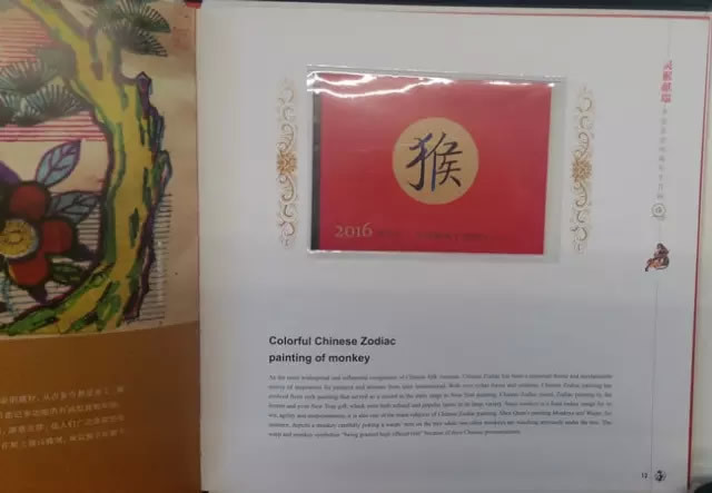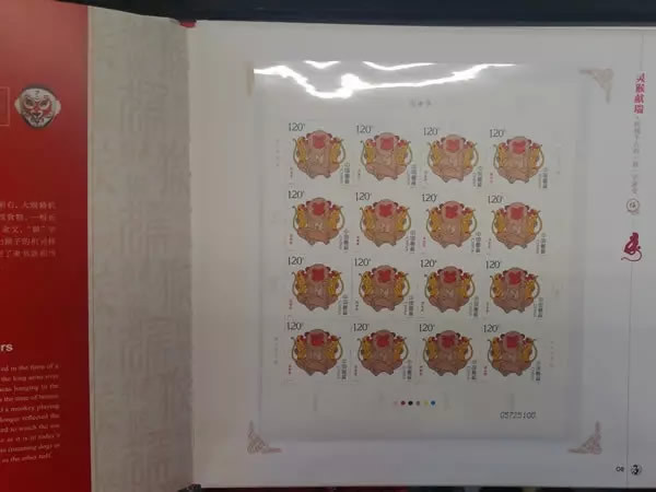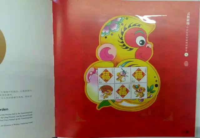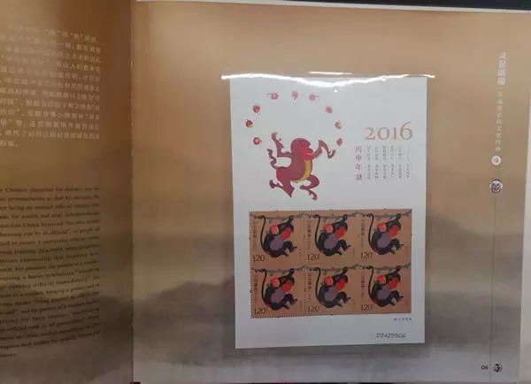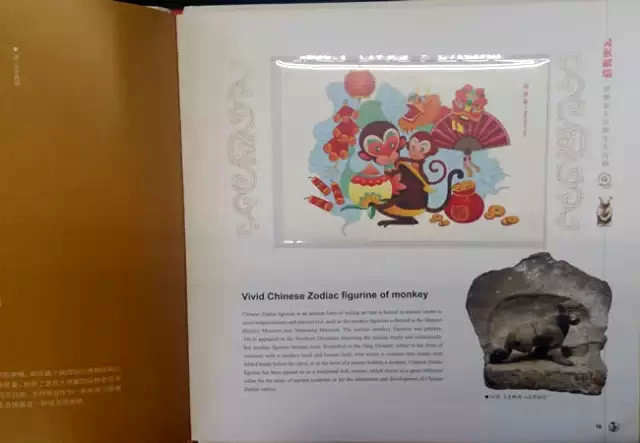继续翻页,册子的页面布局规律,都遵循左边页介绍与猴年相关的文化、历史、艺术等,右边页安插邮票藏品: