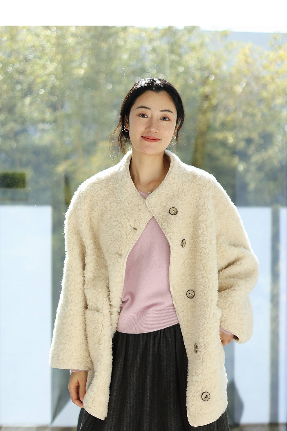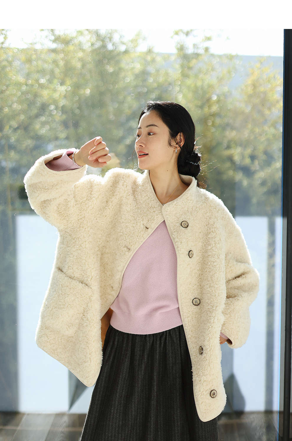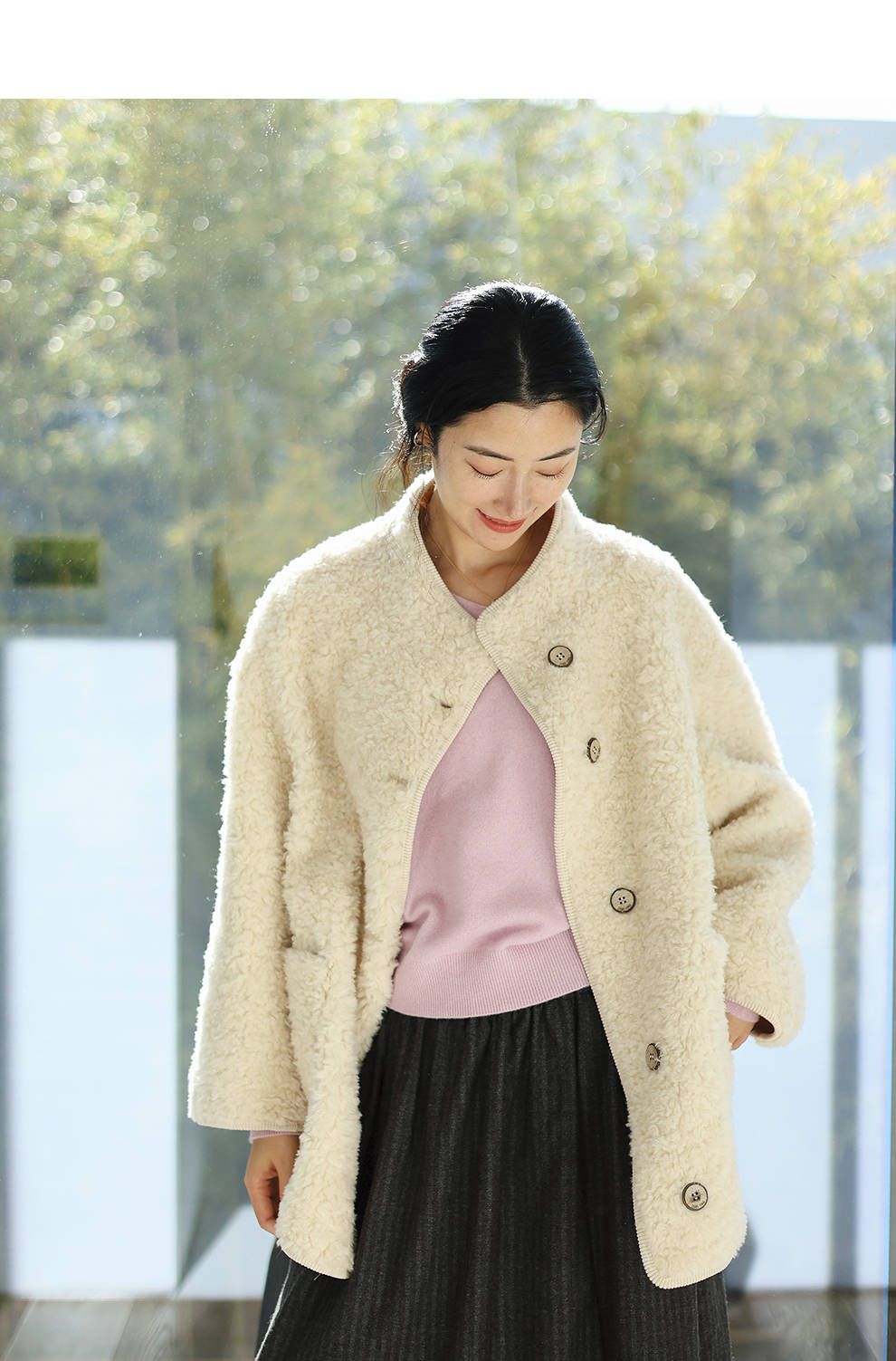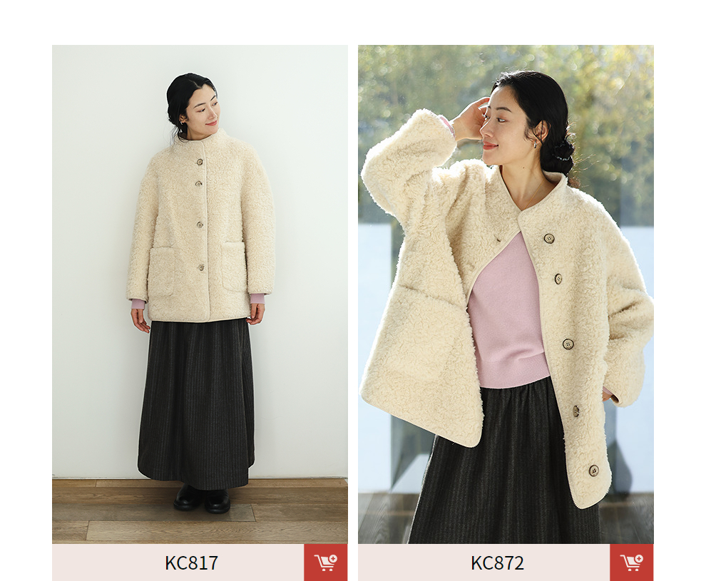 绽放881朵/纯羊毛绒感设计羊羔毛贴袋中长款外套女毛呢大衣冬新款