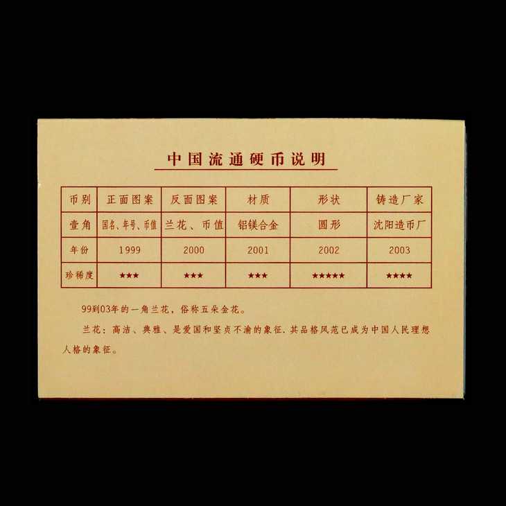 本套装包含99年到2003年的5枚铝制兰花硬币,这5枚硬币经国家短暂发行,如今已很难寻觅到了,尤其02年的铝兰花,最为稀少。原光保存不易,且买且珍惜。