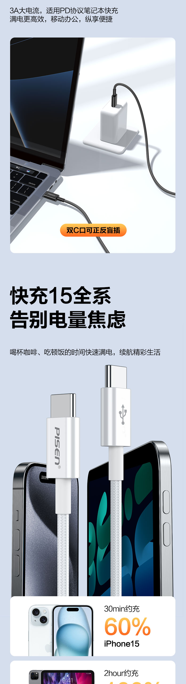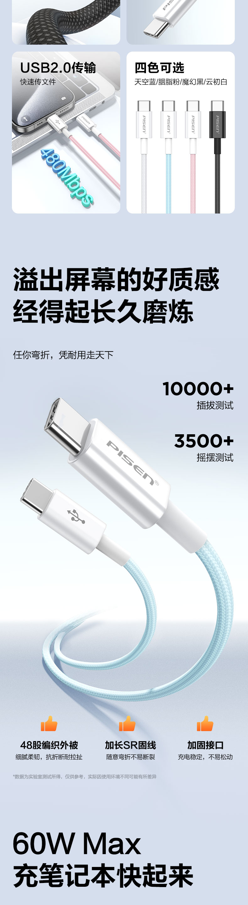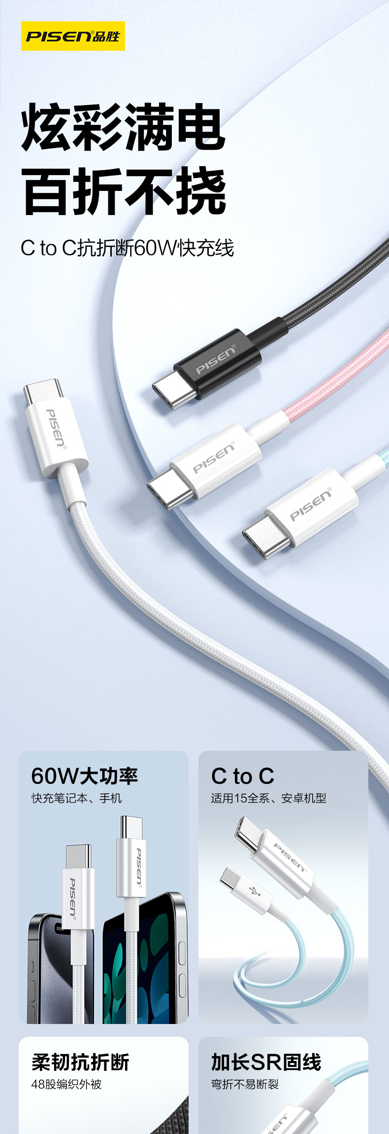 品胜 C to C抗折断60W快充线1.2米/2米 Type-C数据线双头PD60W快充适用iPhone15