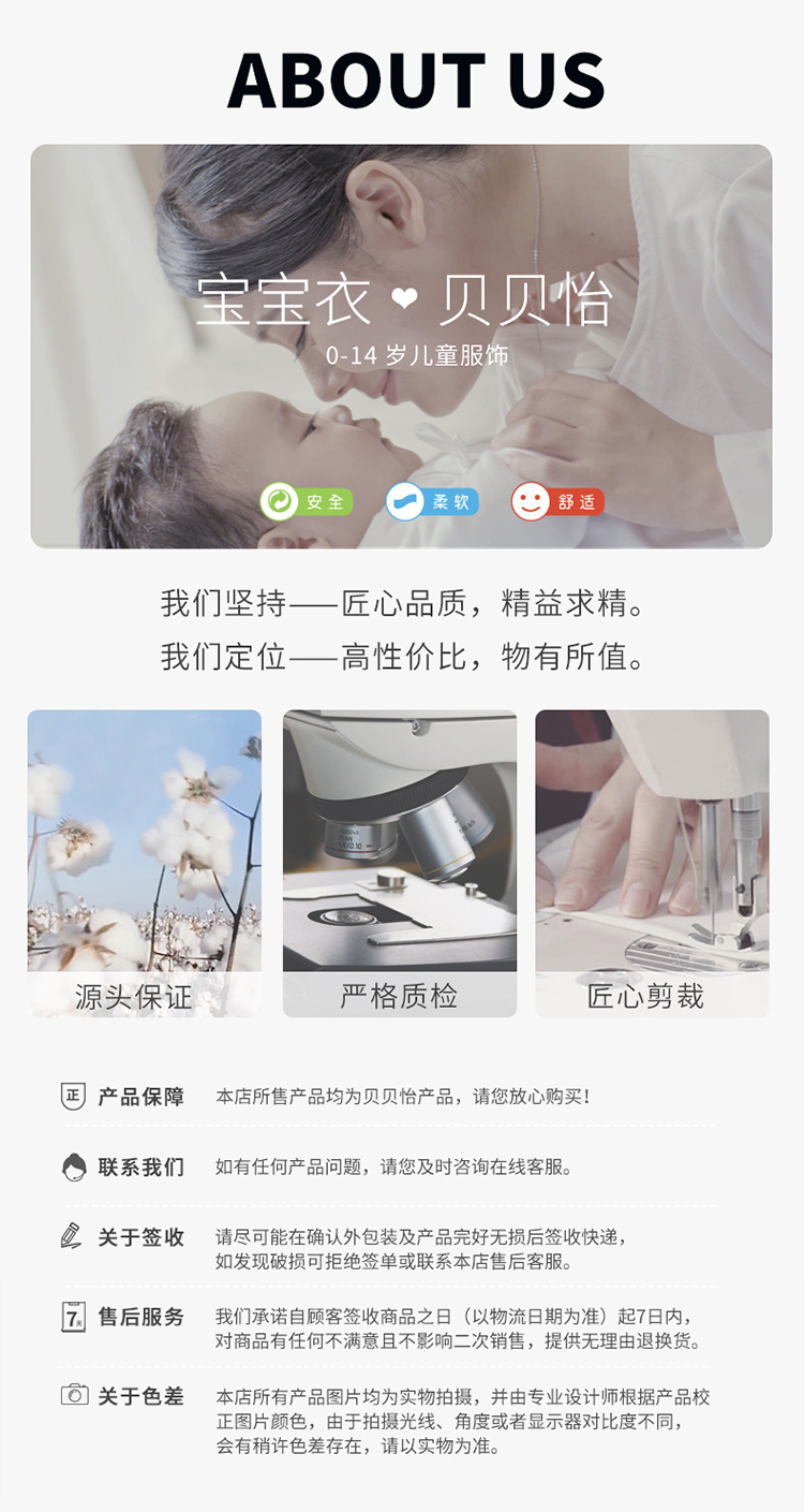 - 贝贝怡专注0-6岁婴幼儿服饰,坚持安全、柔软、舒适的产品理念,为千万中国家庭提供超高品质、安全可靠的婴幼儿服饰产品,妈妈放心,宝宝开心!