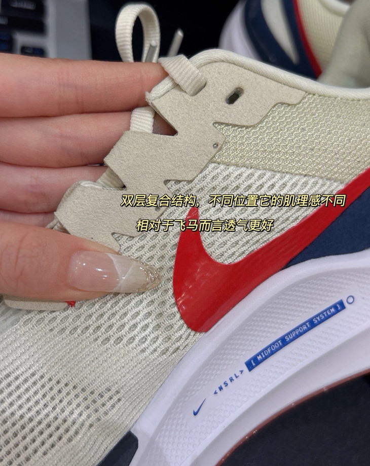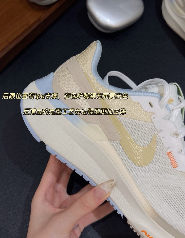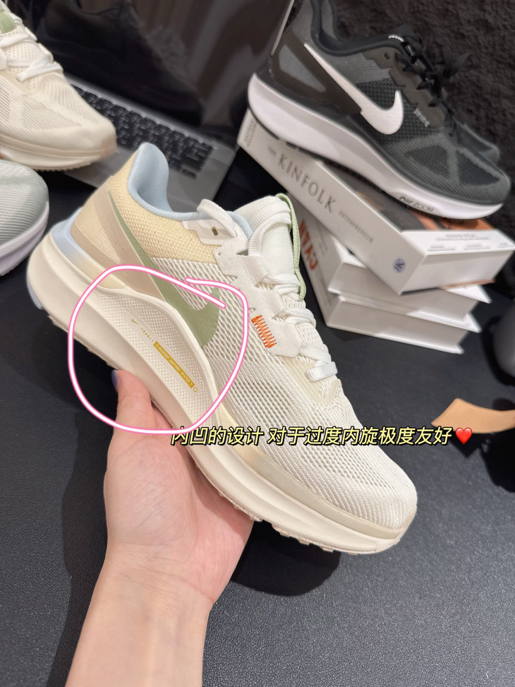 前掌配备Air Zoom气垫,提供出色的回弹力。最值得关注的是中底结构的调整:不再像以前那样坚硬且不易弯折,而是增加了中底的柔软度和支撑材料,减少了稳定性与支撑性之间的矛盾,有效防止跑步过程中脚踝过度内旋。