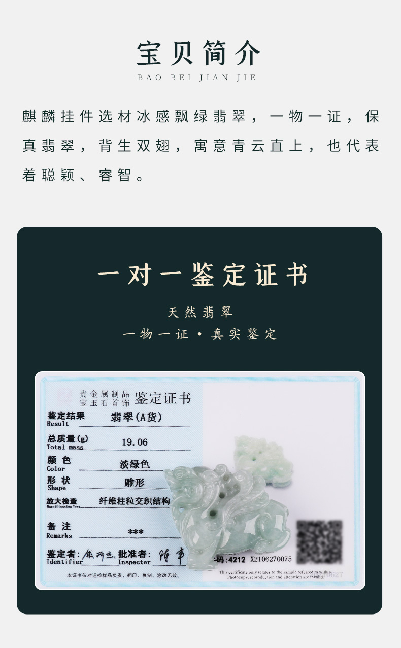 【翡翠飞天麒麟挂件】带证书