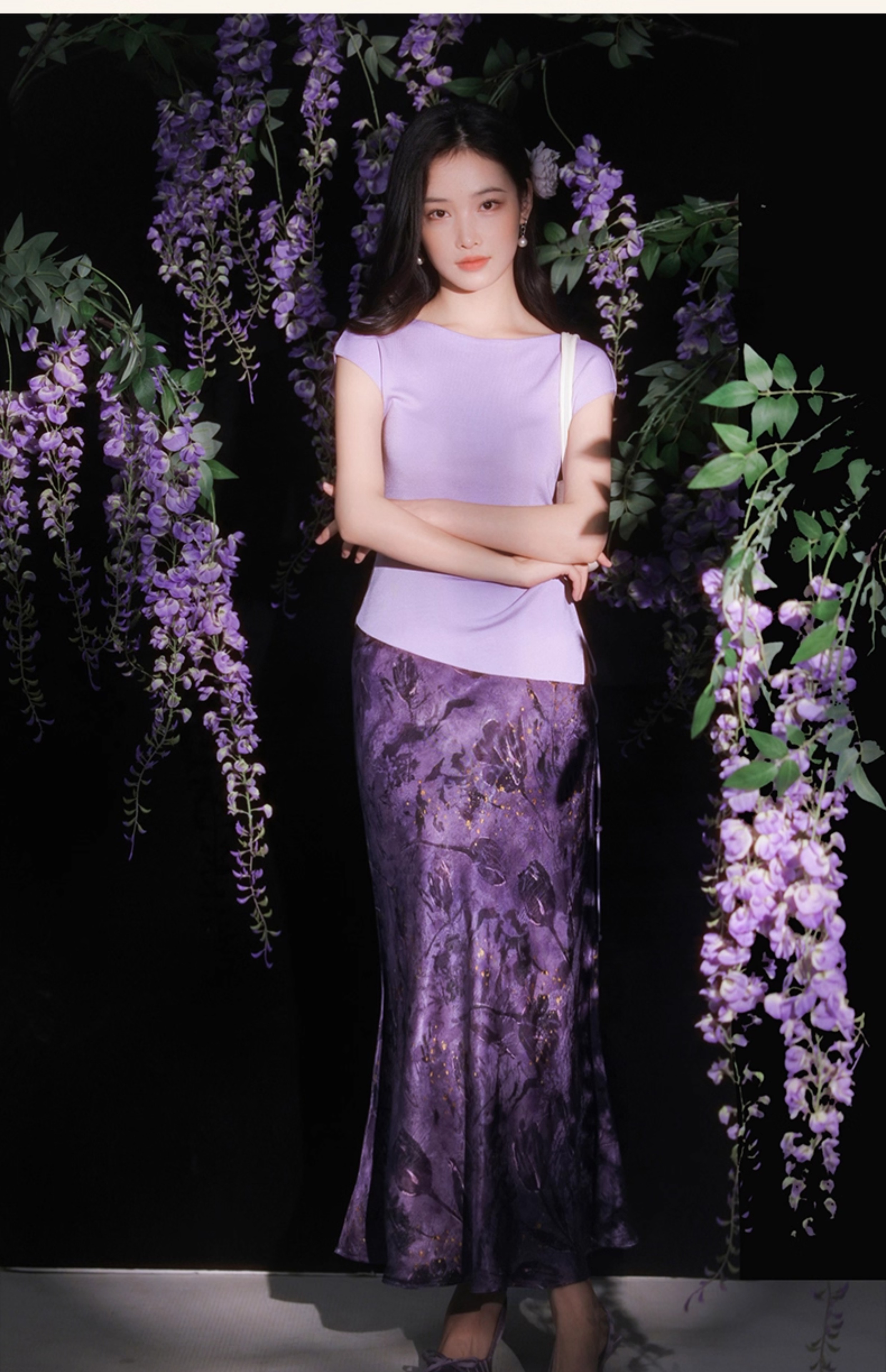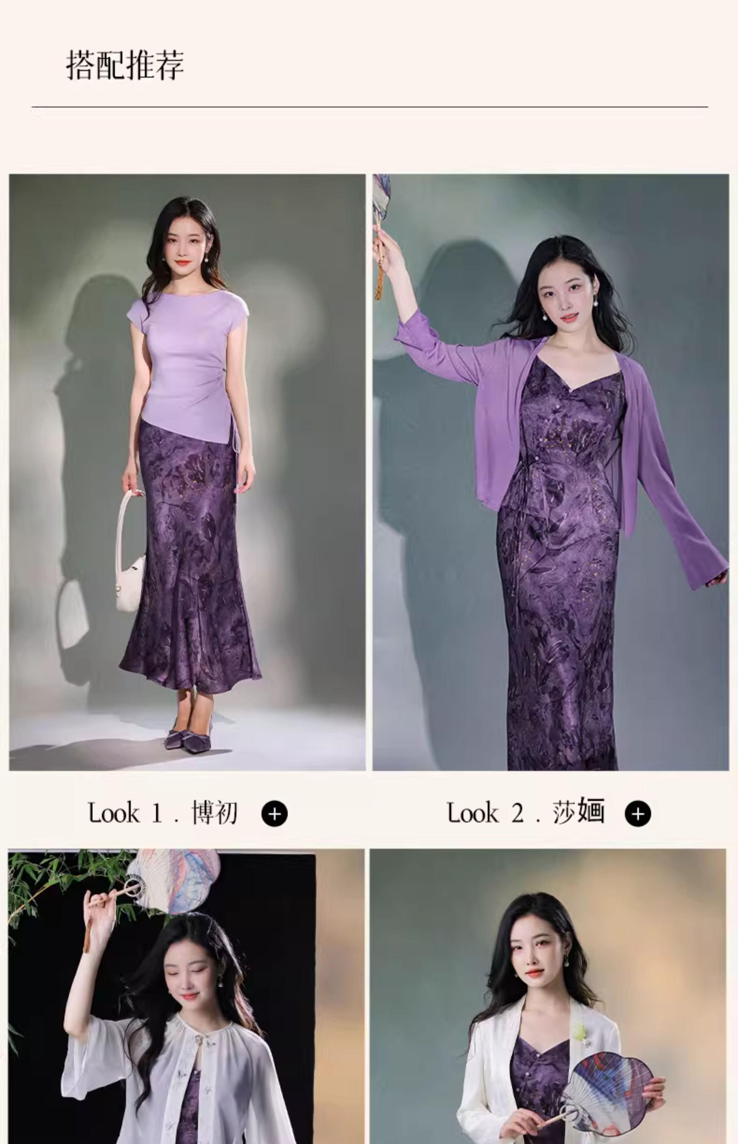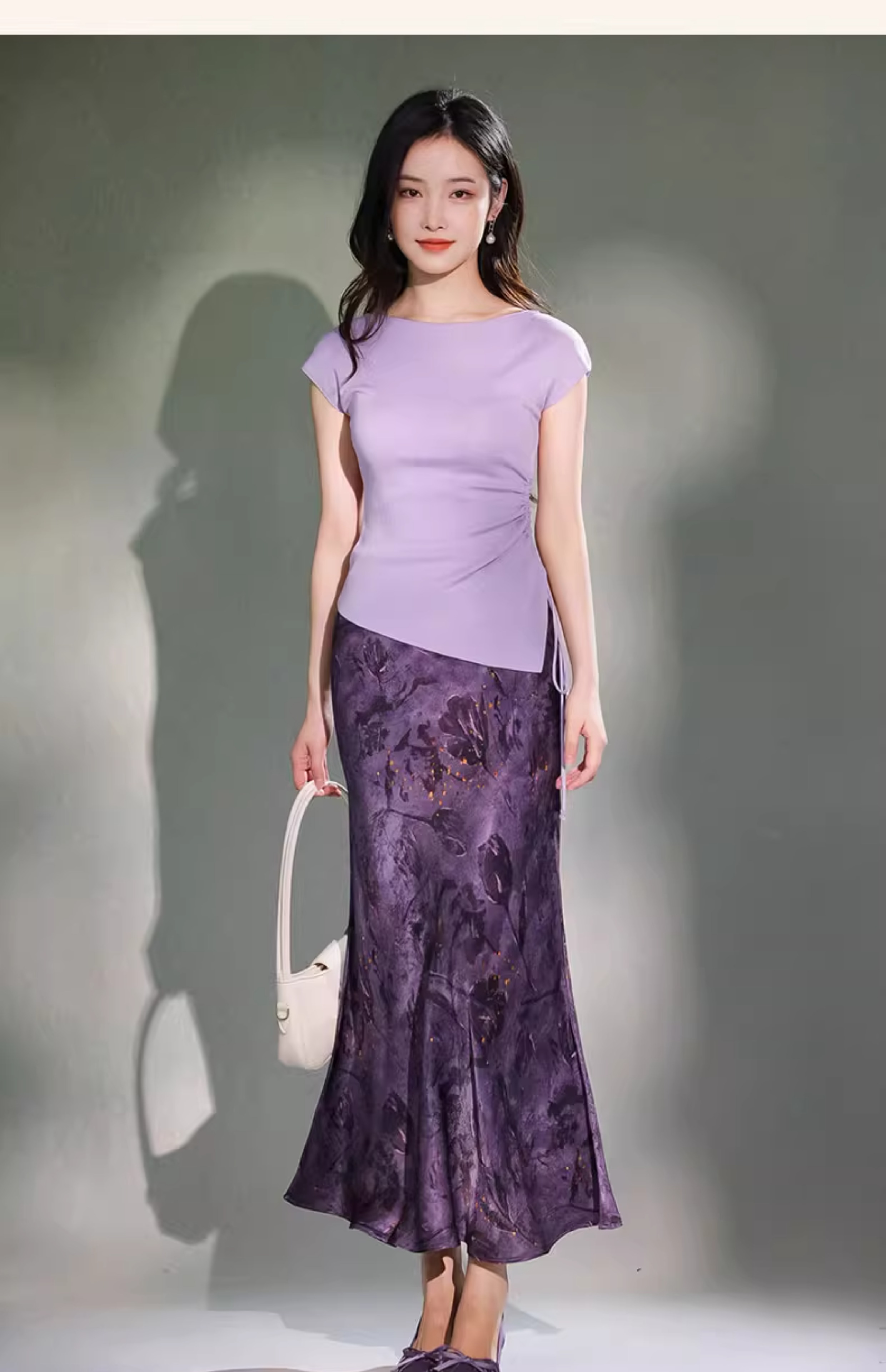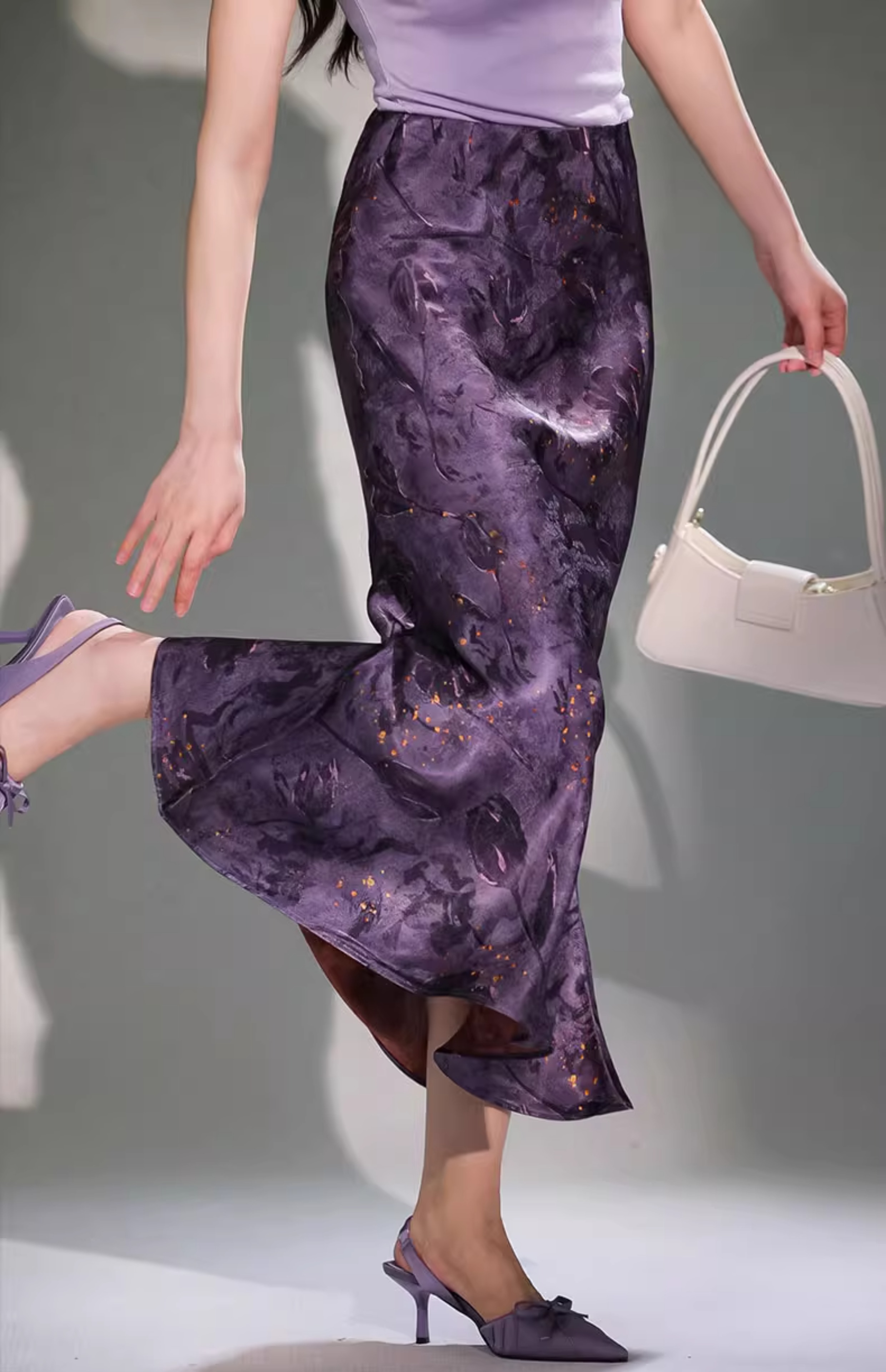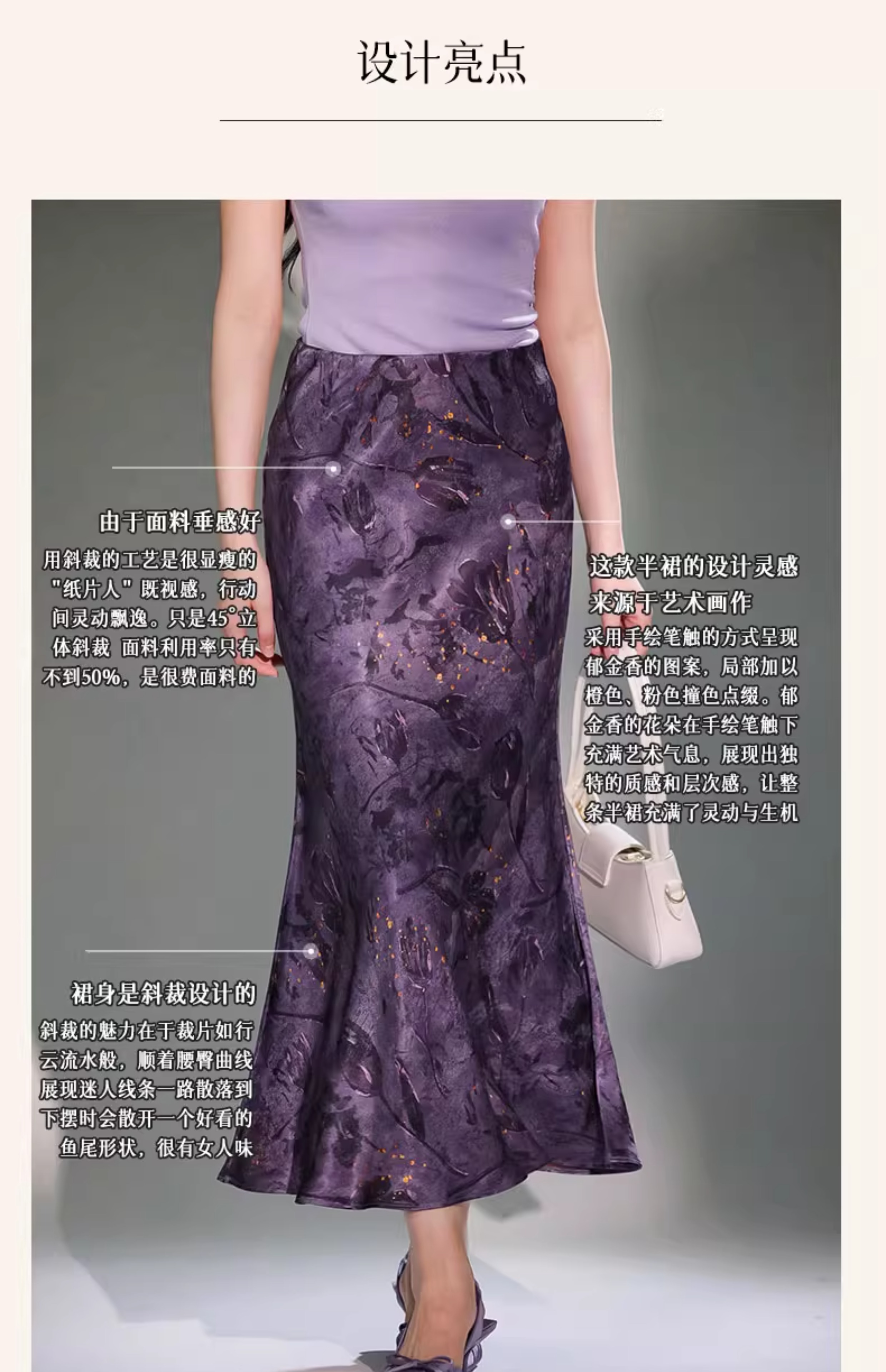 逸红颜紫姝2025夏新款冰感过莨工艺人丝松紧腰斜裁鱼尾半裙长裙女