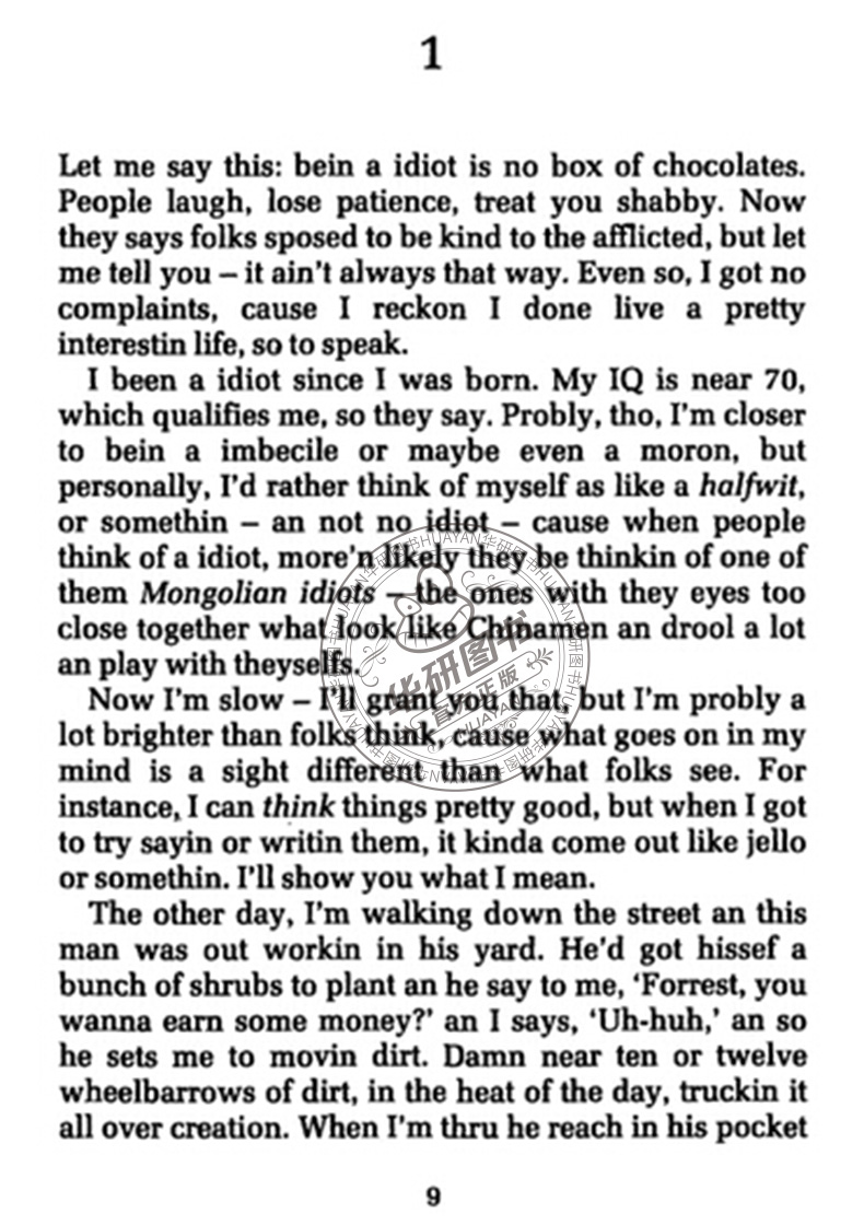 I been a idiot since I was born. My IQ is near 70, which qualifies me, so they say. Probly, tho, Im closer to bein a imbecile or maybe even a moron, but personally, Id rather think of mysef as like a halfwit, or somethin -- an not no idiot -- cause when people think of a idiot, moren likely they be thinkin of one of them Mongolian idiots -- the ones with they eyes too close together what look like Chinamen an drool a lot an play with theyselfs.