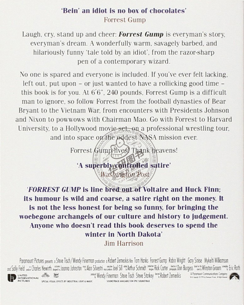 "Forrest Gump is line bred out of Voltaire and Huck Finn; its humour is wild and coarse, a satire right on the money. It is not the less honest for being so funny, for bringing the woebegone archangels of our culture and history to judgement. Anyone who doesnt read this book deserves to spend the winter in North Dakota"(Jim Harrison)