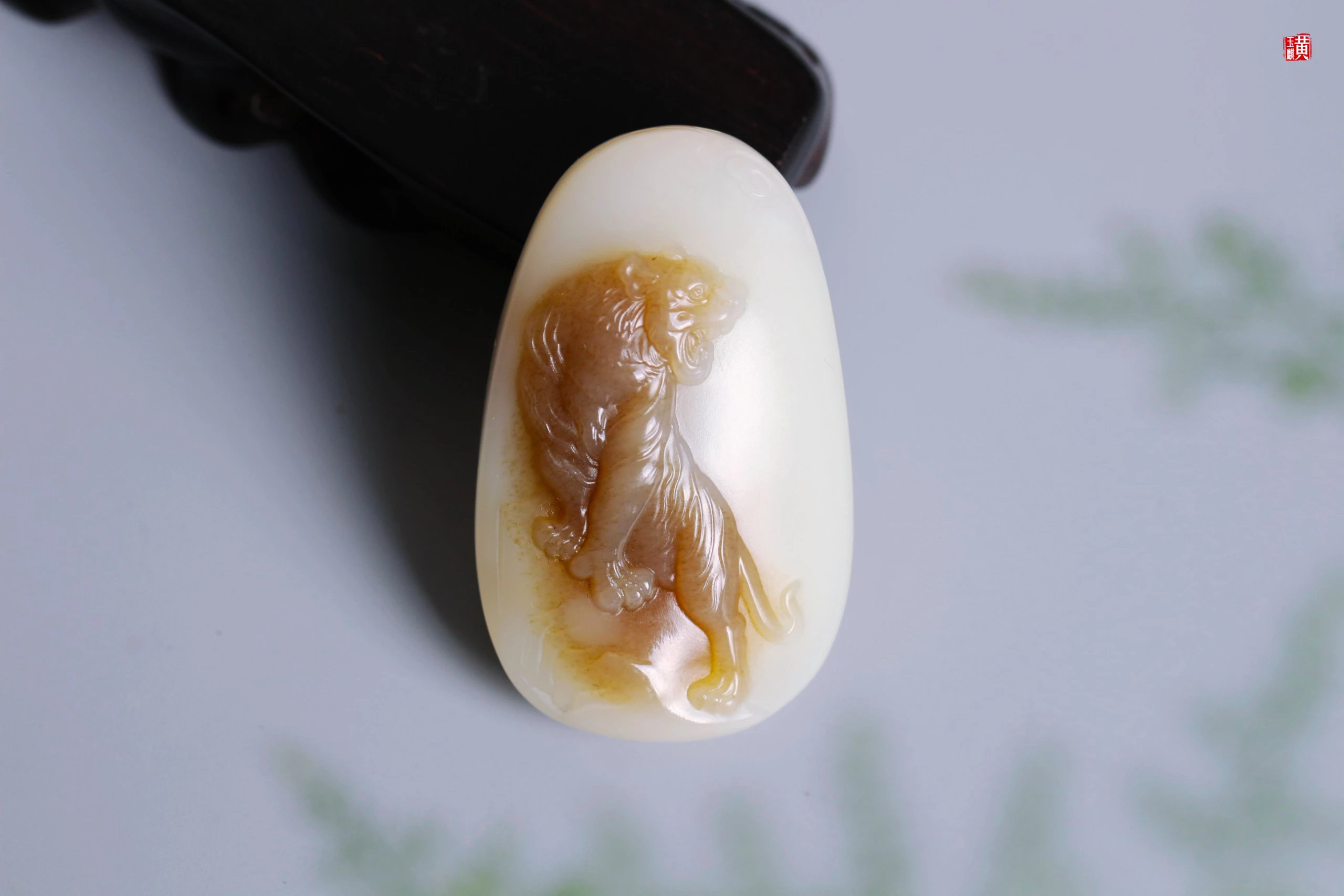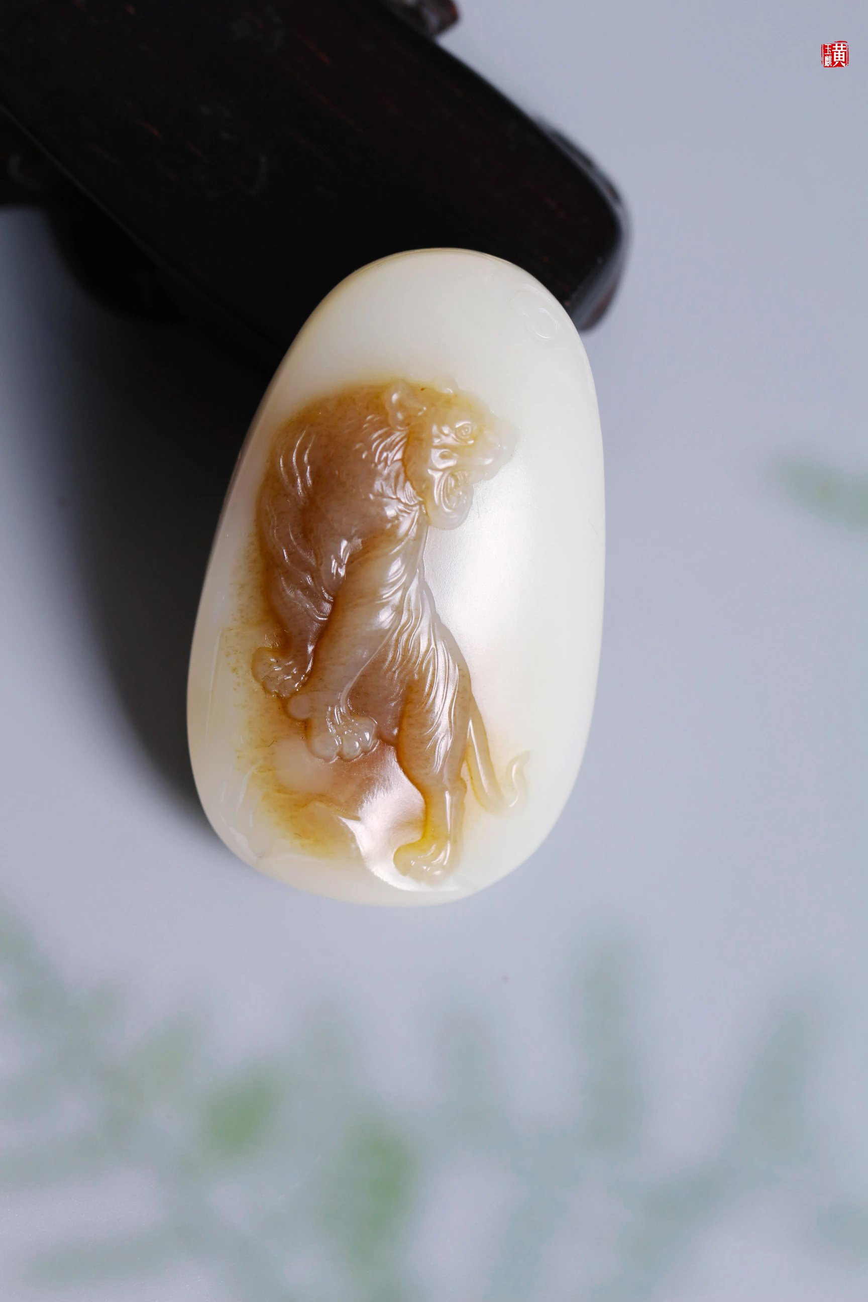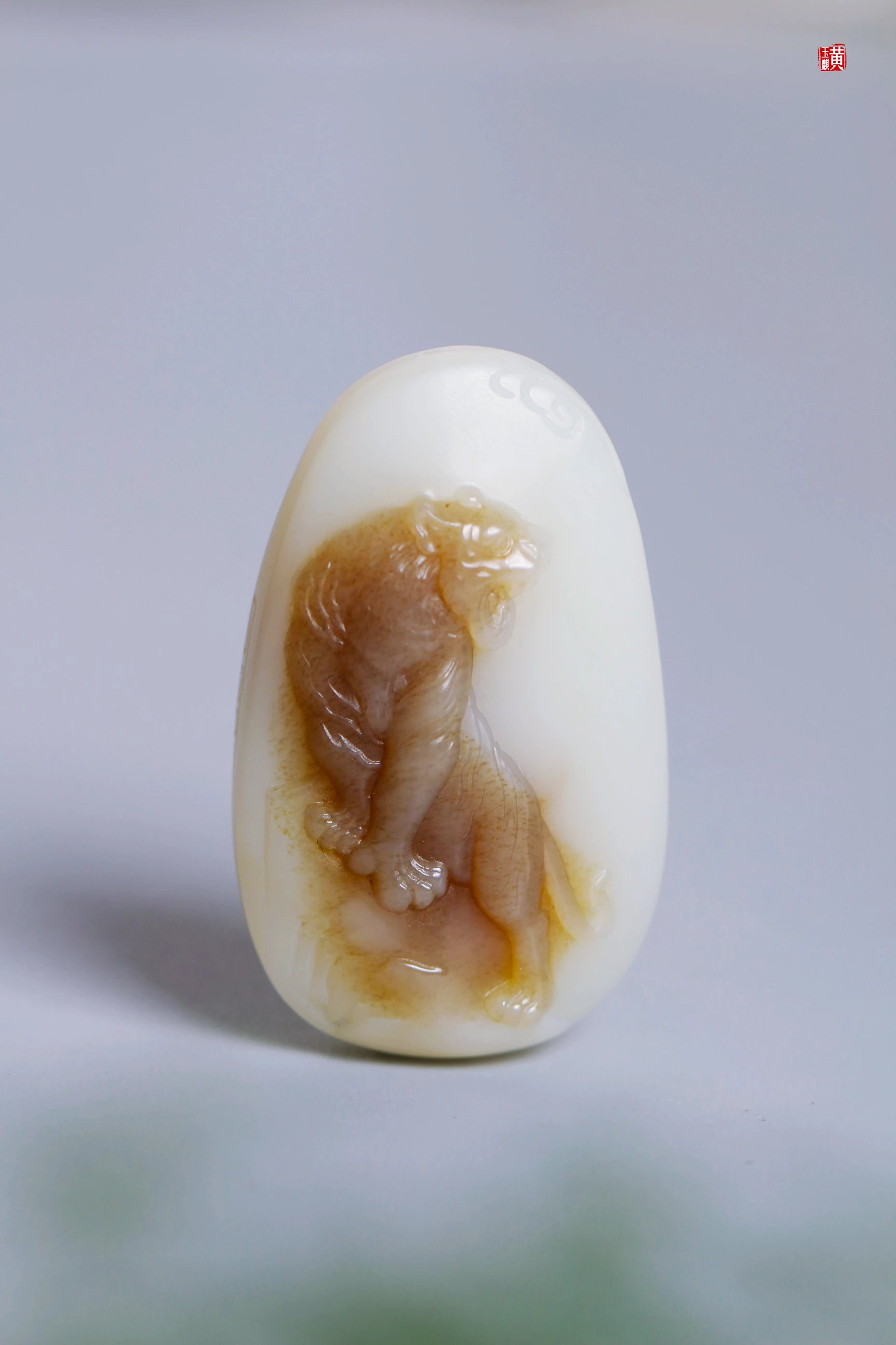 和田玉【上山虎】白玉俏糖色,配精美挂绳赠证书重:43.96g尺寸:52.3*31.9*14.4mm