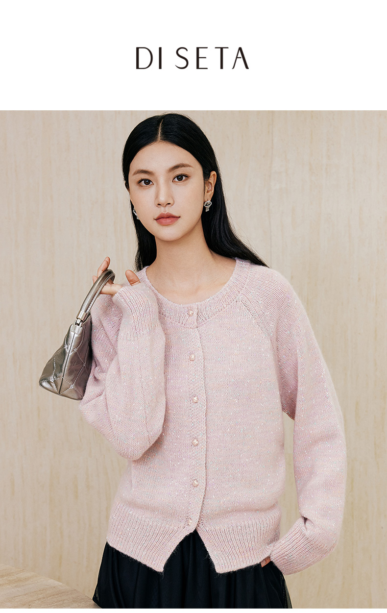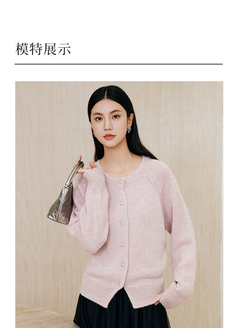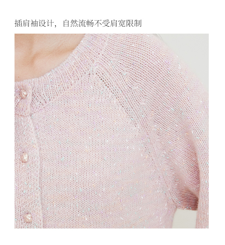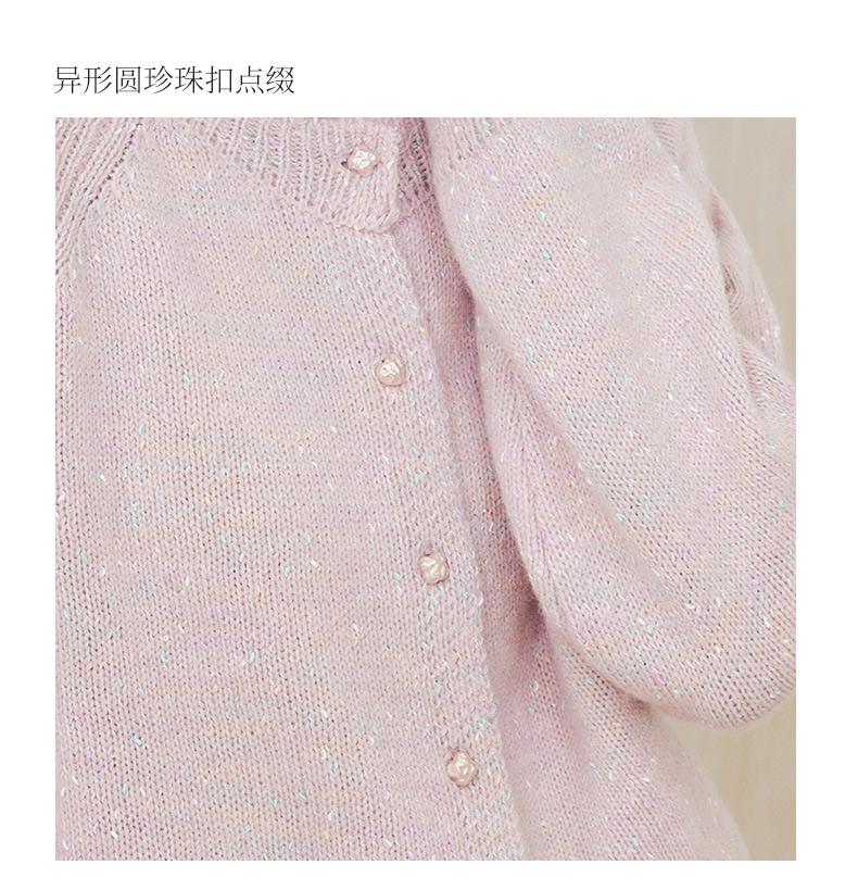 玳莎彩点花纱圆领针织开衫女2024年冬季新款时尚粉色插肩袖上衣 ED33306