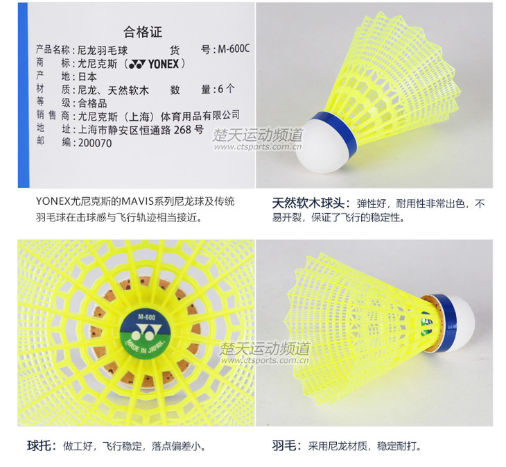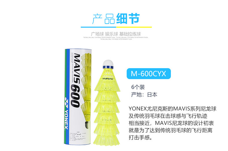尤尼克斯YONEX M-600 羽毛球 尼龙球 天然软木球头 稳定耐打 6只装