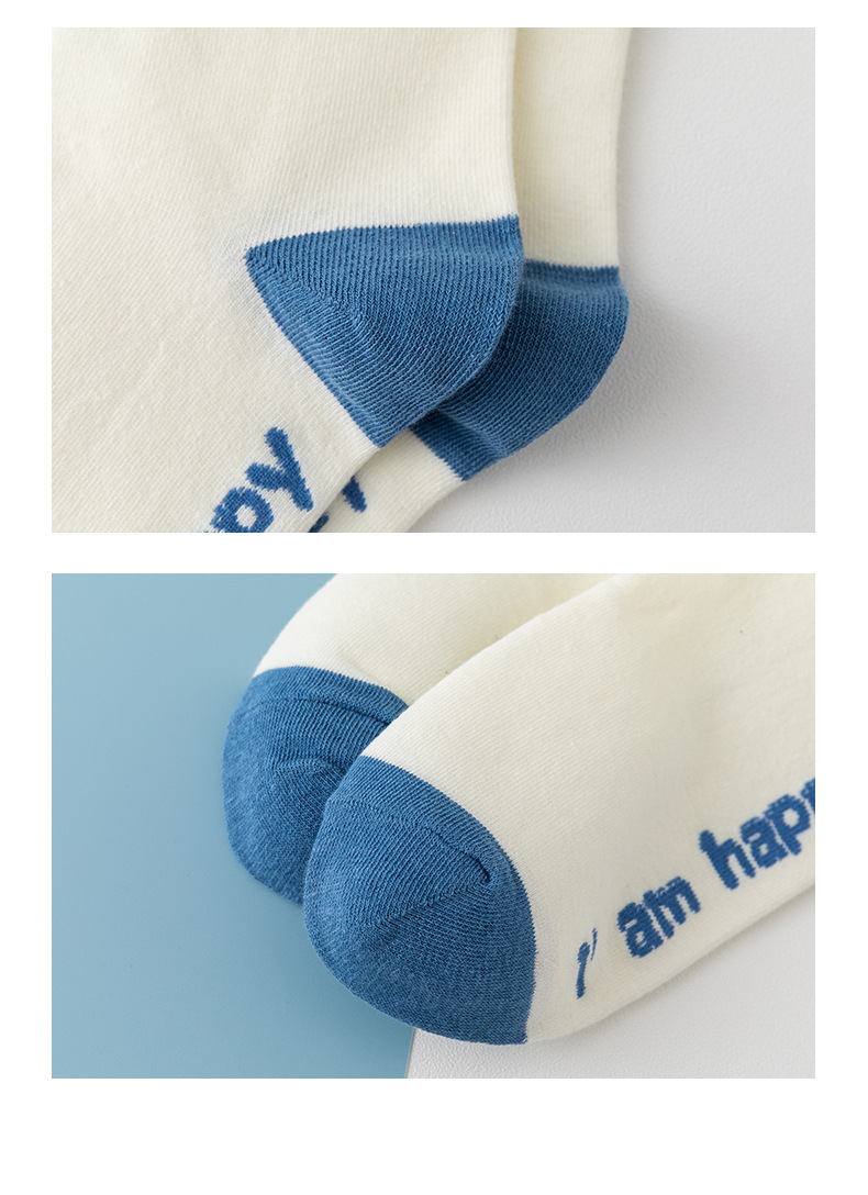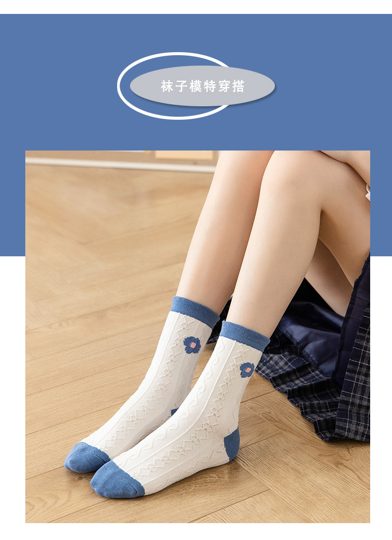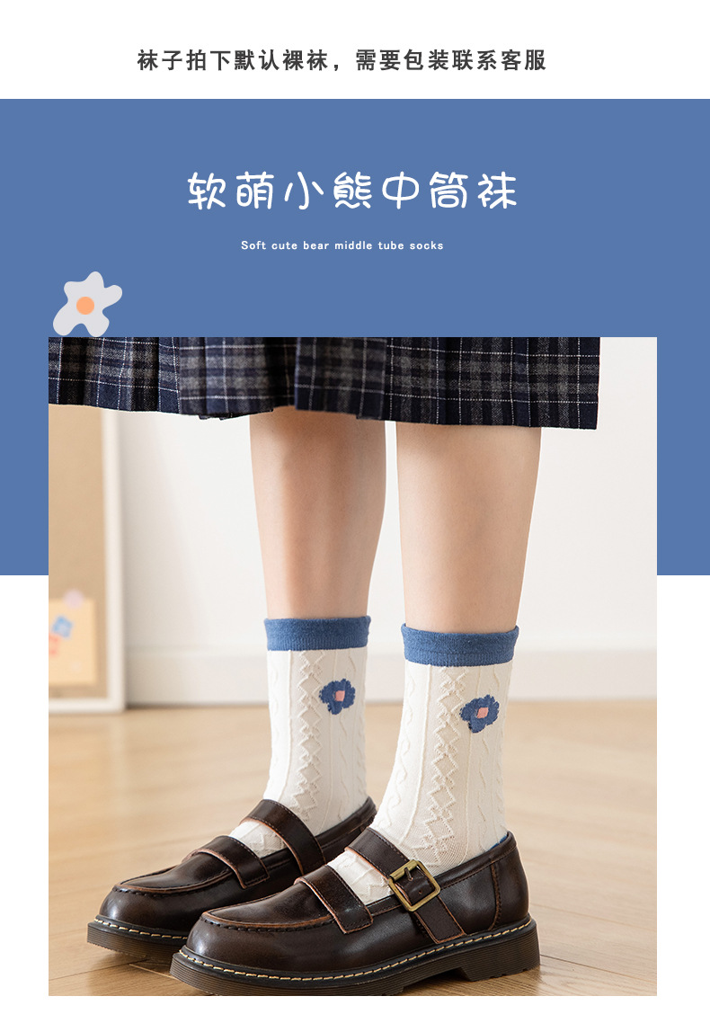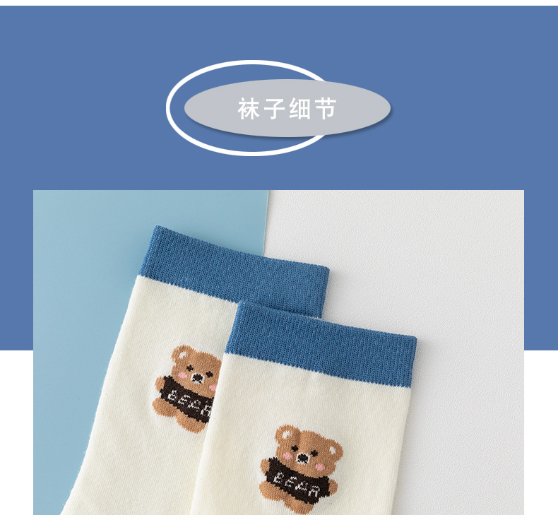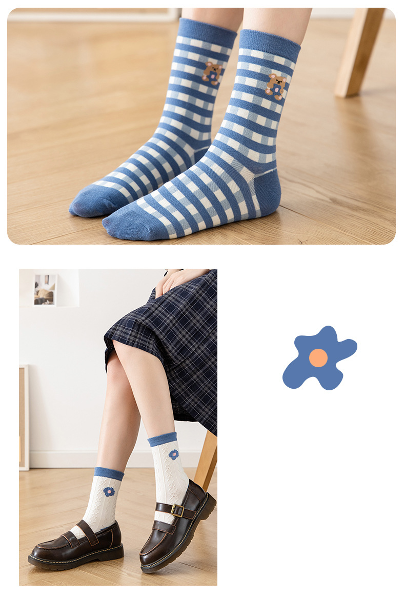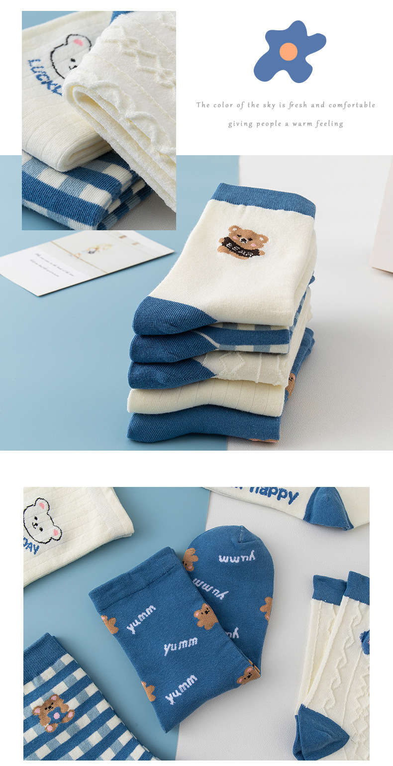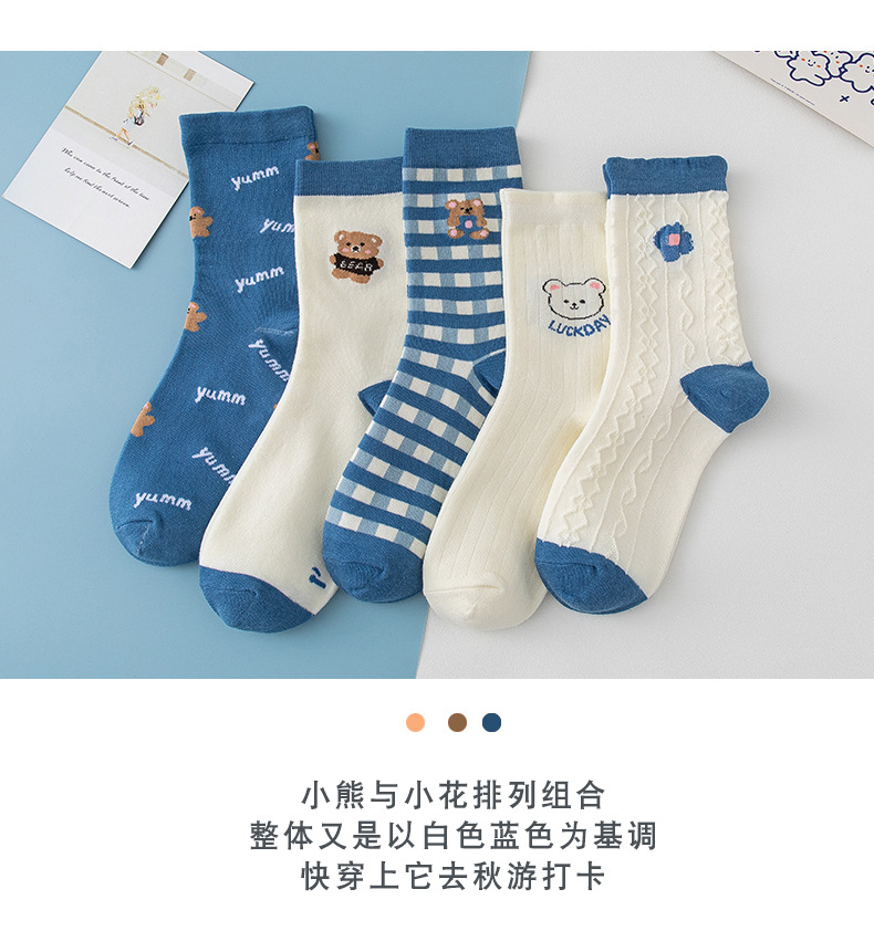 【5双装】秋冬新款袜子女士中筒袜蓝色小熊学院风长筒袜精梳棉日系潮流袜子