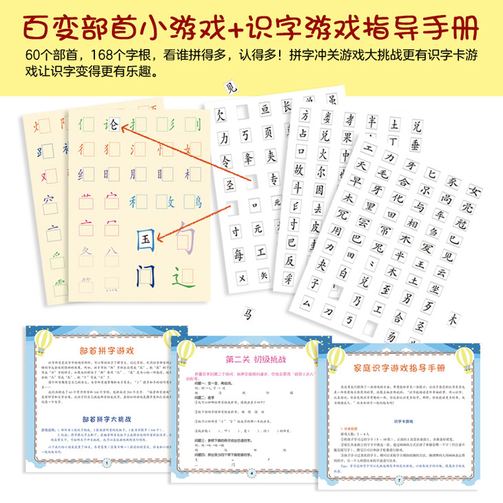 《学前识字快读800字快乐学习礼盒装》学习盒子包括4册识字快读800字,40大张学习字卡,4册练习册,1册一笔一画写汉字,1张拼读表,1套部首游戏卡(5张卡纸),1册游戏指导手册。《识字快读800字》(全4册)采取了将汉字融入到故事中,让幼儿在具体的语言环境中,自然地去进行识字和阅读.字形逐册变化,从简单到复杂。通过4册学习后,可掌握800左右生字,2000词汇,可阅读300字左右短文,帮助孩子从幼儿园顺利过渡到小学。第一册在编排上采取字、词、儿童诗、小故事等内容形式,后面还有国学内容的引入,从激发兴趣入手,让孩子在环境变化后灵活识字。这样的设置循序渐进,可以帮助孩子轻松快乐地进行阅读和学习。第二册从编排上重点突出生活常用字,在民俗传统节日、民间谚语、百家姓等有趣的设计中识字认字。方式多样、形式有趣,孩子在识字的同时还可以积累古诗、了解民族传统文化的相关知识。第三册从编排上重点突出成语识字,字不离词,词不离句,识字认词,出口成章。孩子在识字的同时积累成语,了解成语故事,为之后的分层阅读打下坚实的基础。第四册从编排上重点借助古诗文来识字。识字不离情景,在情境中认识字,了解字的意思,学会运用字,这是为更广泛的阅读做好铺垫。本套书重在识字中接触国学知识,丰厚积淀,激发爱国情怀。